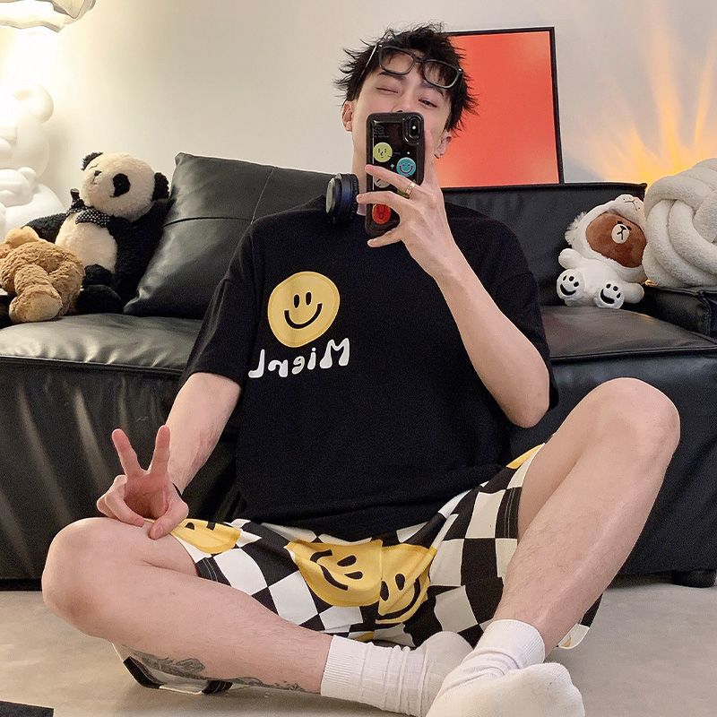 여름 잠옷 남자 반팔 반바지 얇은 십대 만화 느슨한 편안한 외부 착용 홈 의류 세트