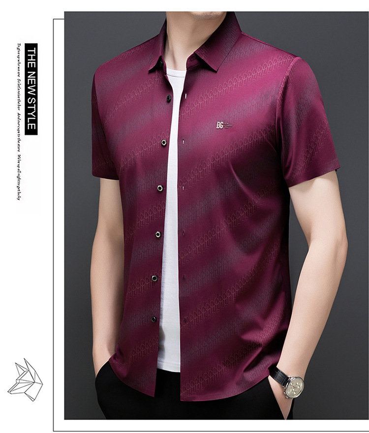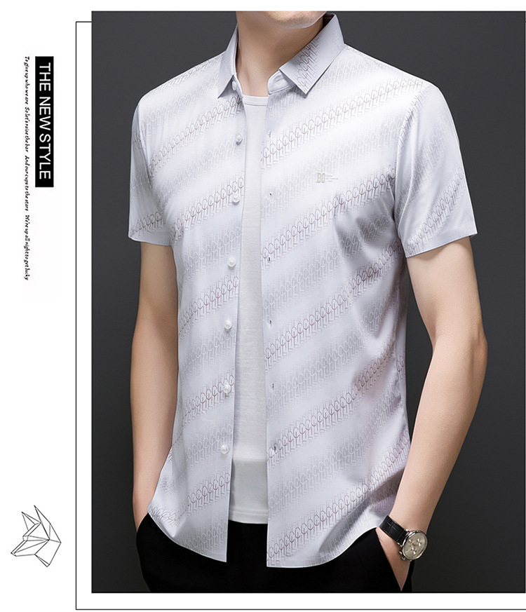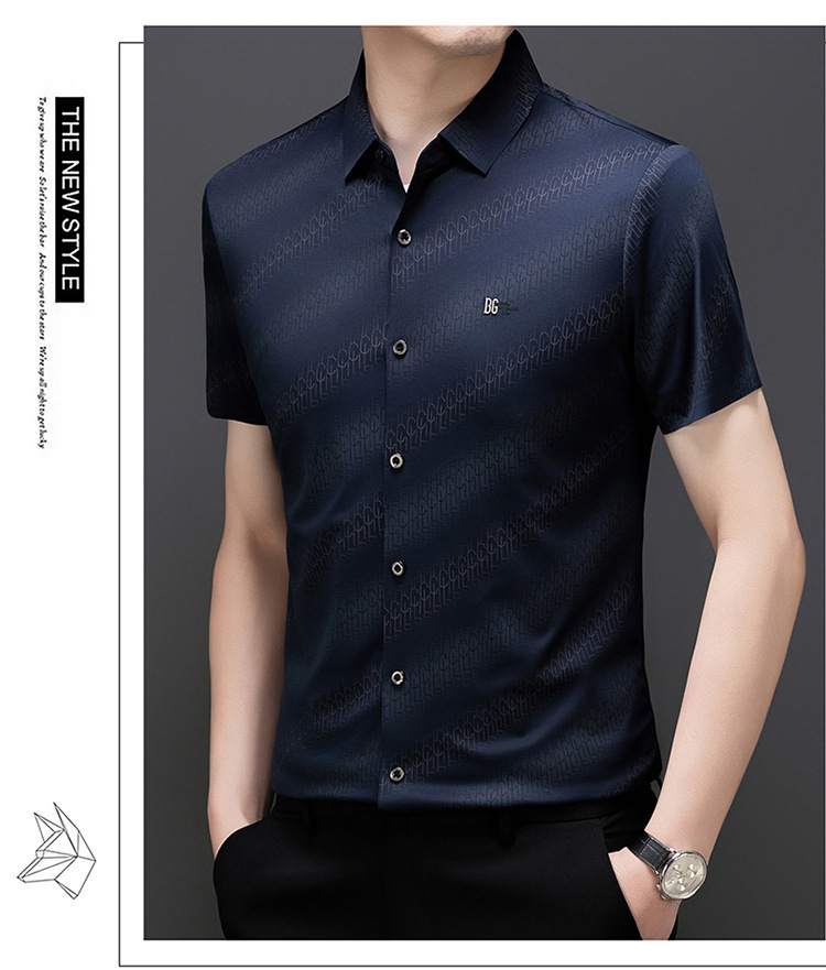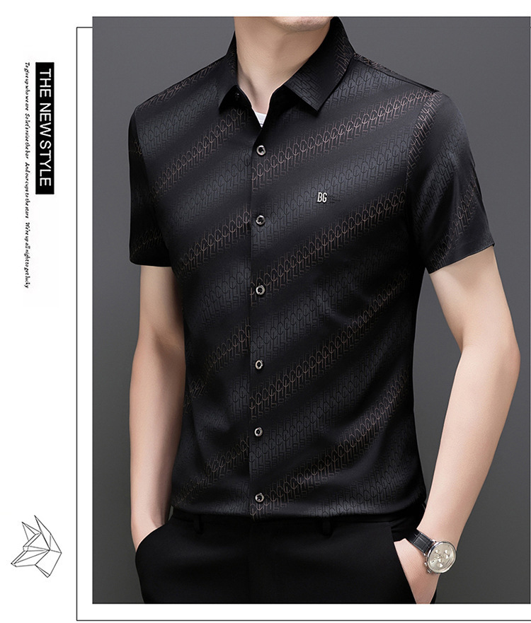 라이트 럭셔리 정통 2025 여름 남성 아이스 실크 셔츠 비즈니스 캐주얼 스트라이프 다목적 중년 옷깃 하이 엔드 셔츠