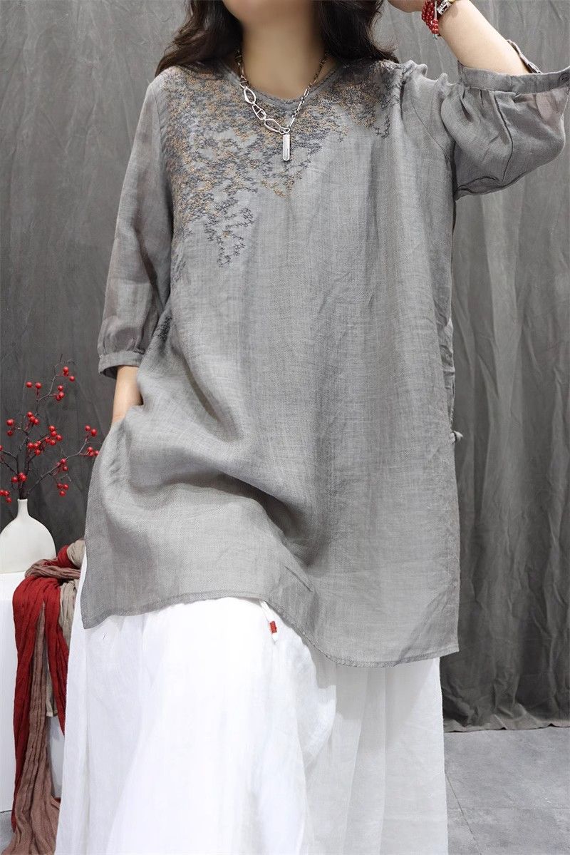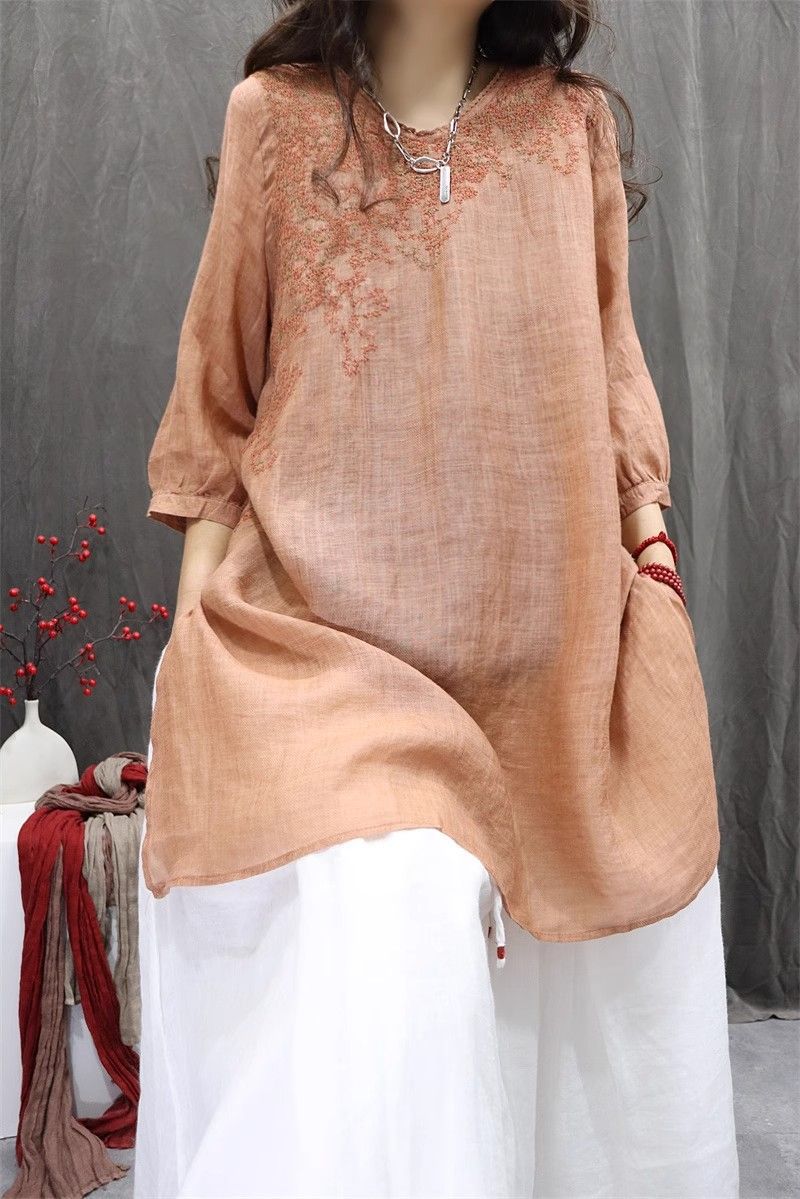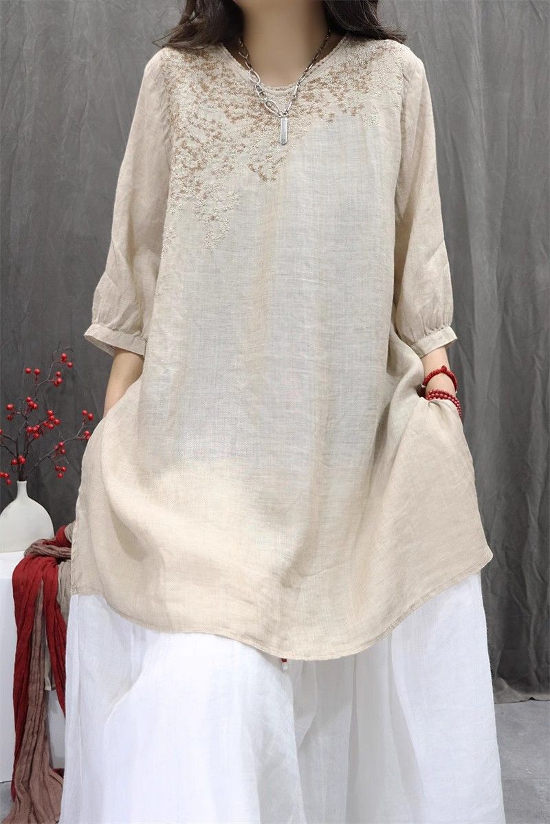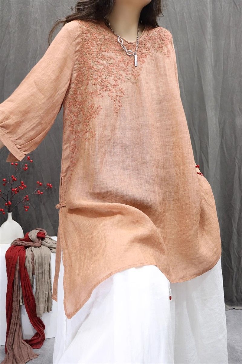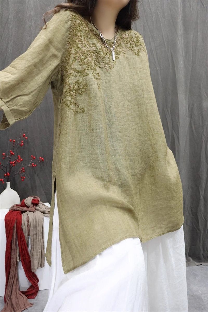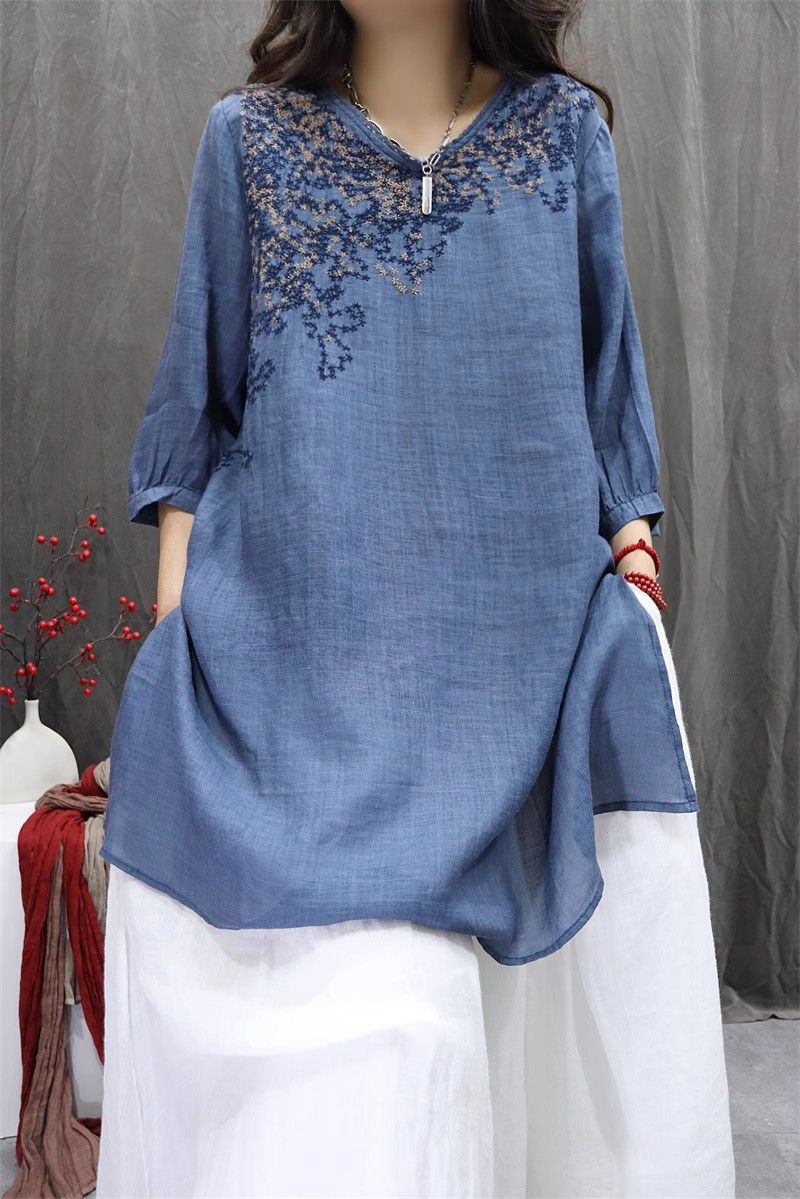 2025 봄 여름 새로운 복고풍 자수 티셔츠 루즈 슬리밍 예술적 캐주얼 중간 길이 탑 여성 민족 스타일