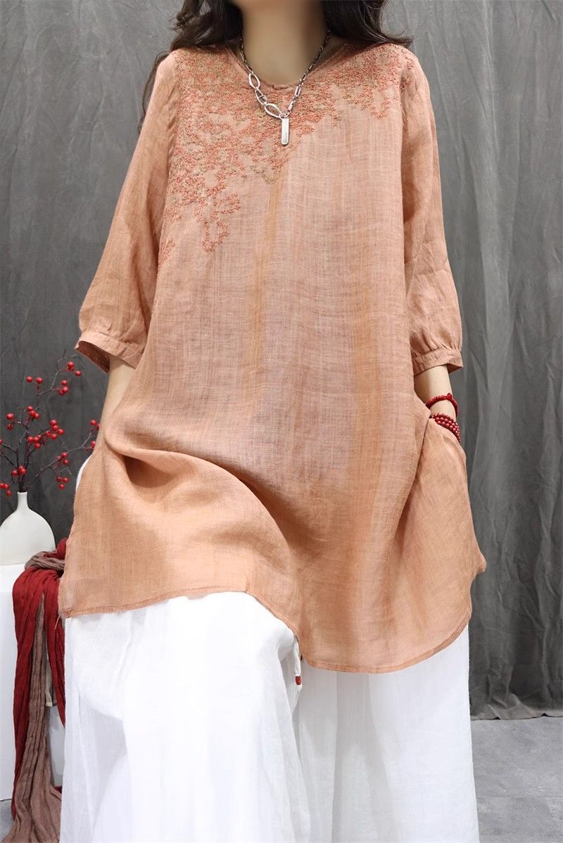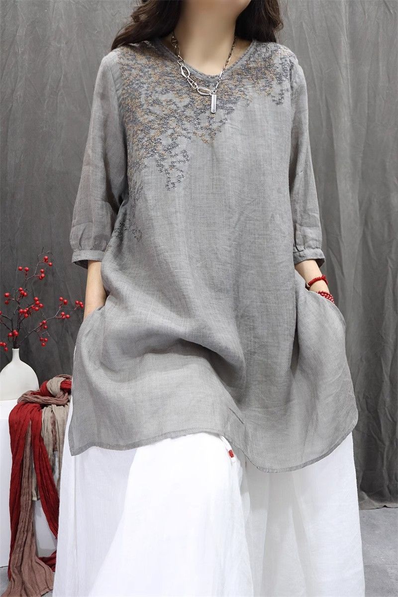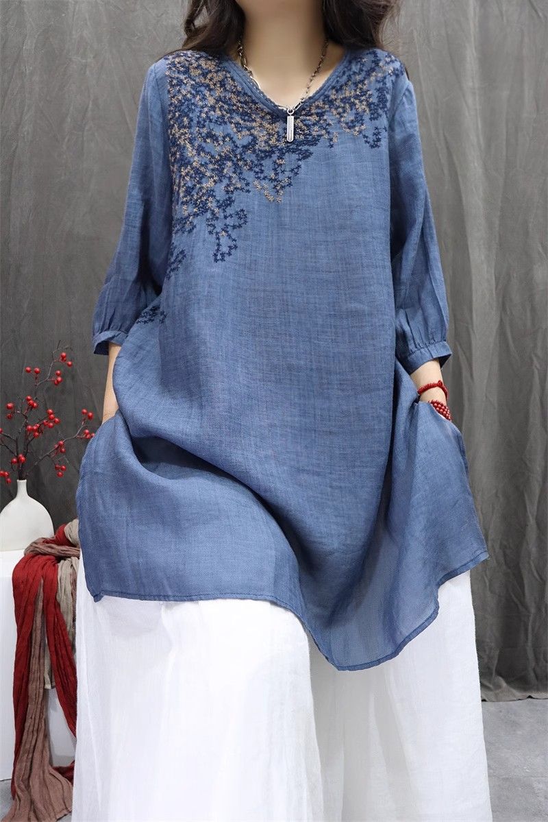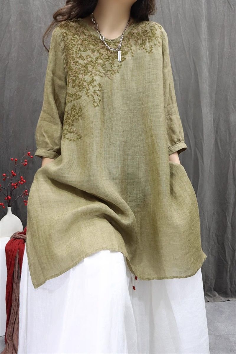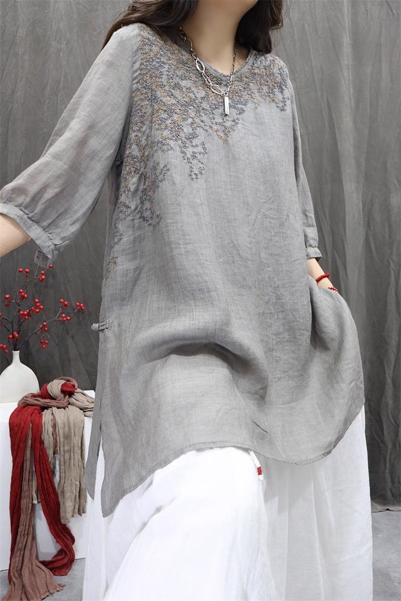 2025 봄 여름 새로운 복고풍 자수 티셔츠 루즈 슬리밍 예술적 캐주얼 중간 길이 탑 여성 민족 스타일