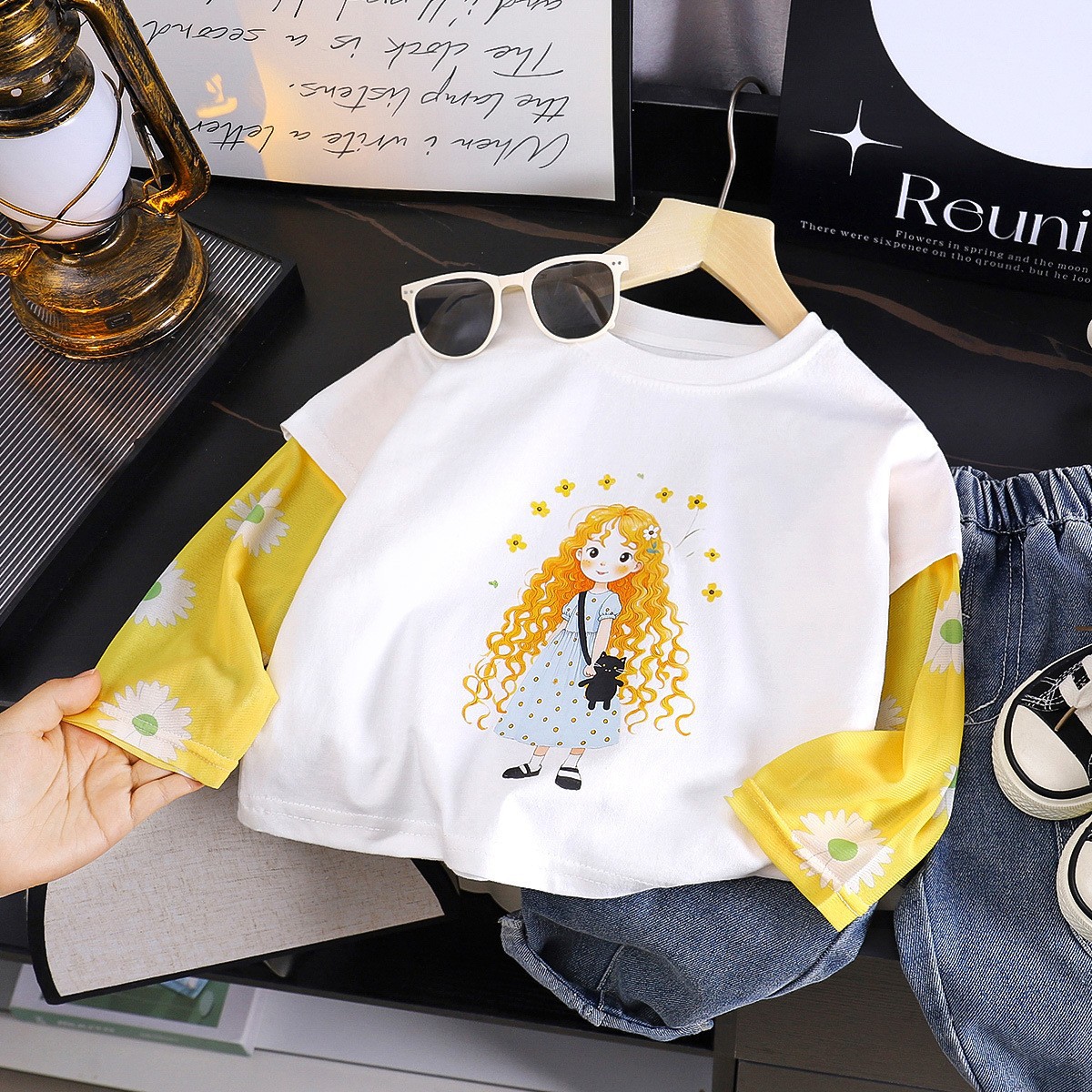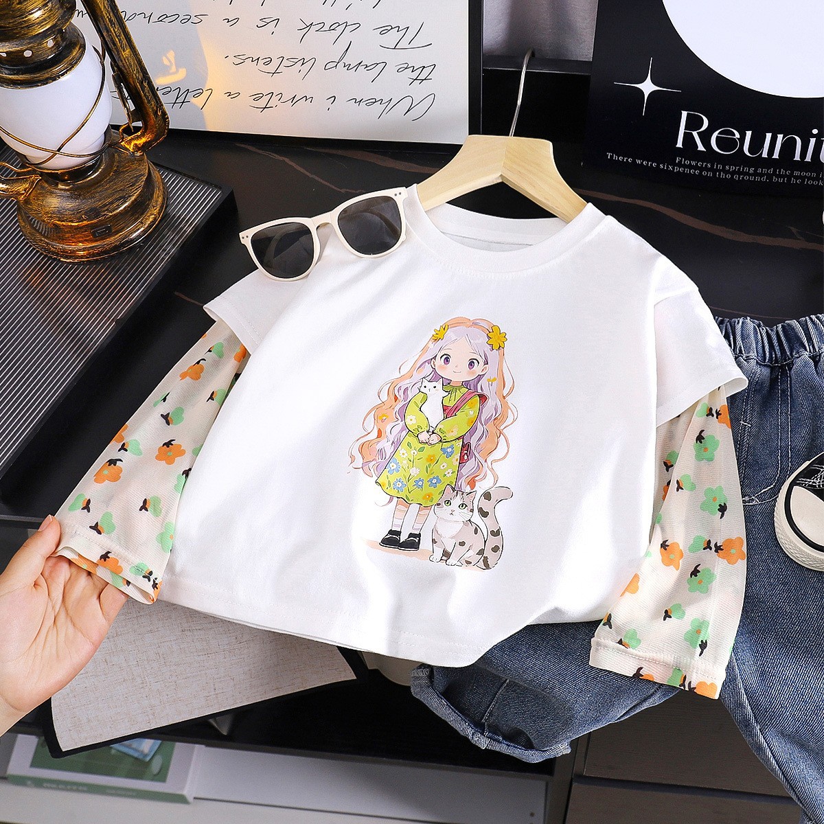 여자 티셔츠 여름 새 여자 태양 보호 슬리브 탑 아기 유행 2025 여름 옷 접합 아동 의류 도매스토어 가기