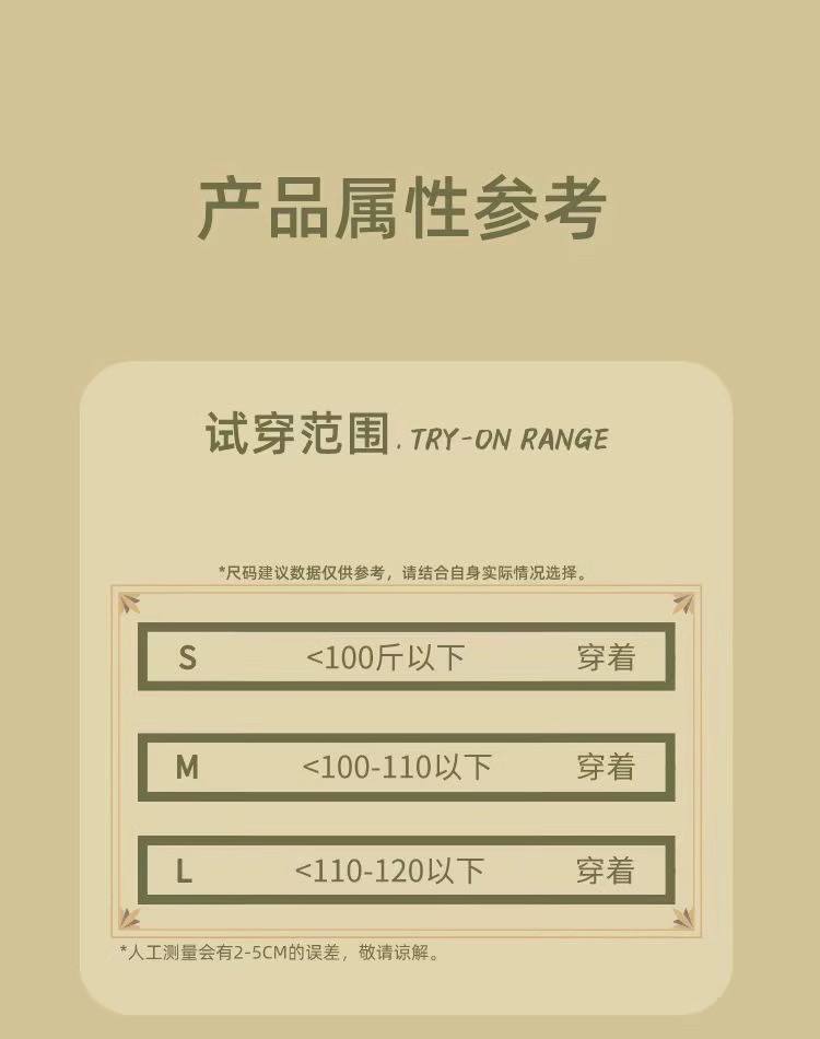 因裁剪工艺和丈量手法不同,可能存在1~3CM 左右误差,尺码仅供参考,以实物为准