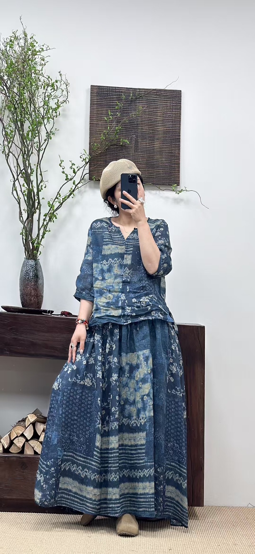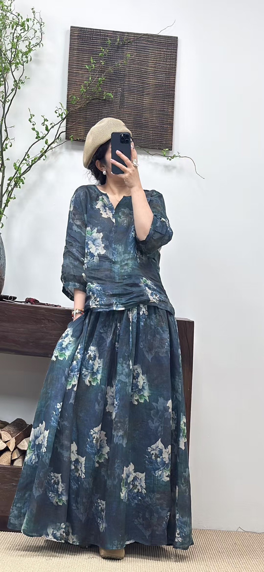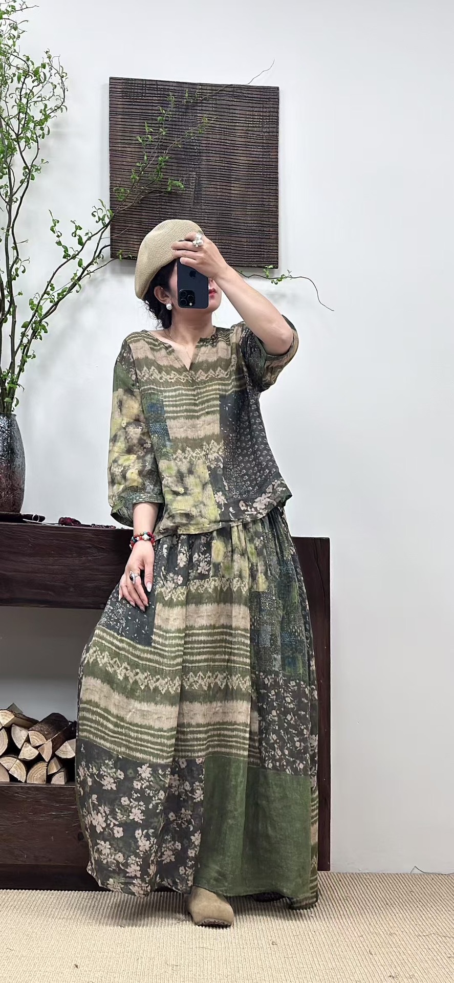 2025 여름 새 스타일 작은 V 넥 7 점 소매 티셔츠 느슨한 허리 대형 스윙 스커트 바느질 우아한 세트 여성스토어 가기