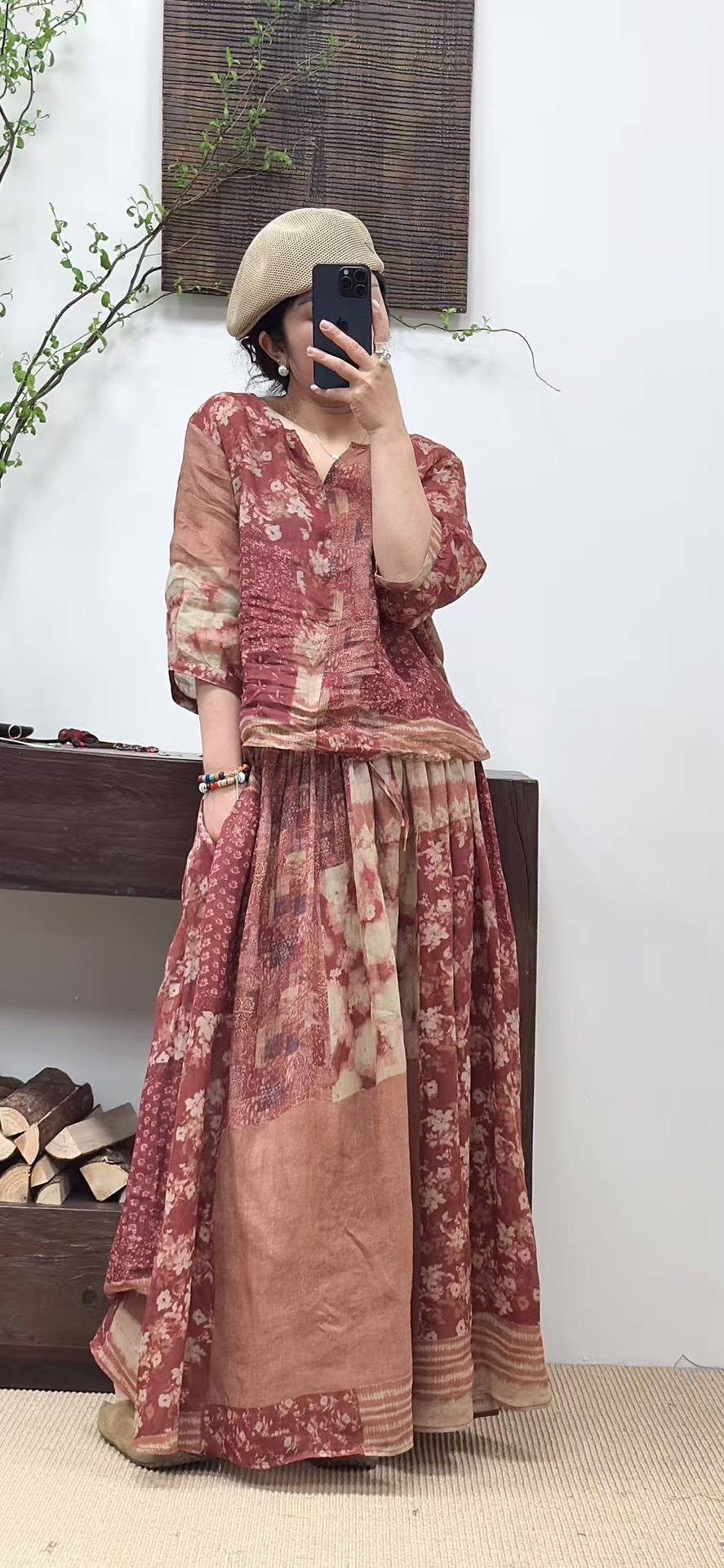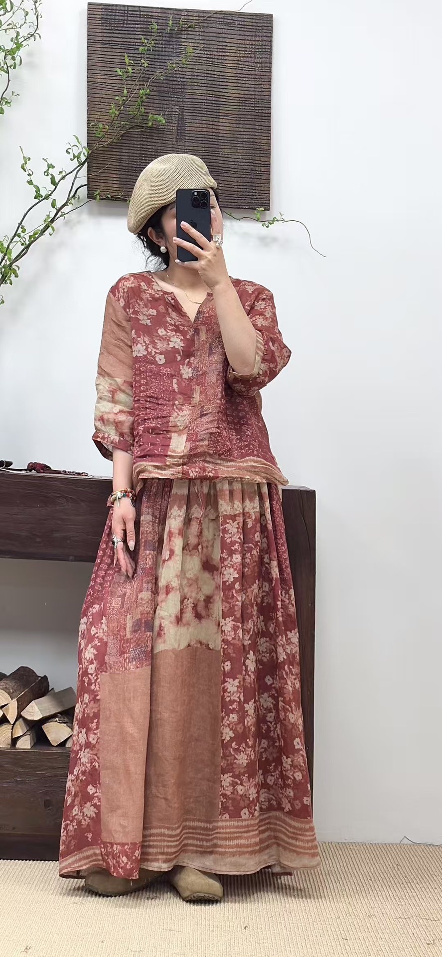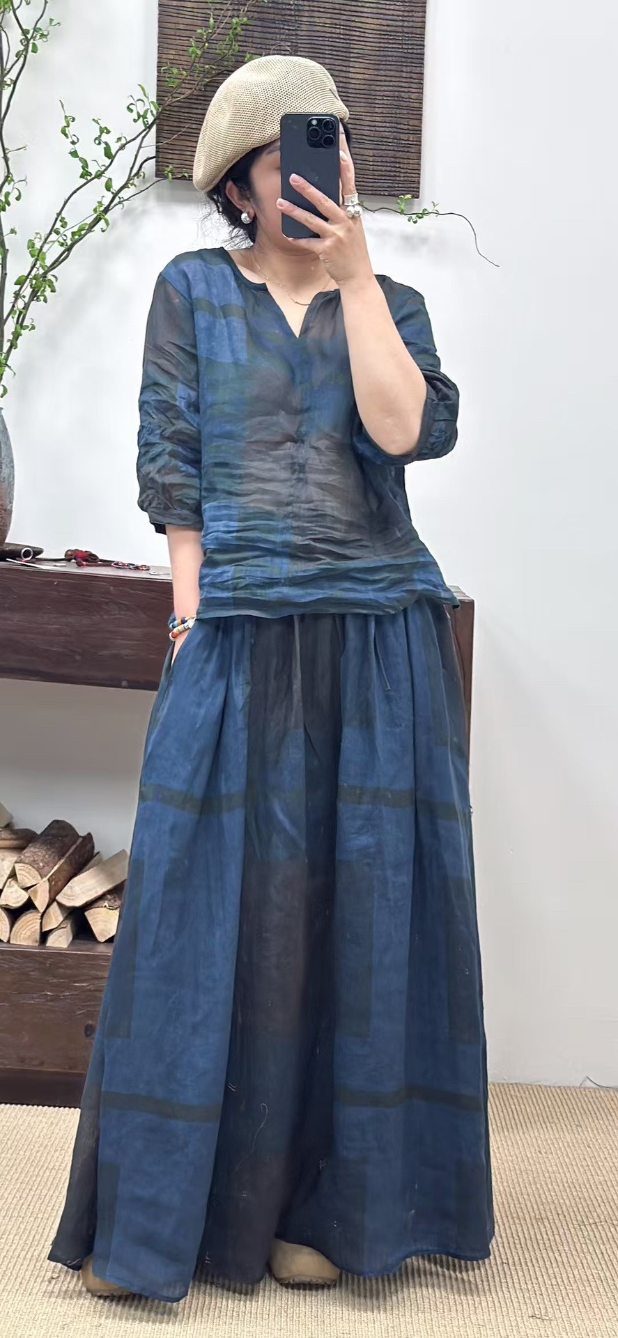 2025 여름 새 스타일 작은 V 넥 7 점 소매 티셔츠 느슨한 허리 대형 스윙 스커트 바느질 우아한 세트 여성스토어 가기