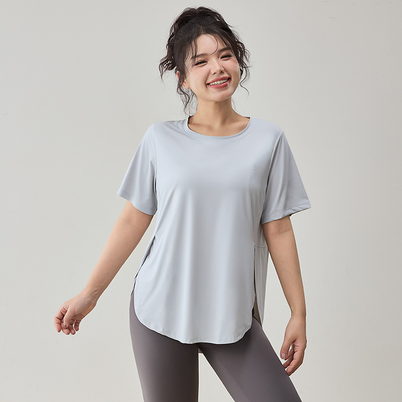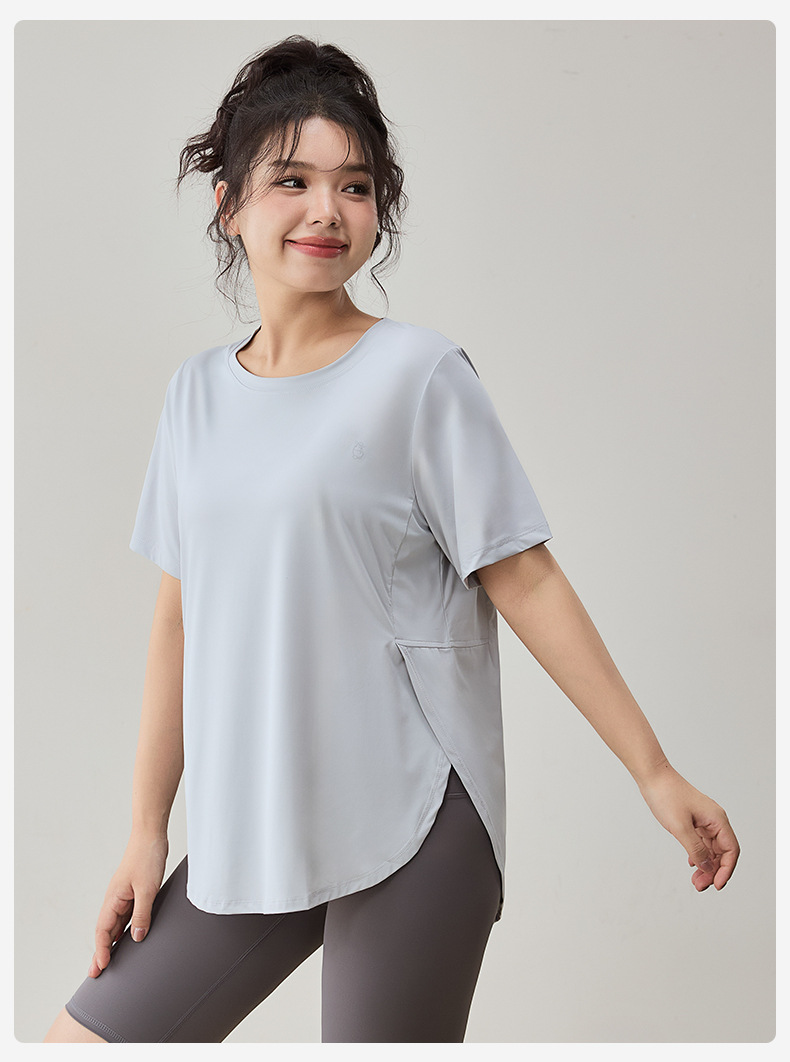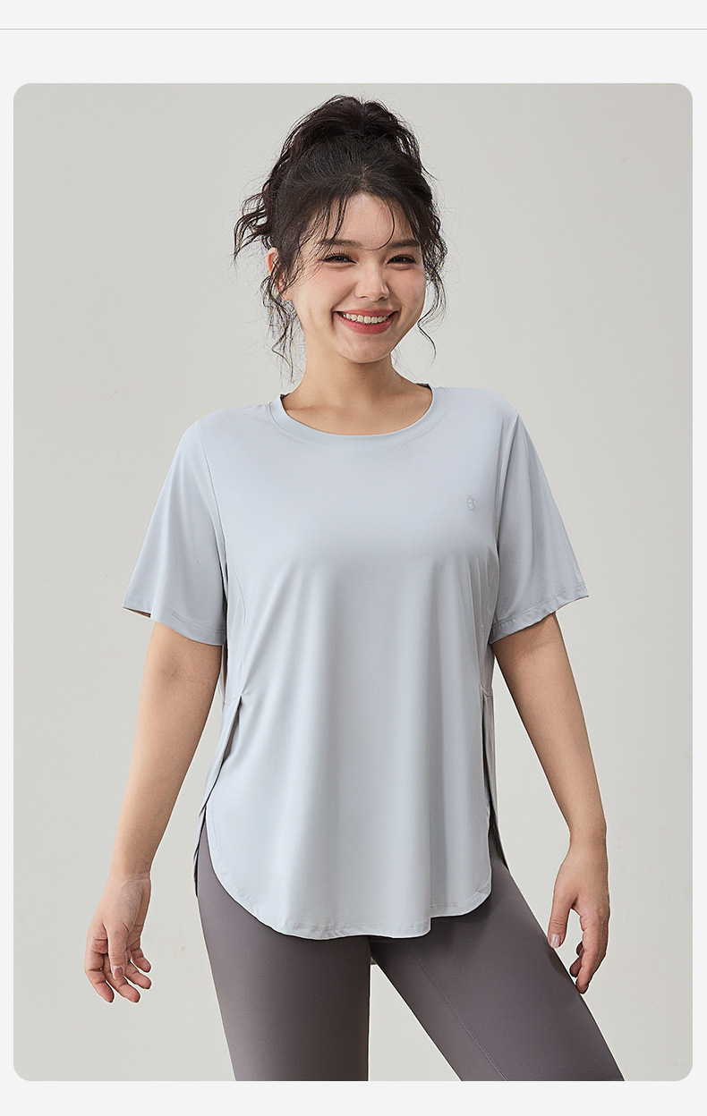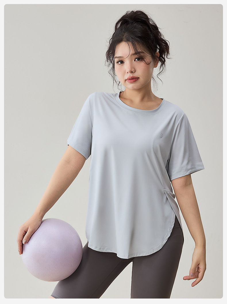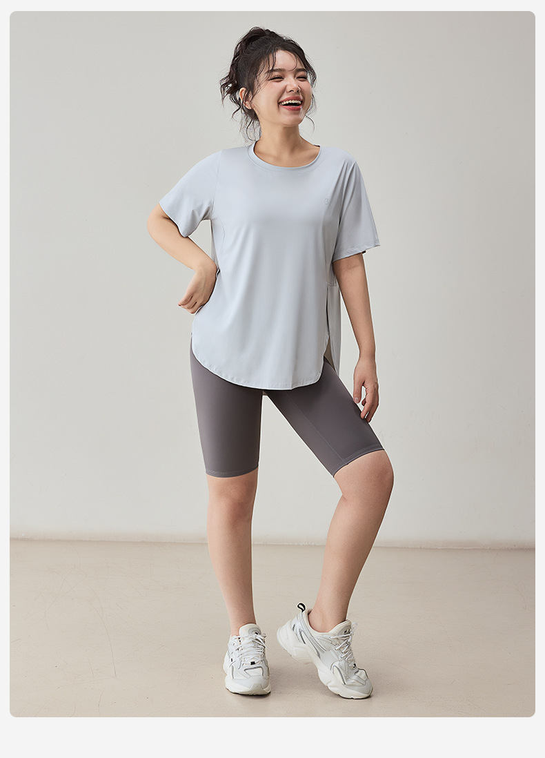 플러스 사이즈 스포츠 티셔츠 여성용 느슨한 슬리밍 알몸 요가 의류 통통녀 통기성 빠른 건조 피트니스 훈련 짧은 소매