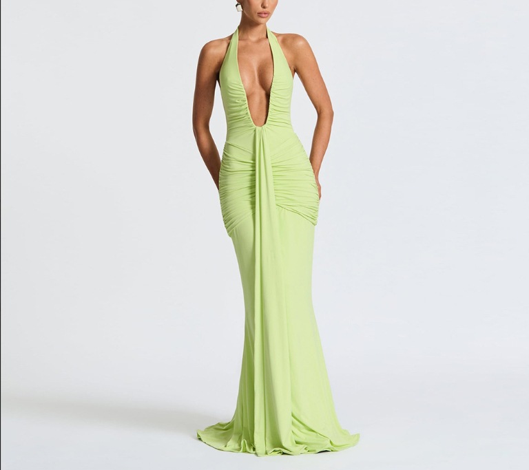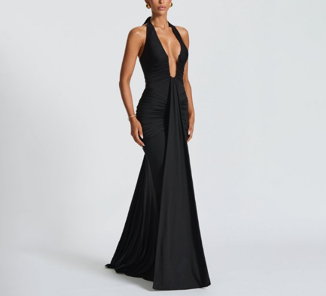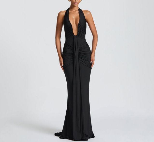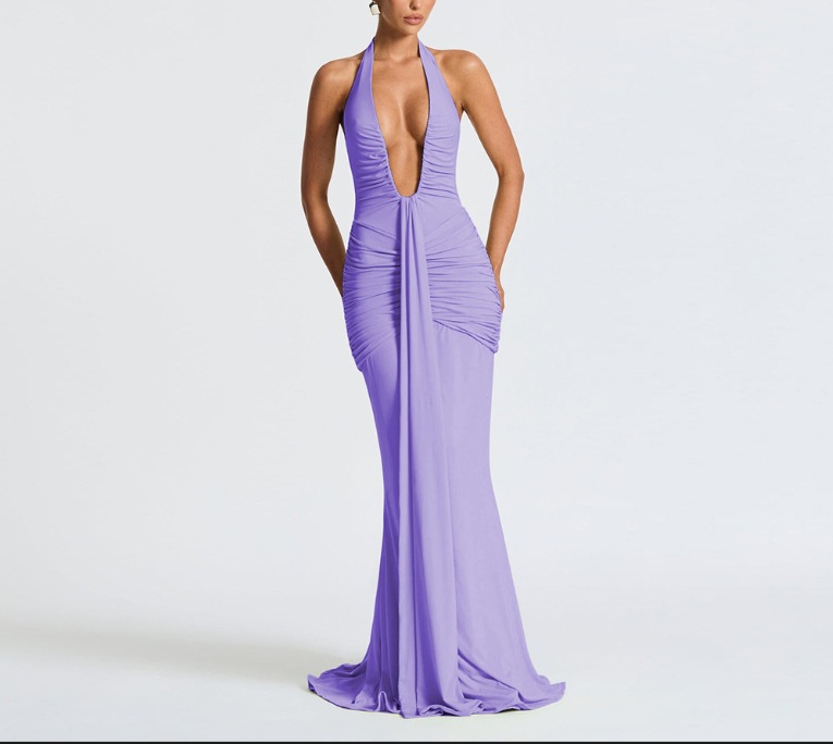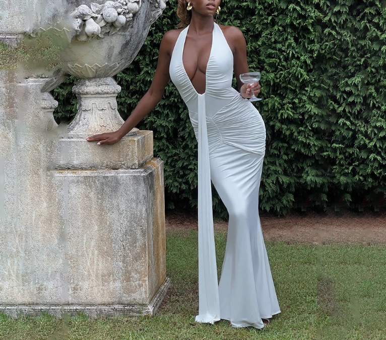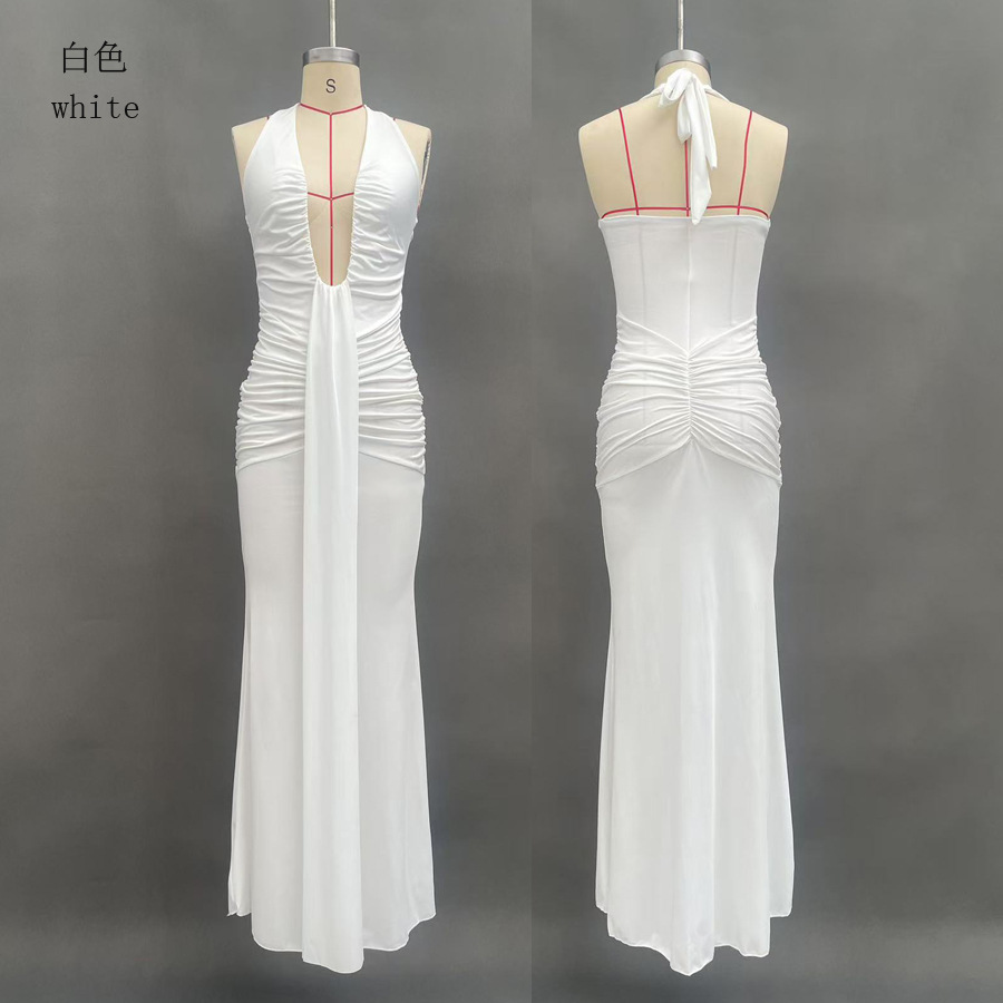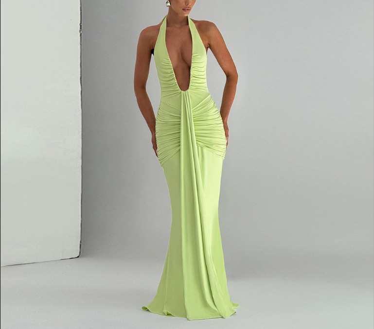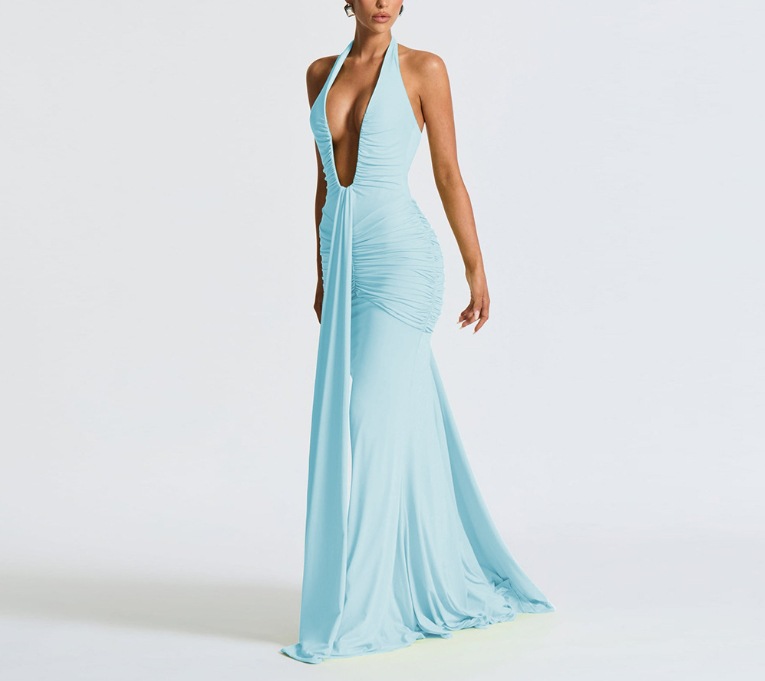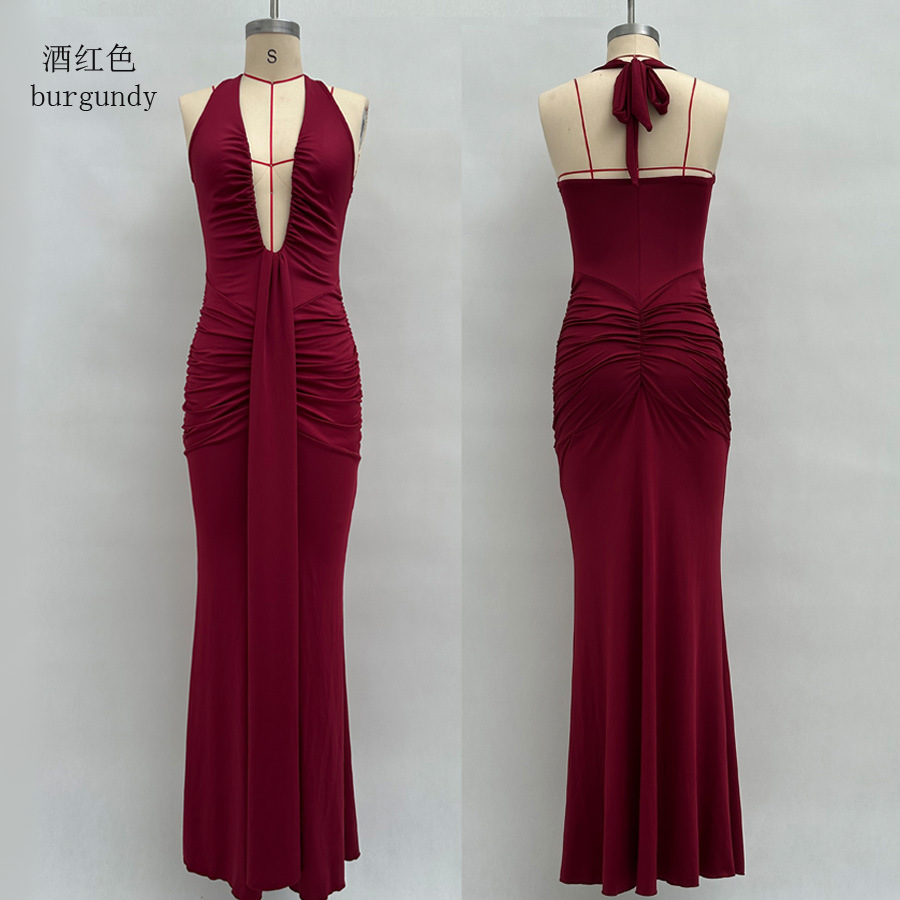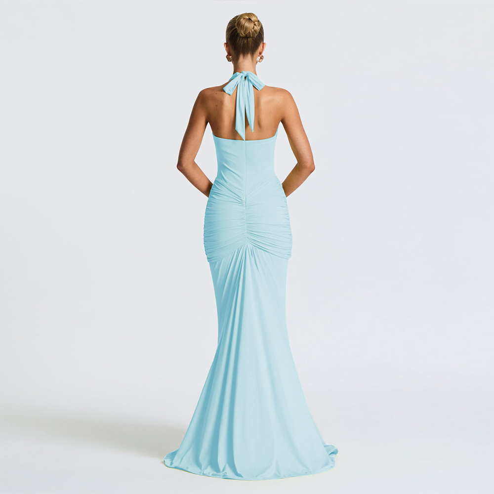 국경 간 대외 무역 새로운 단색 우아한 홀터넥 딥 V 허리 롱 스커트 섹시한 백리스 리본 피쉬 테일 드레스
