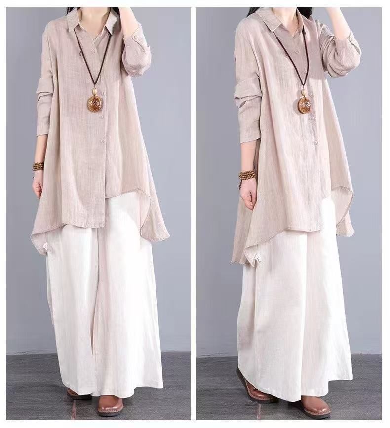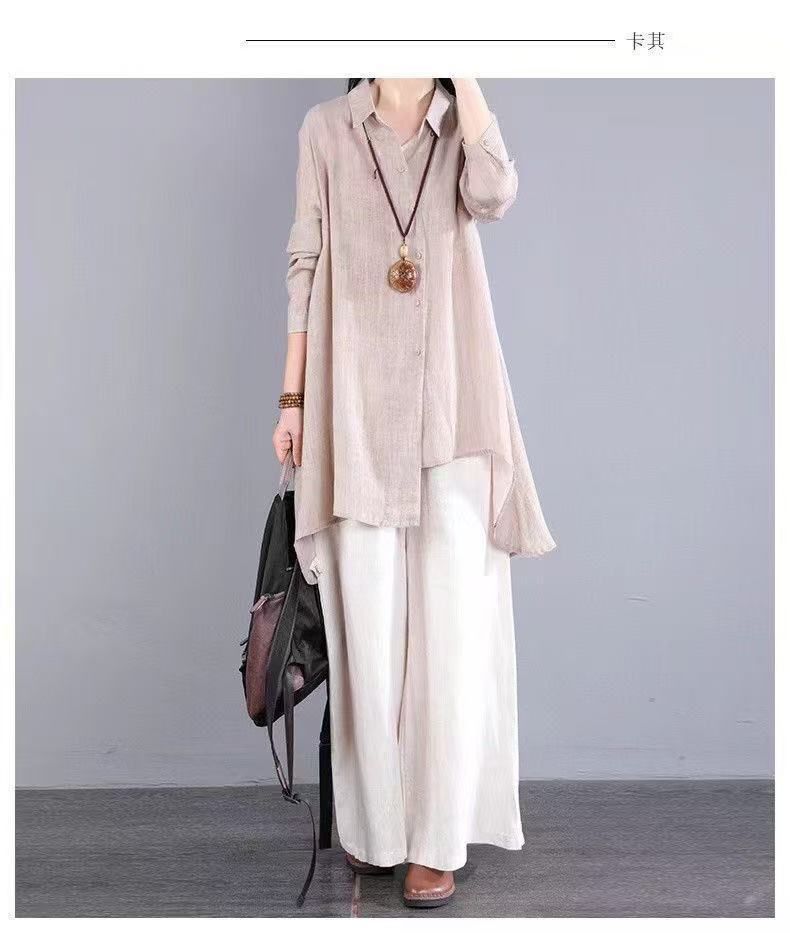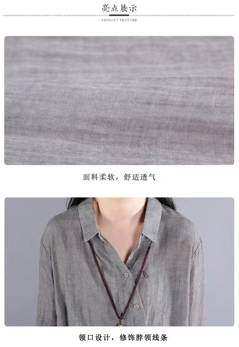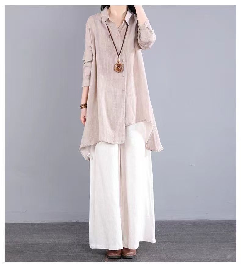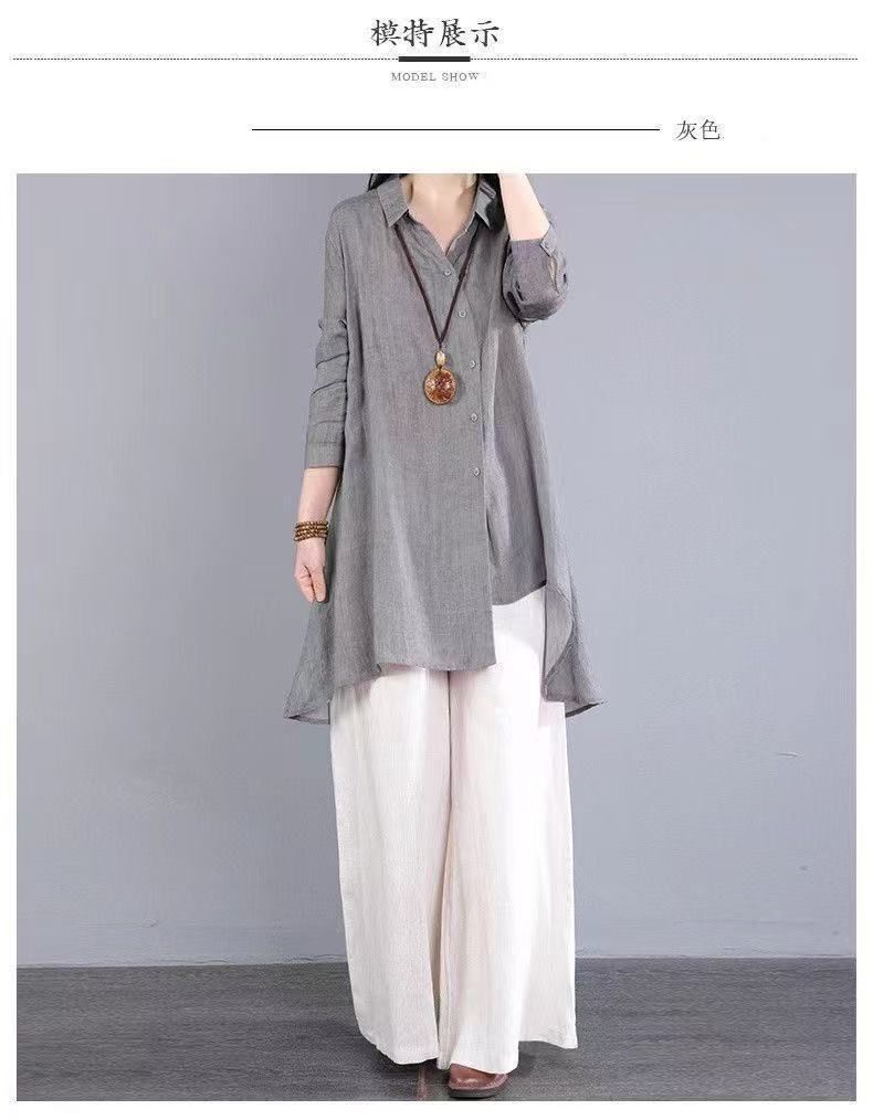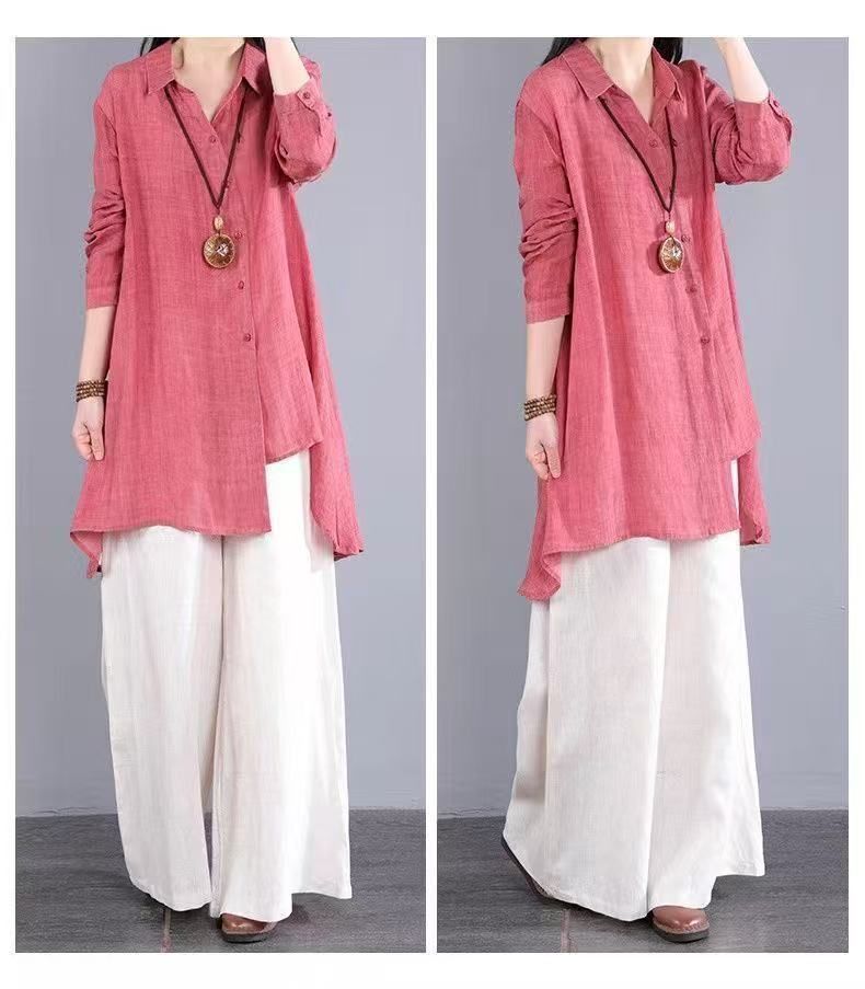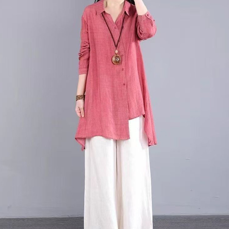 불규칙한 디자인 POLO 칼라 코튼 및 린넨 긴 소매 셔츠 봄과 여름 새로운 중간 길이의 단색 복고풍 여성 의류스토어 가기