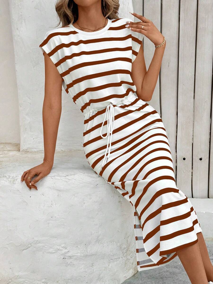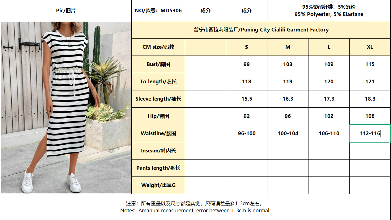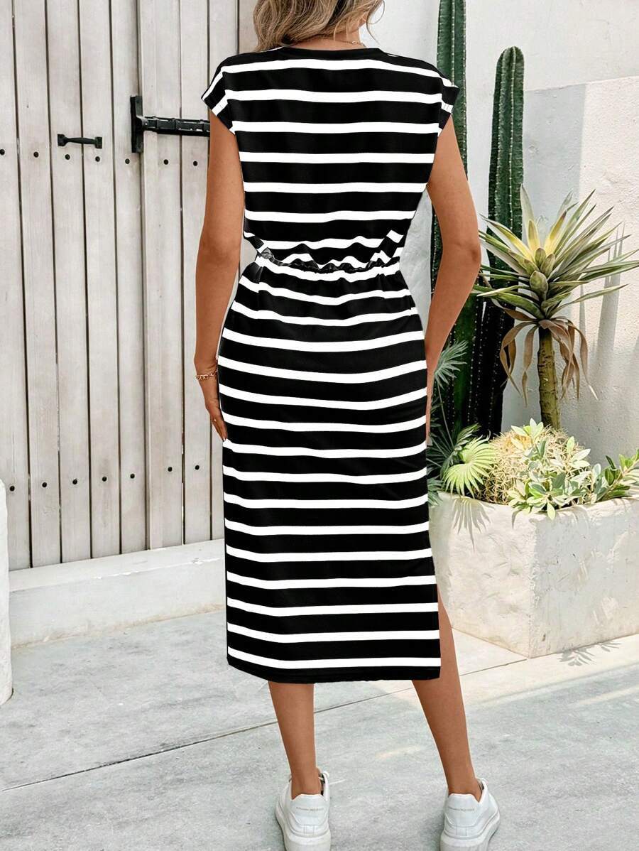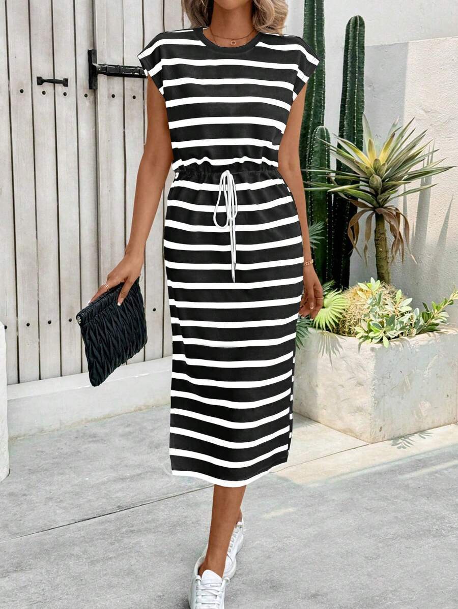 국경 간 유럽 및 미국 여성 의류 아마존 독립 역 여성 흑백 줄무늬 분할 크루 넥 캐주얼 원피스