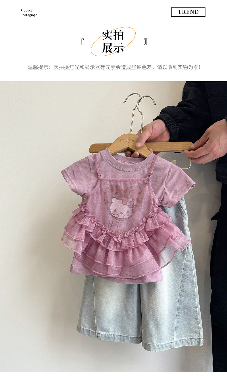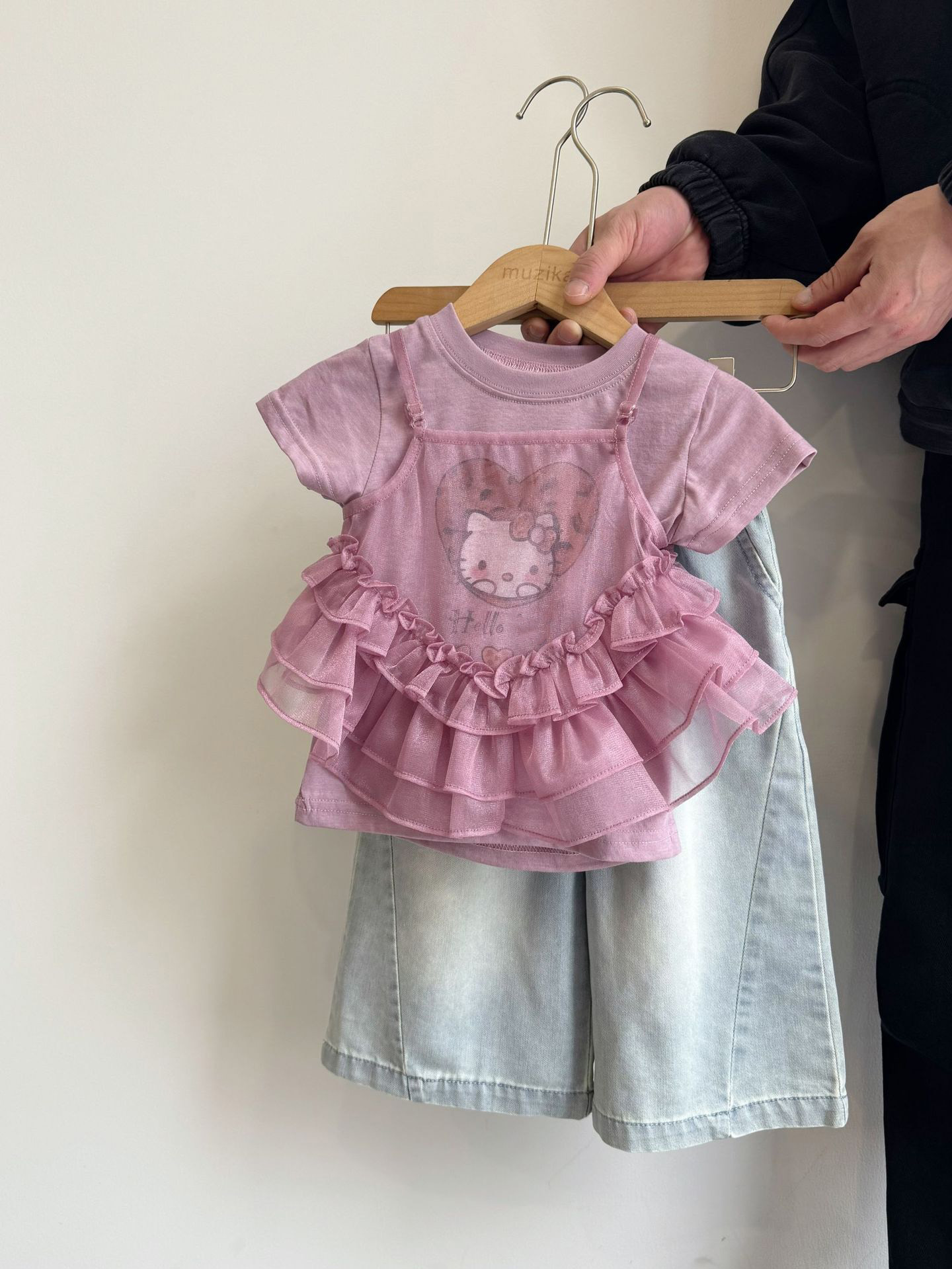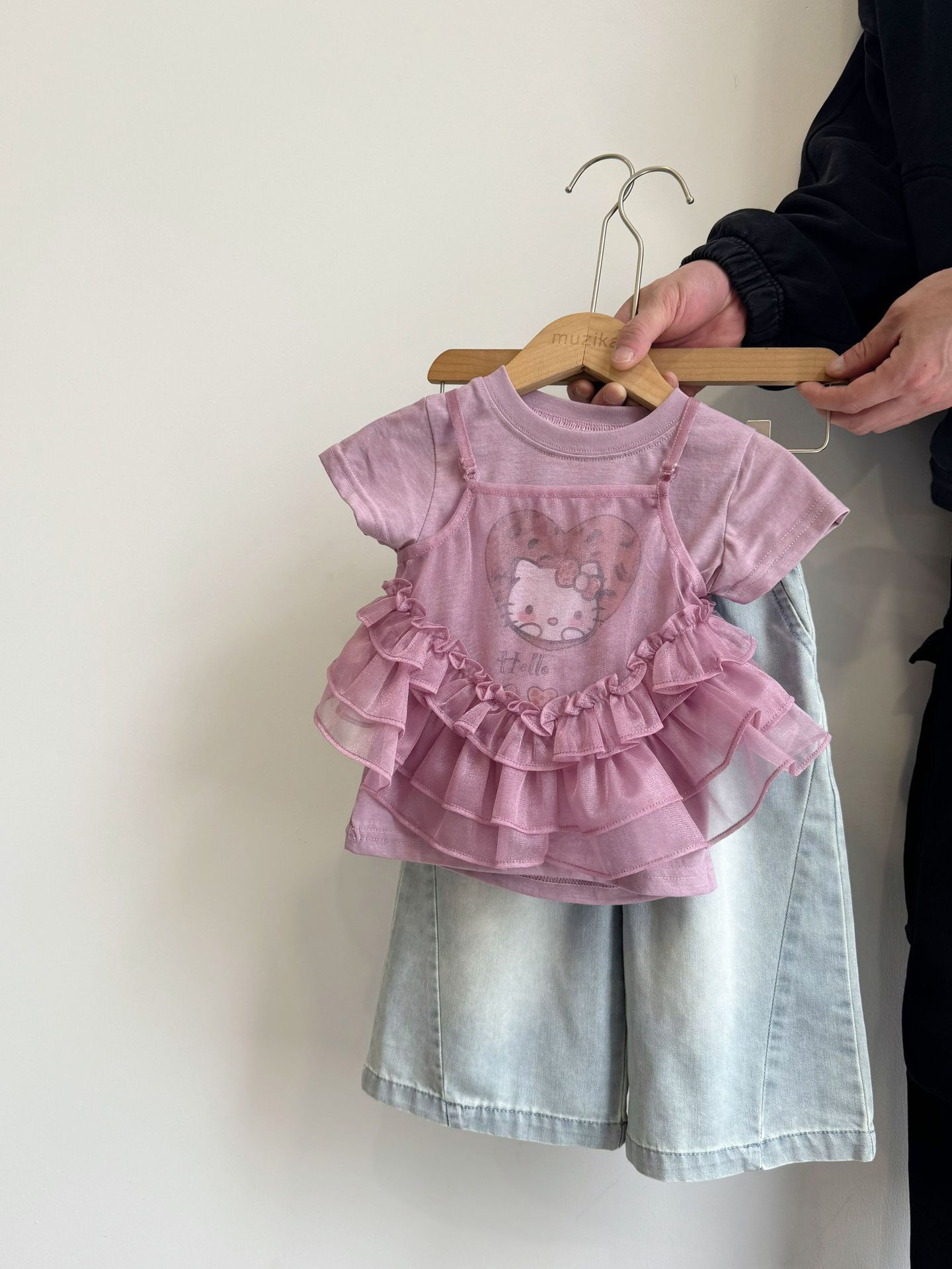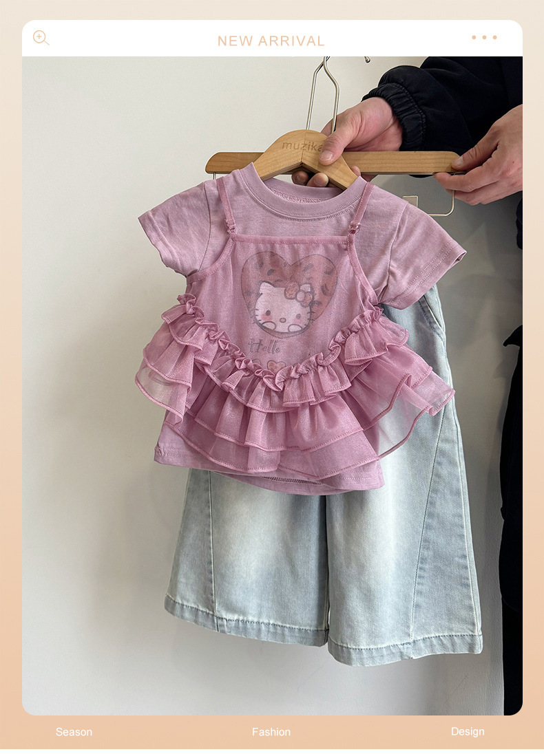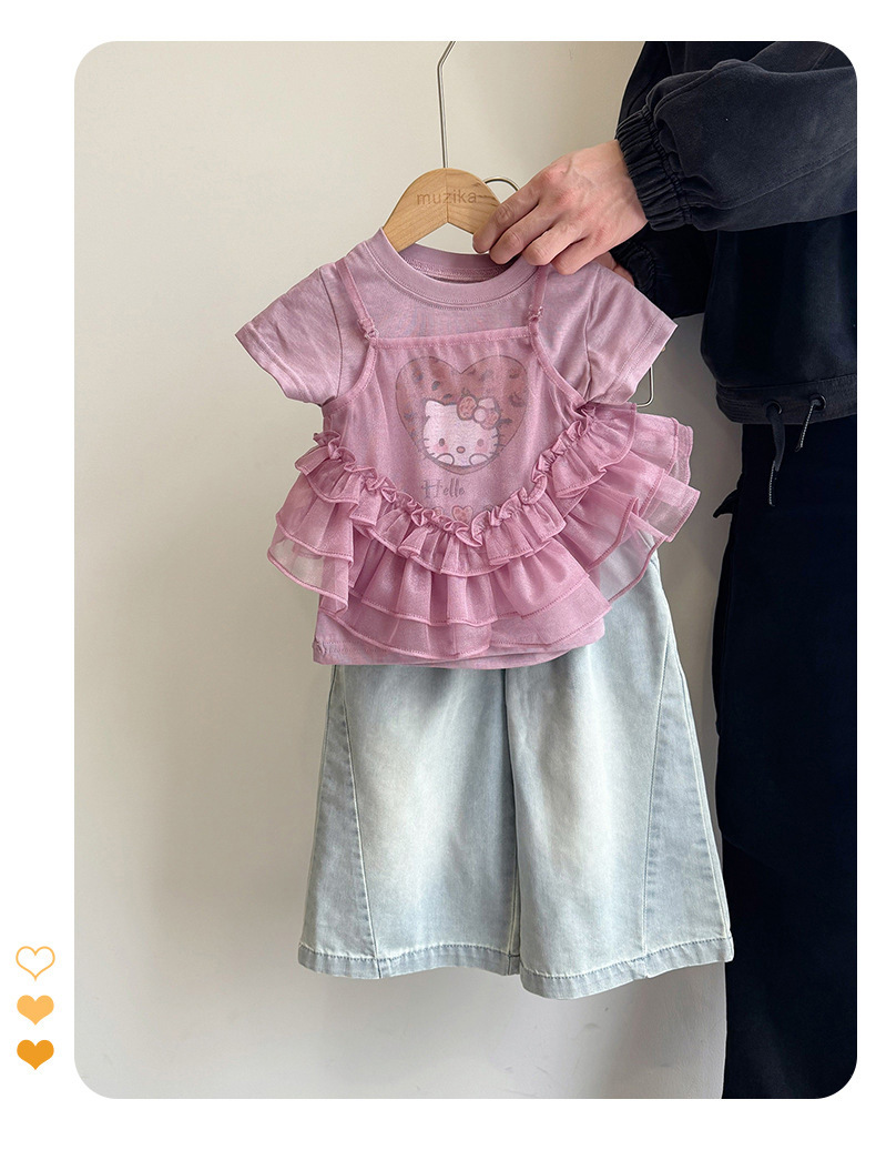 2025 새로운 여름 소녀 티셔츠 만화 레이스 라운드 넥 서스펜더 핑크 탑 청바지 정장스토어 가기