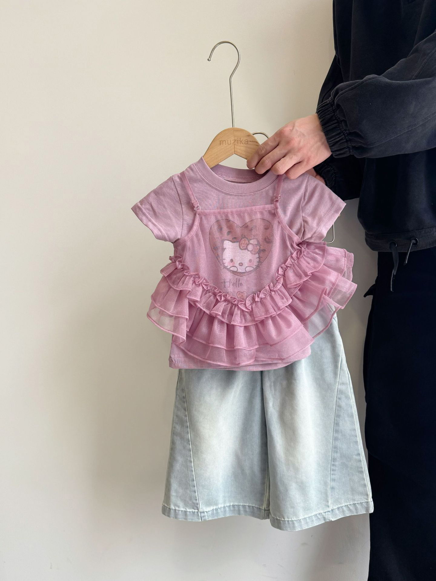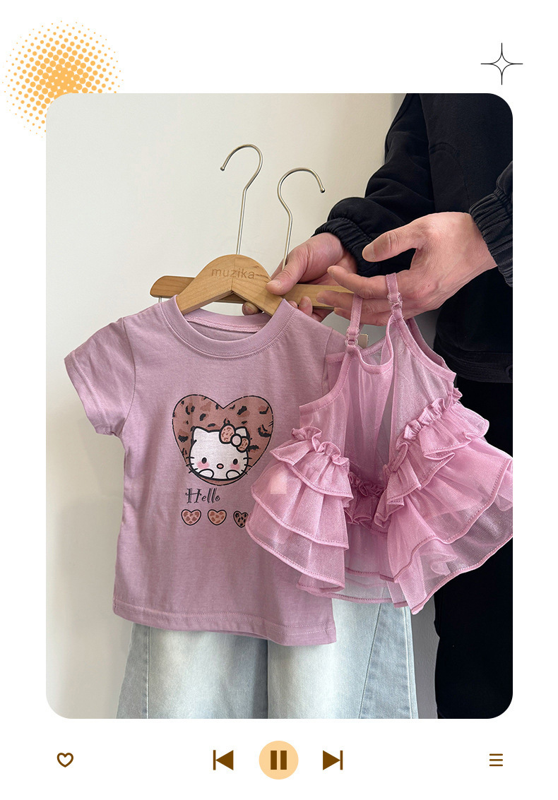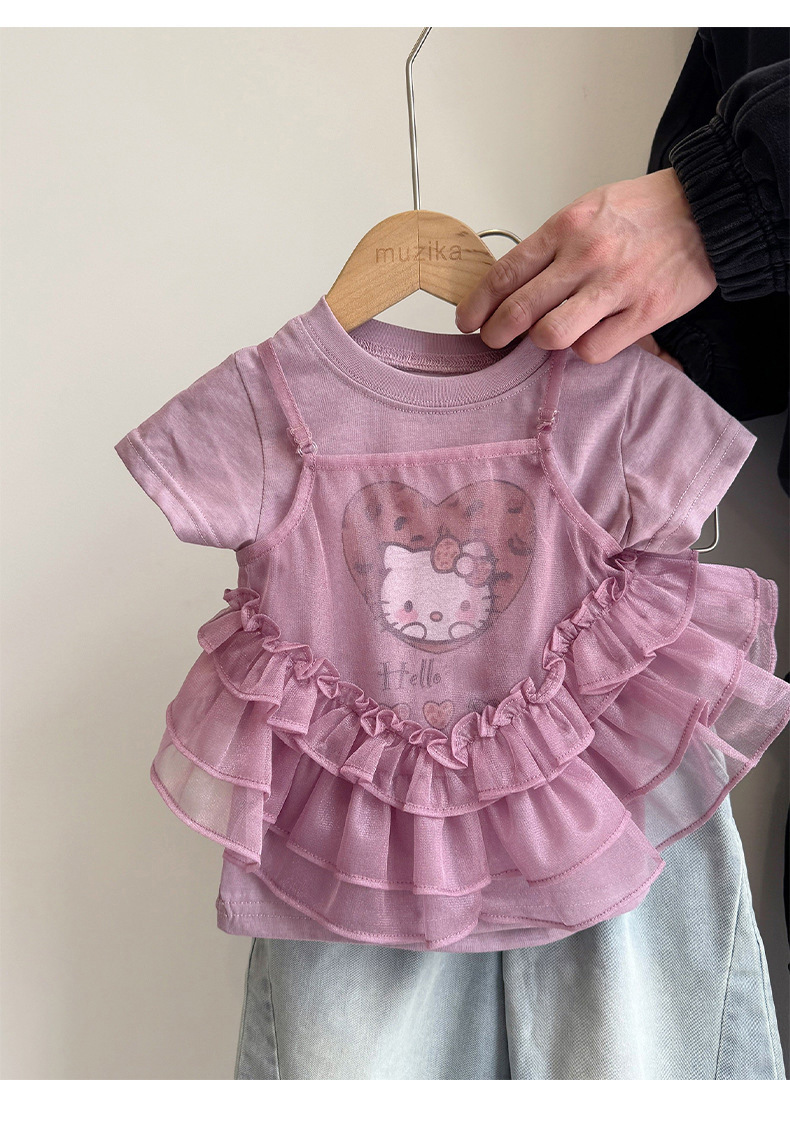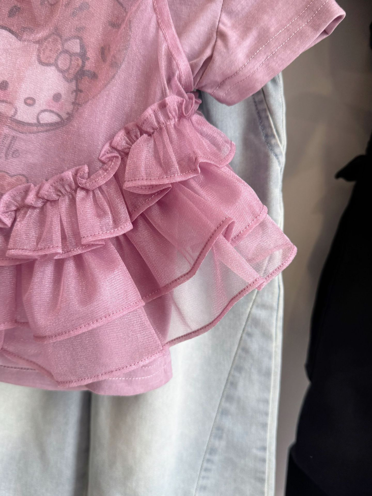 2025 새로운 여름 소녀 티셔츠 만화 레이스 라운드 넥 서스펜더 핑크 탑 청바지 정장스토어 가기