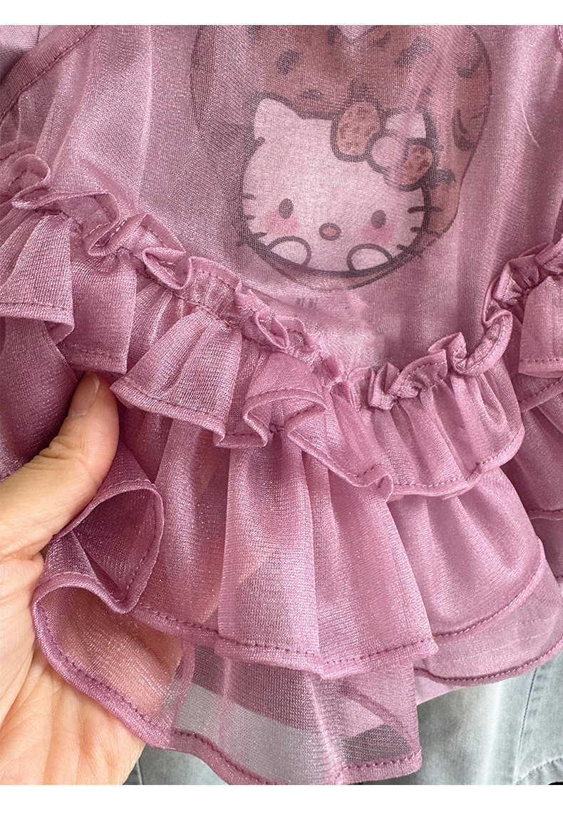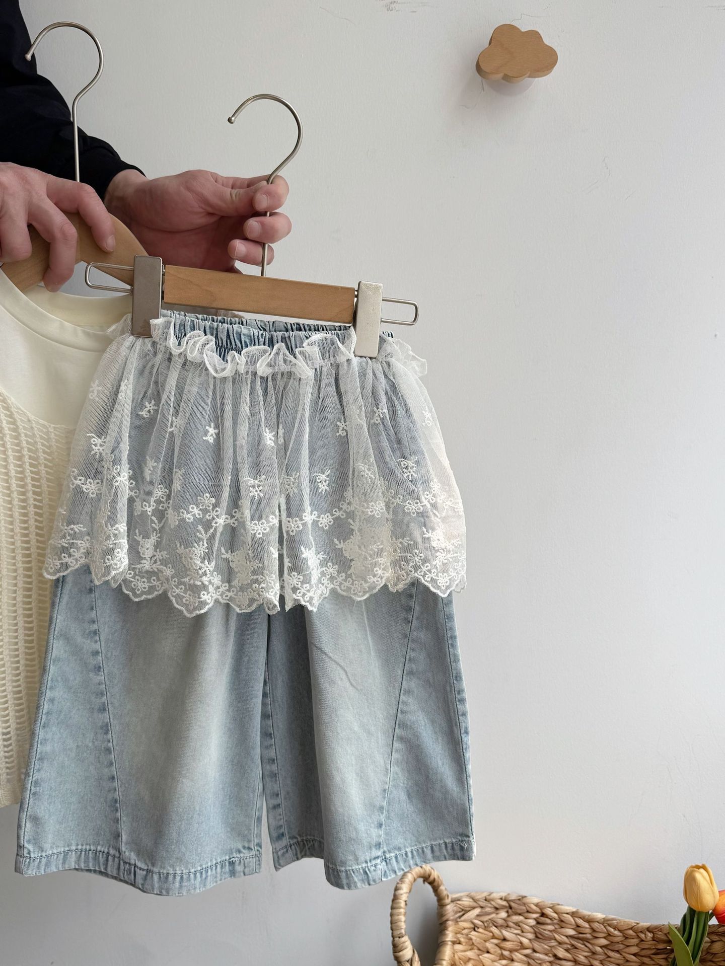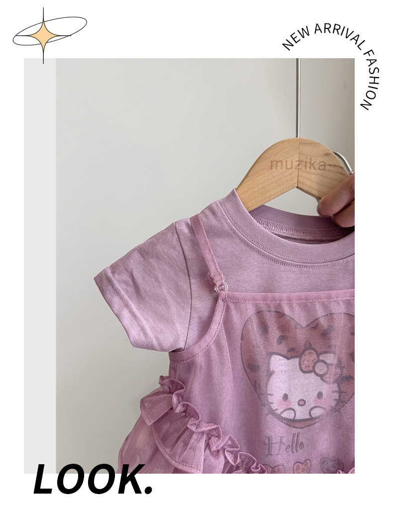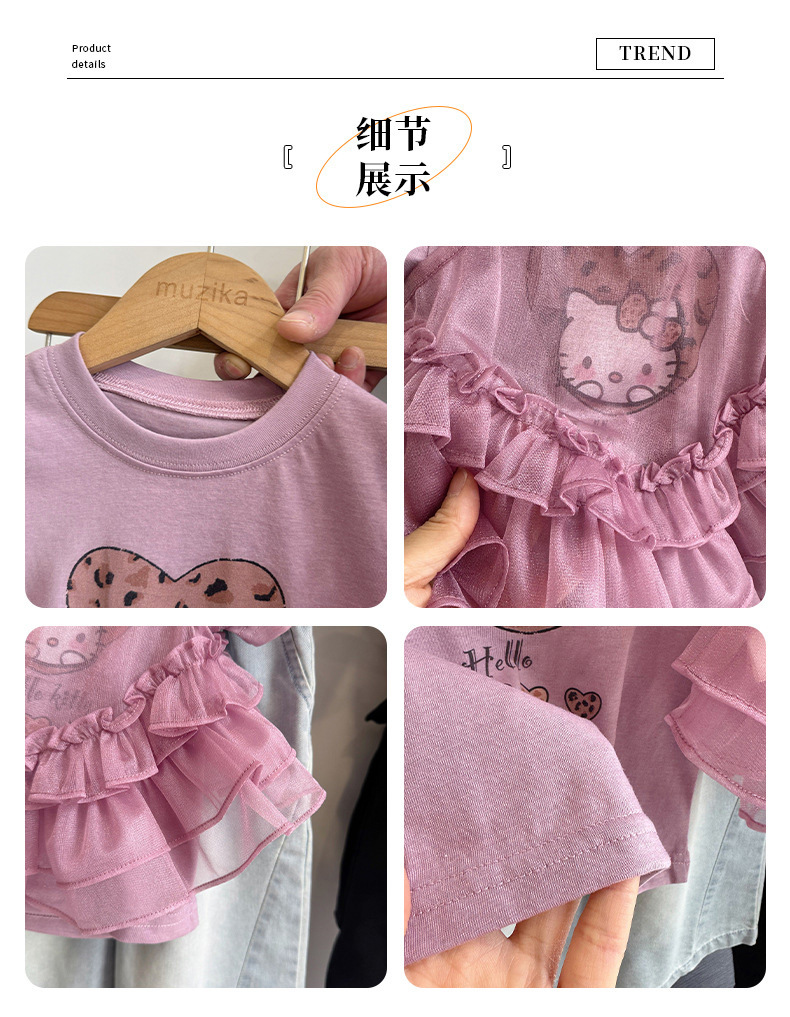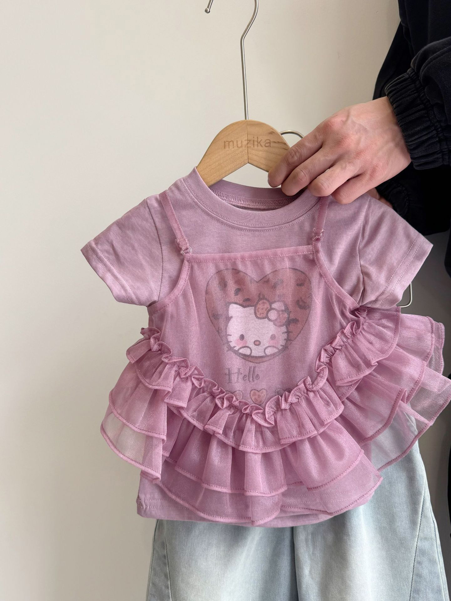 2025 새로운 여름 소녀 티셔츠 만화 레이스 라운드 넥 서스펜더 핑크 탑 청바지 정장스토어 가기