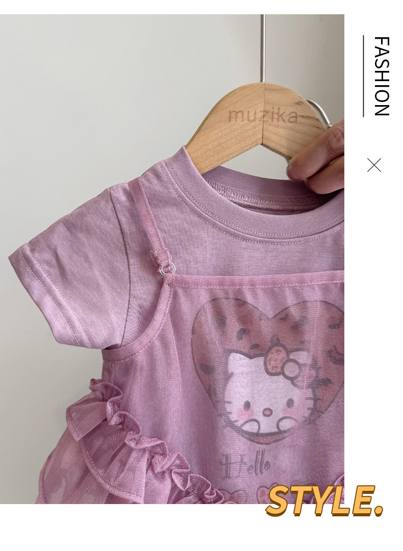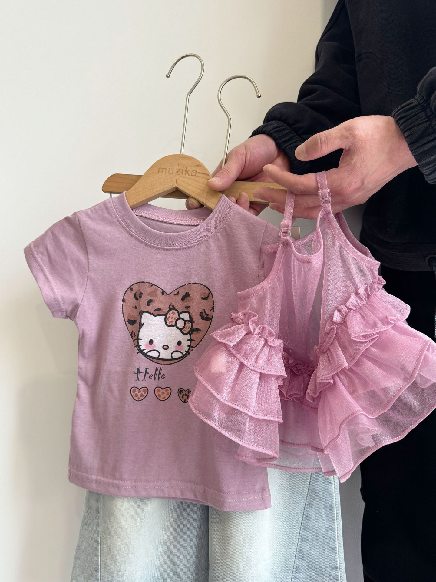 2025 새로운 여름 소녀 티셔츠 만화 레이스 라운드 넥 서스펜더 핑크 탑 청바지 정장