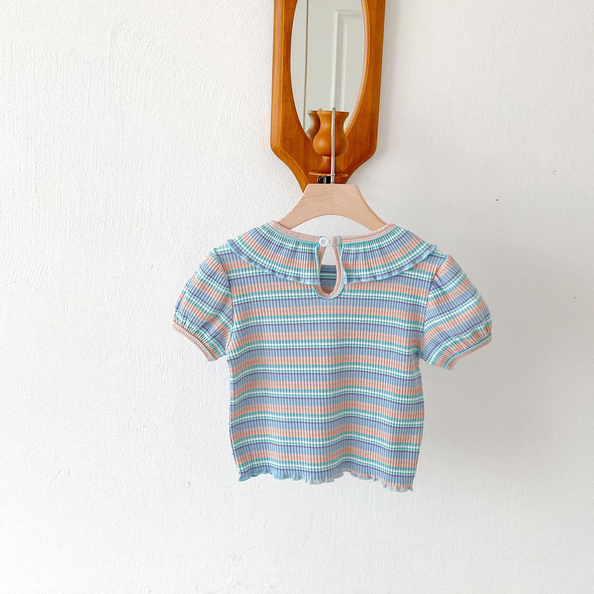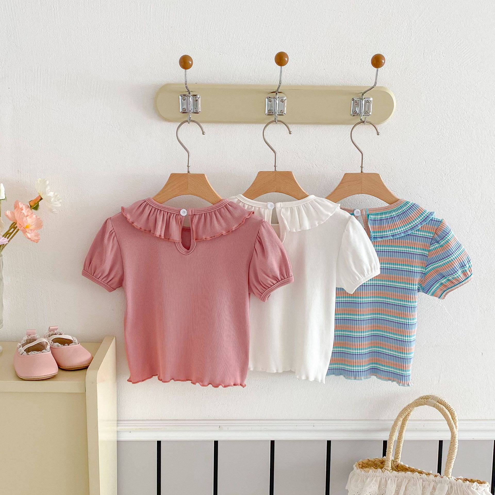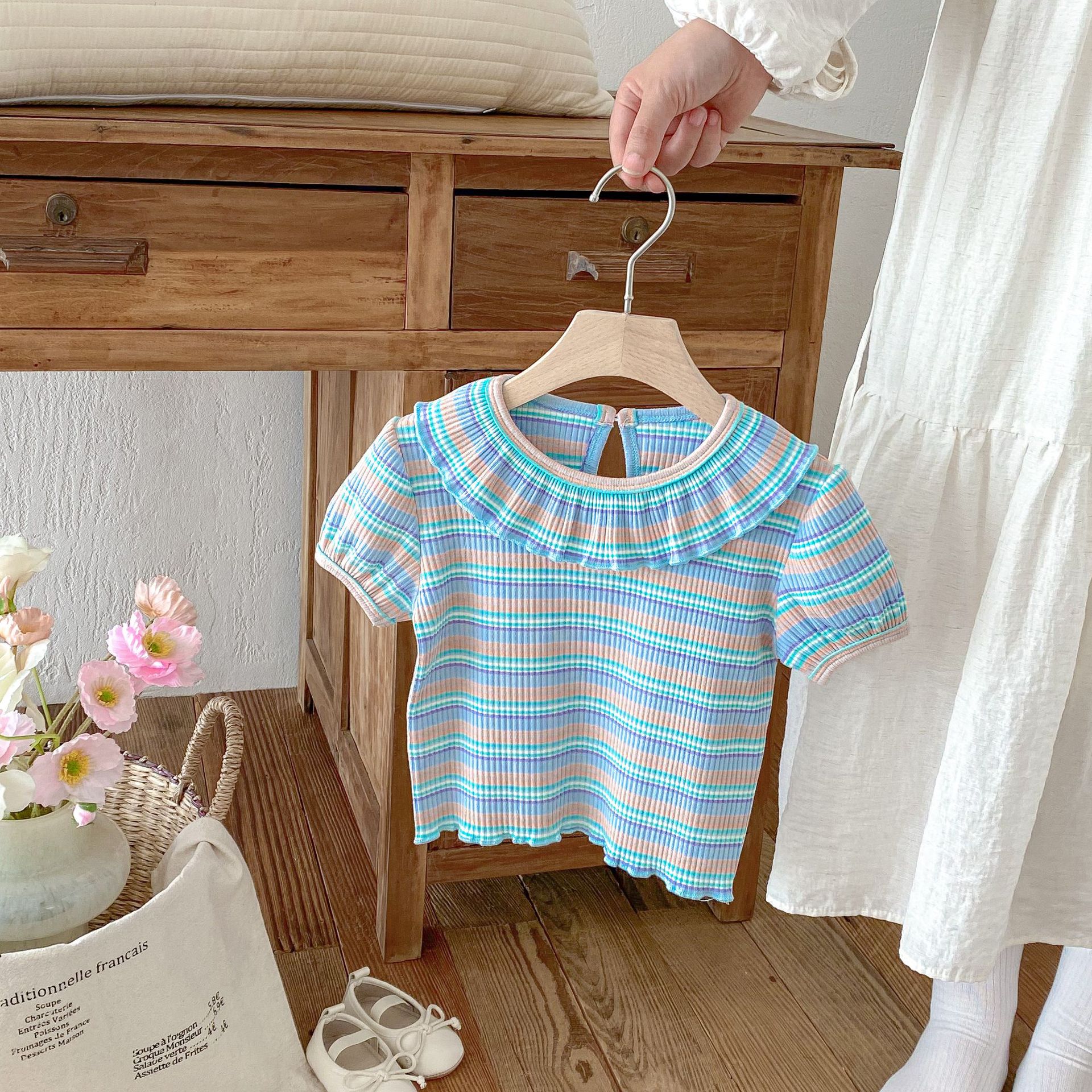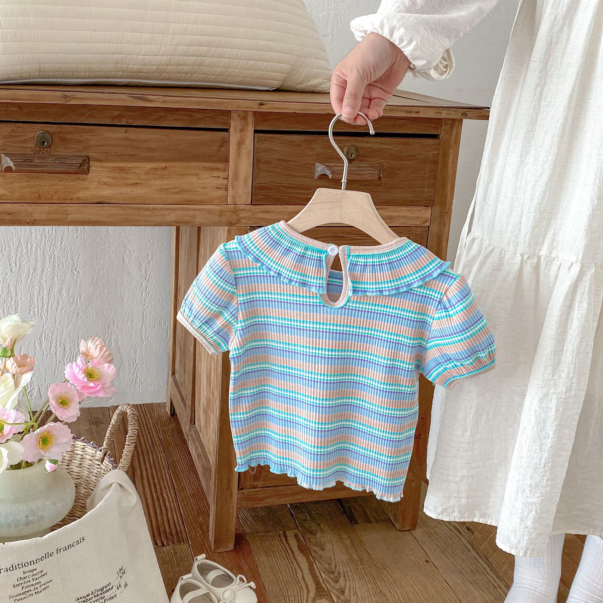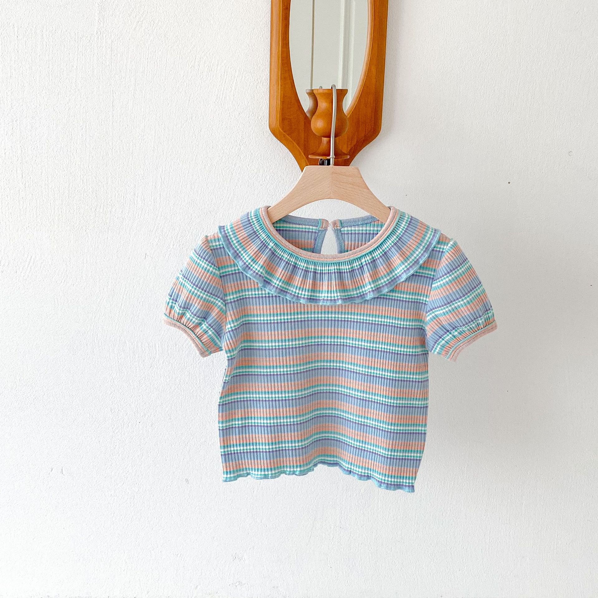 여름 한국 아동복 상의 2025 신상 스트라이프 라펠 반팔 패셔너블하고 다재다능한 퍼프 슬리브 여아 티셔츠스토어 가기