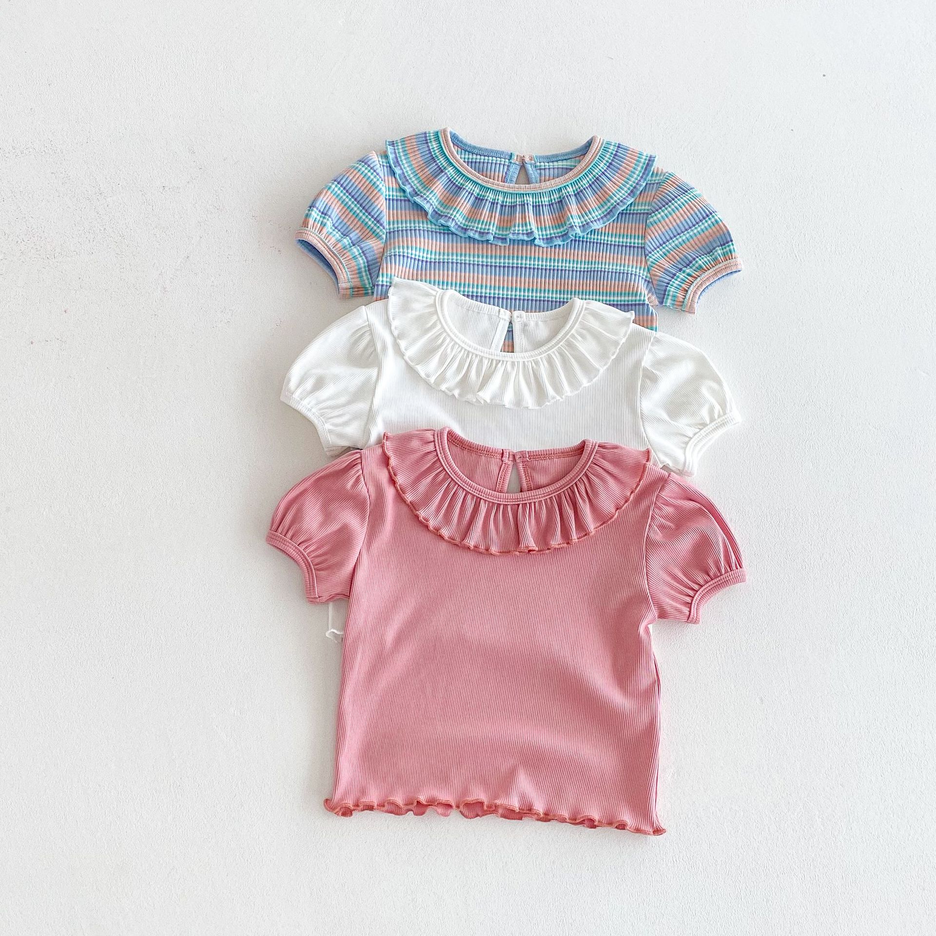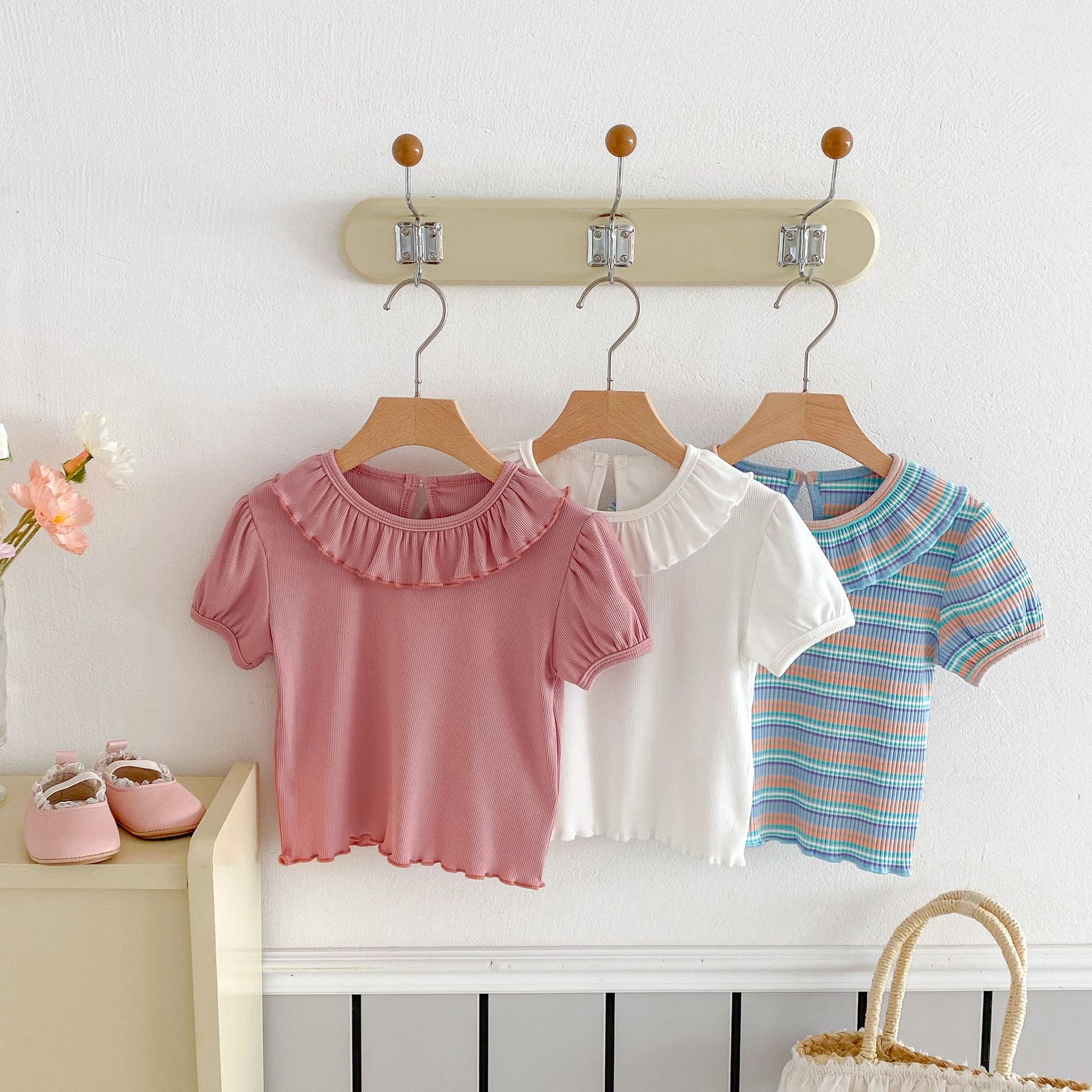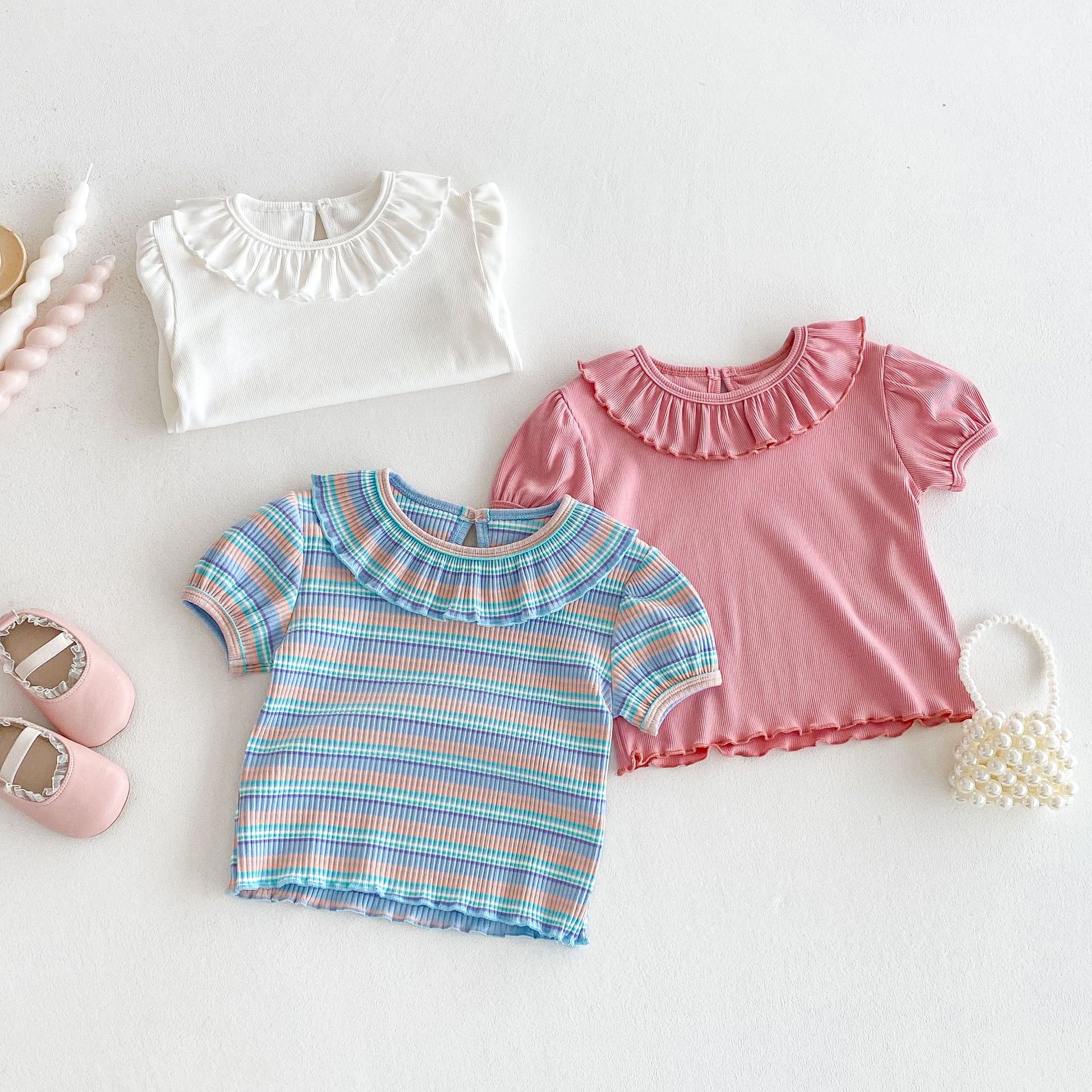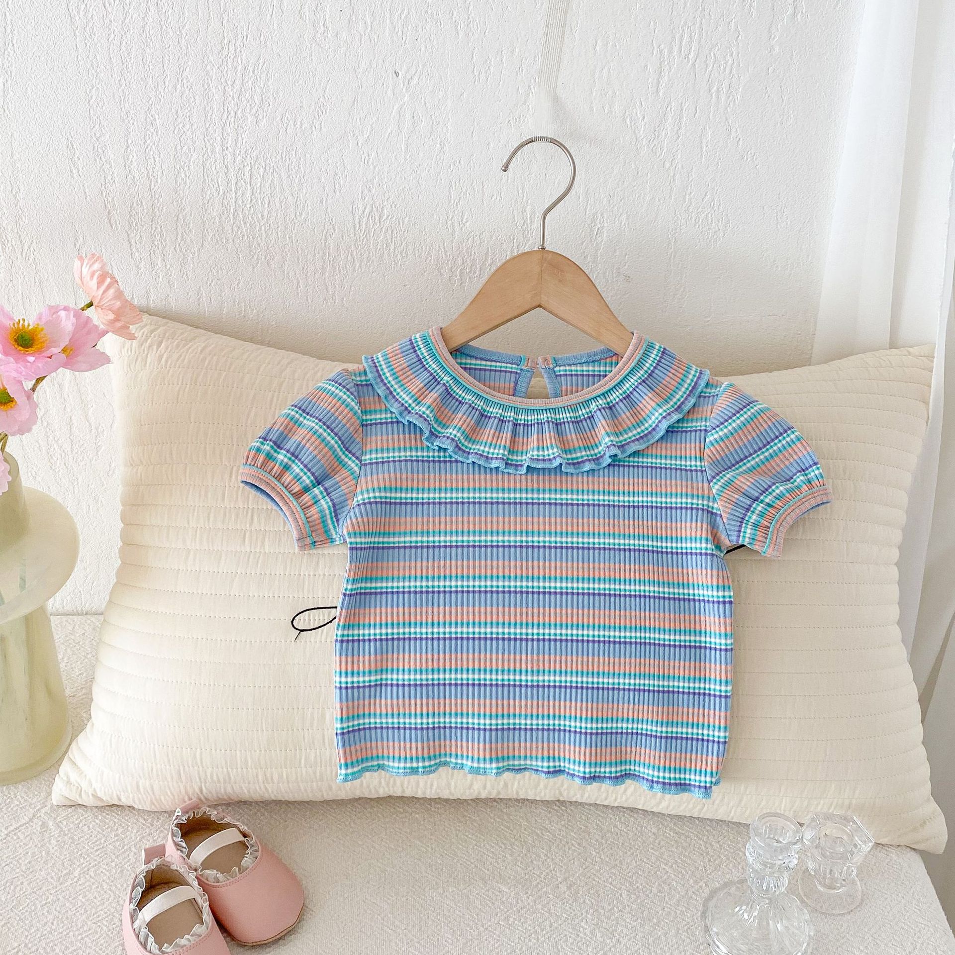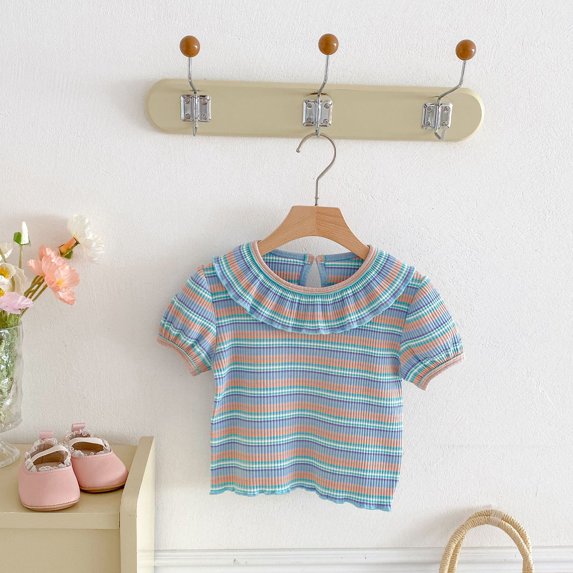 여름 한국 아동복 상의 2025 신상 스트라이프 라펠 반팔 패셔너블하고 다재다능한 퍼프 슬리브 여아 티셔츠스토어 가기