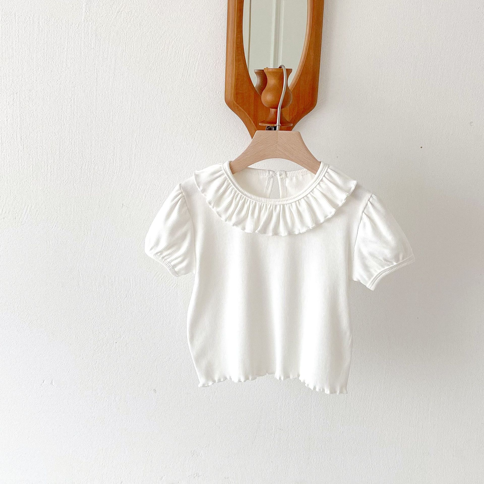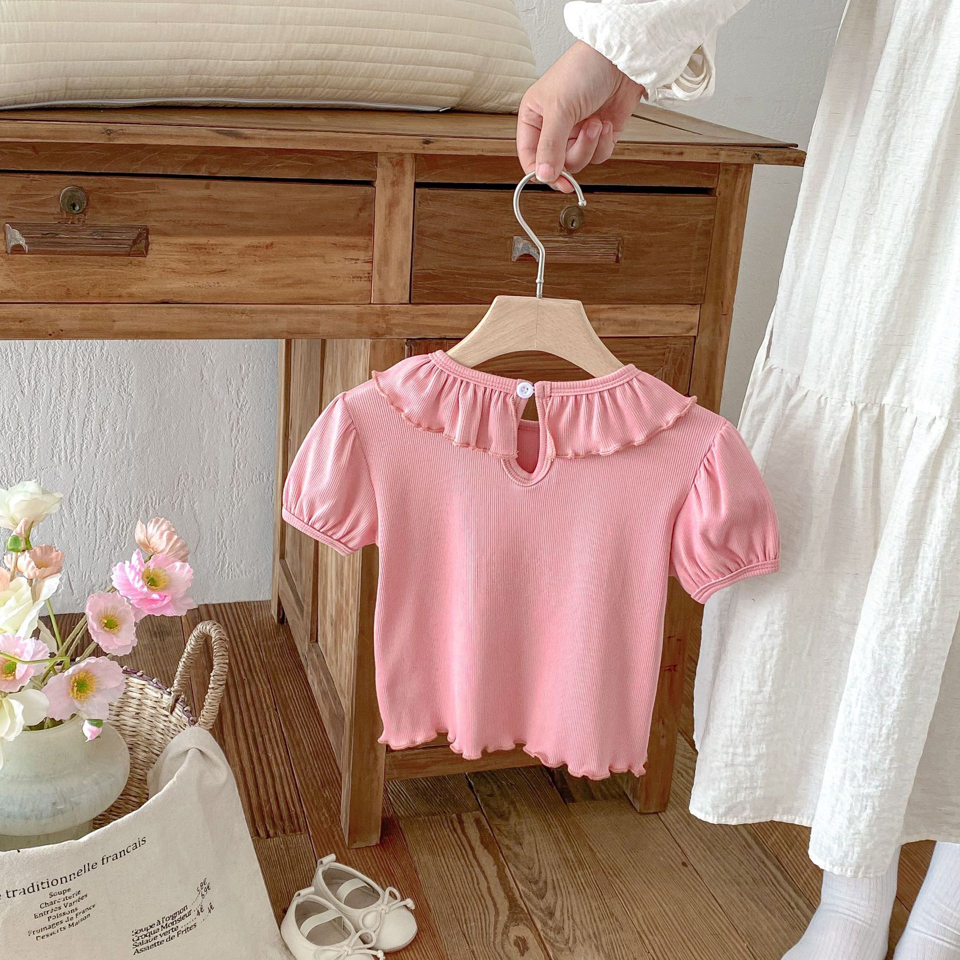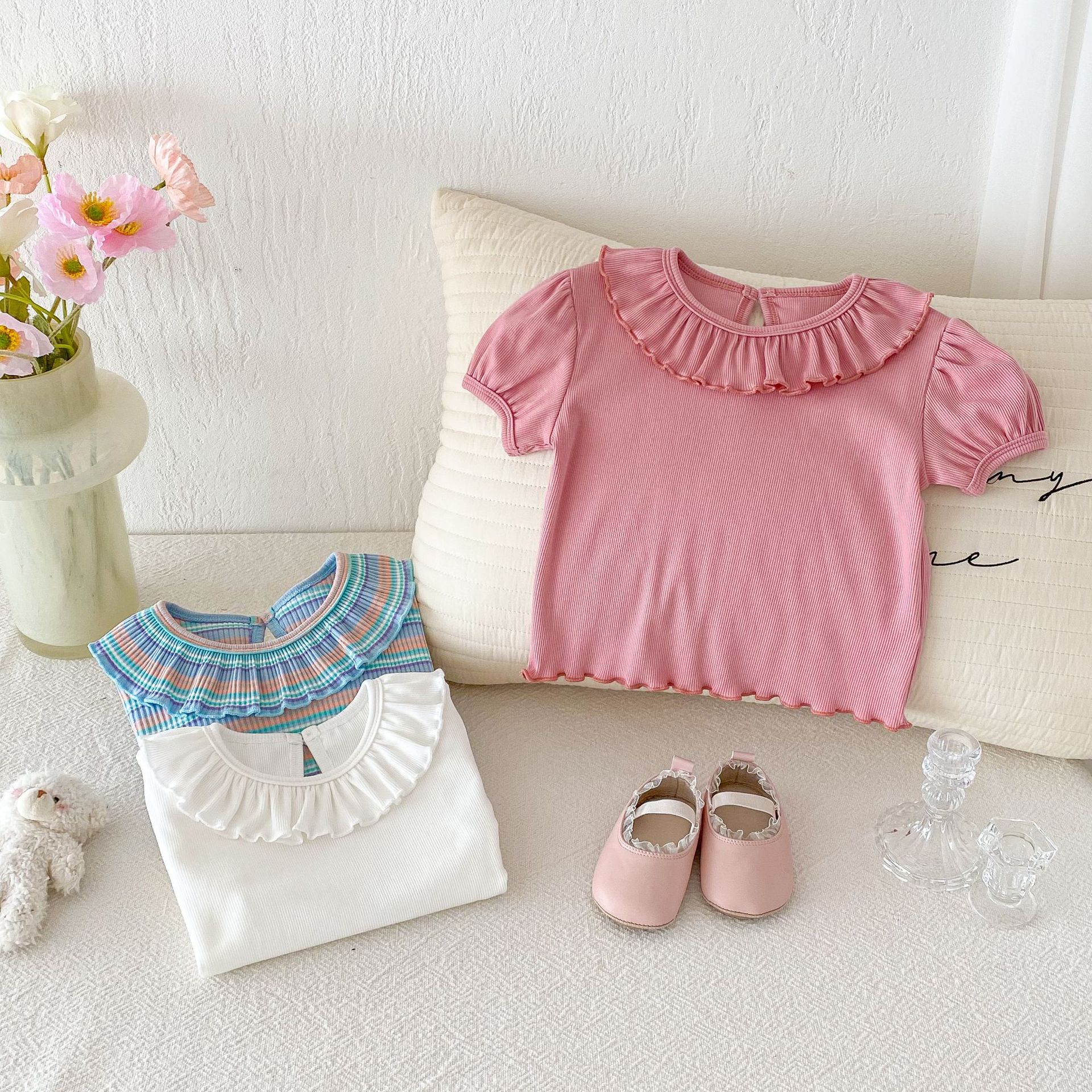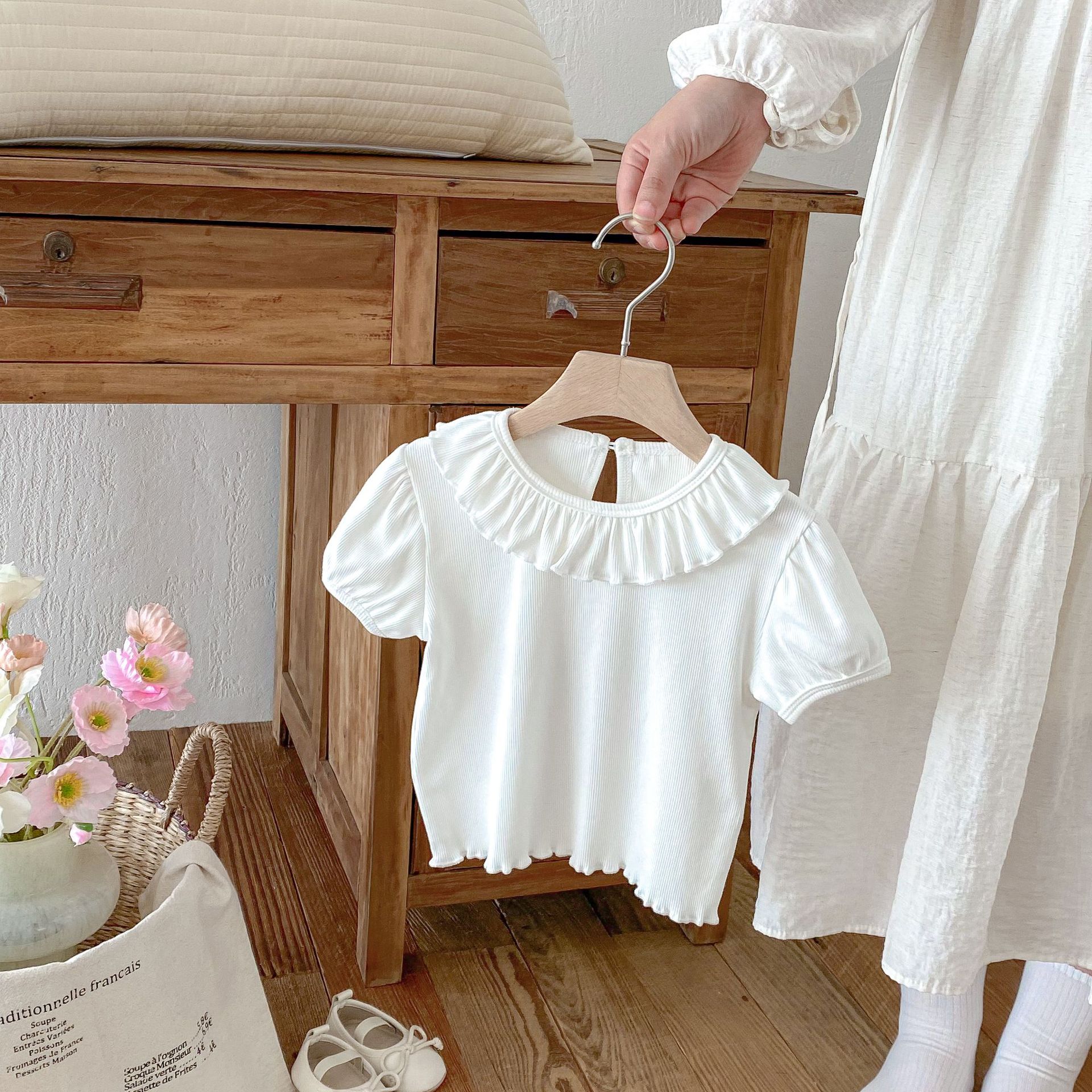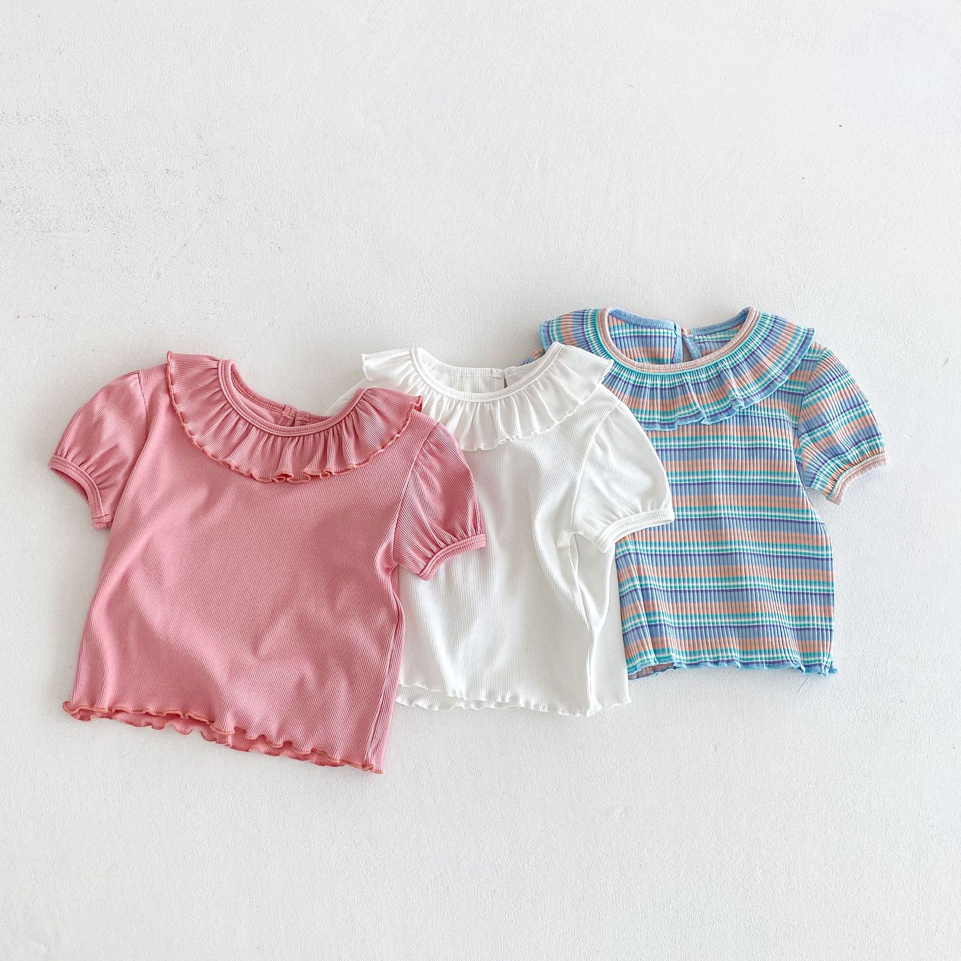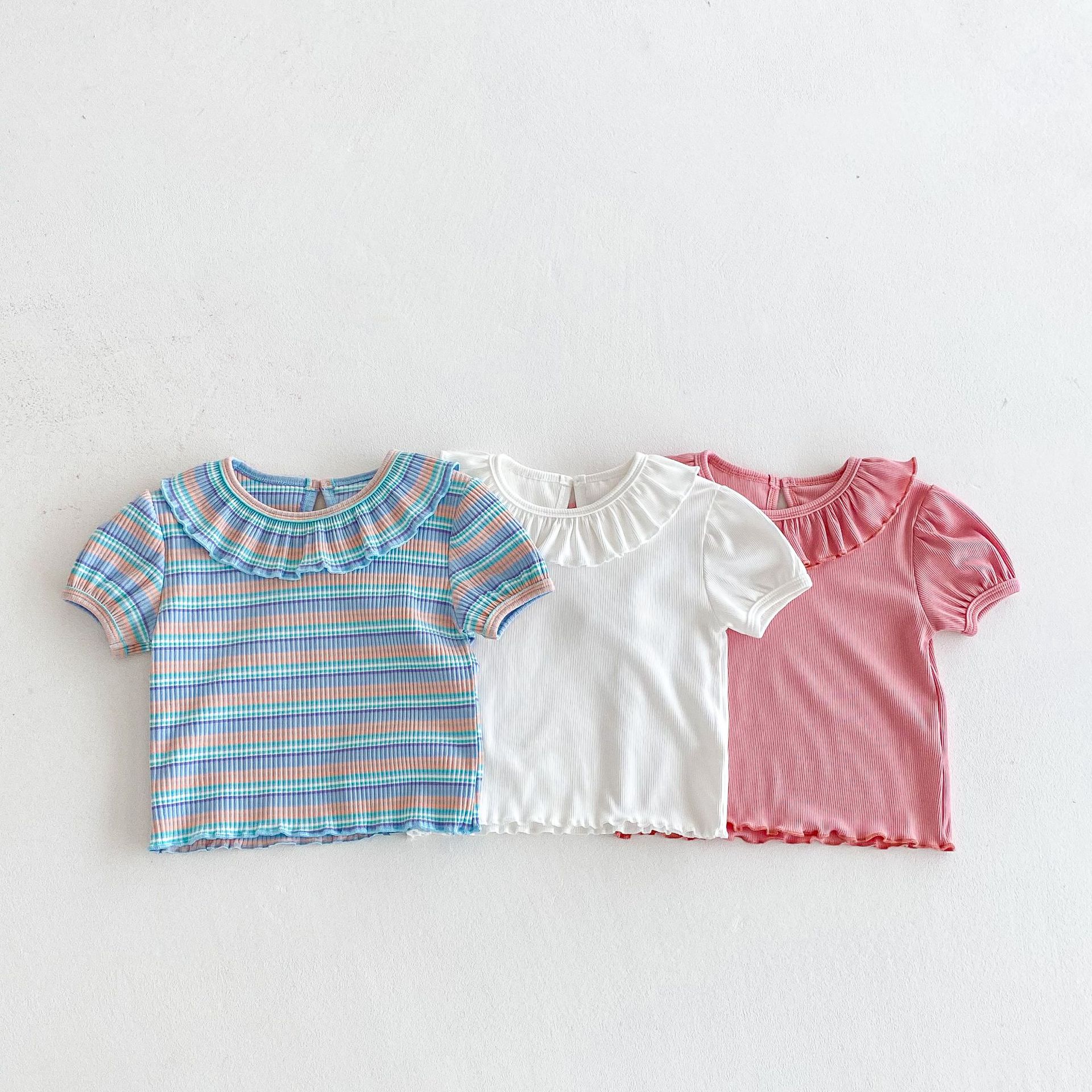 여름 한국 아동복 상의 2025 신상 스트라이프 라펠 반팔 패셔너블하고 다재다능한 퍼프 슬리브 여아 티셔츠스토어 가기