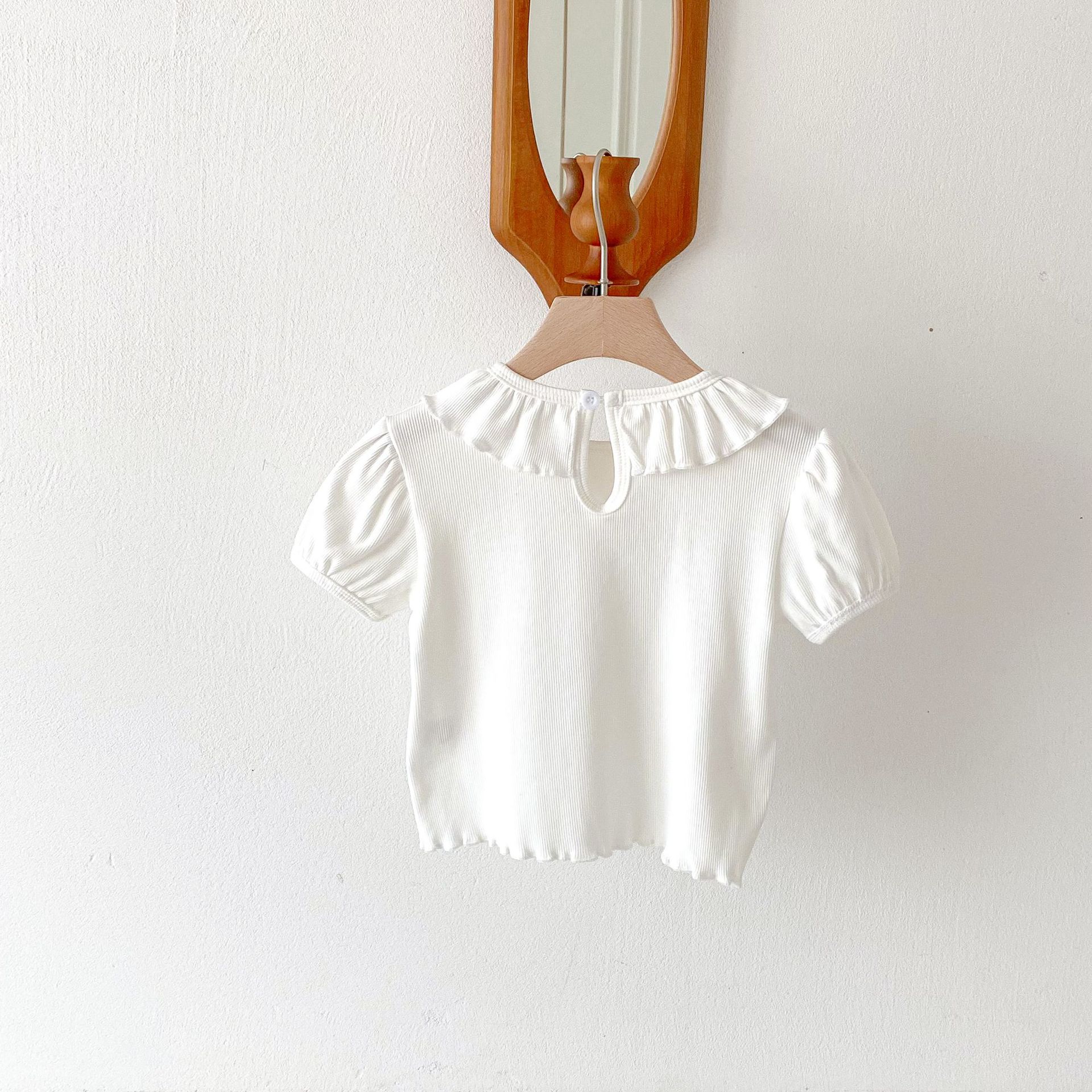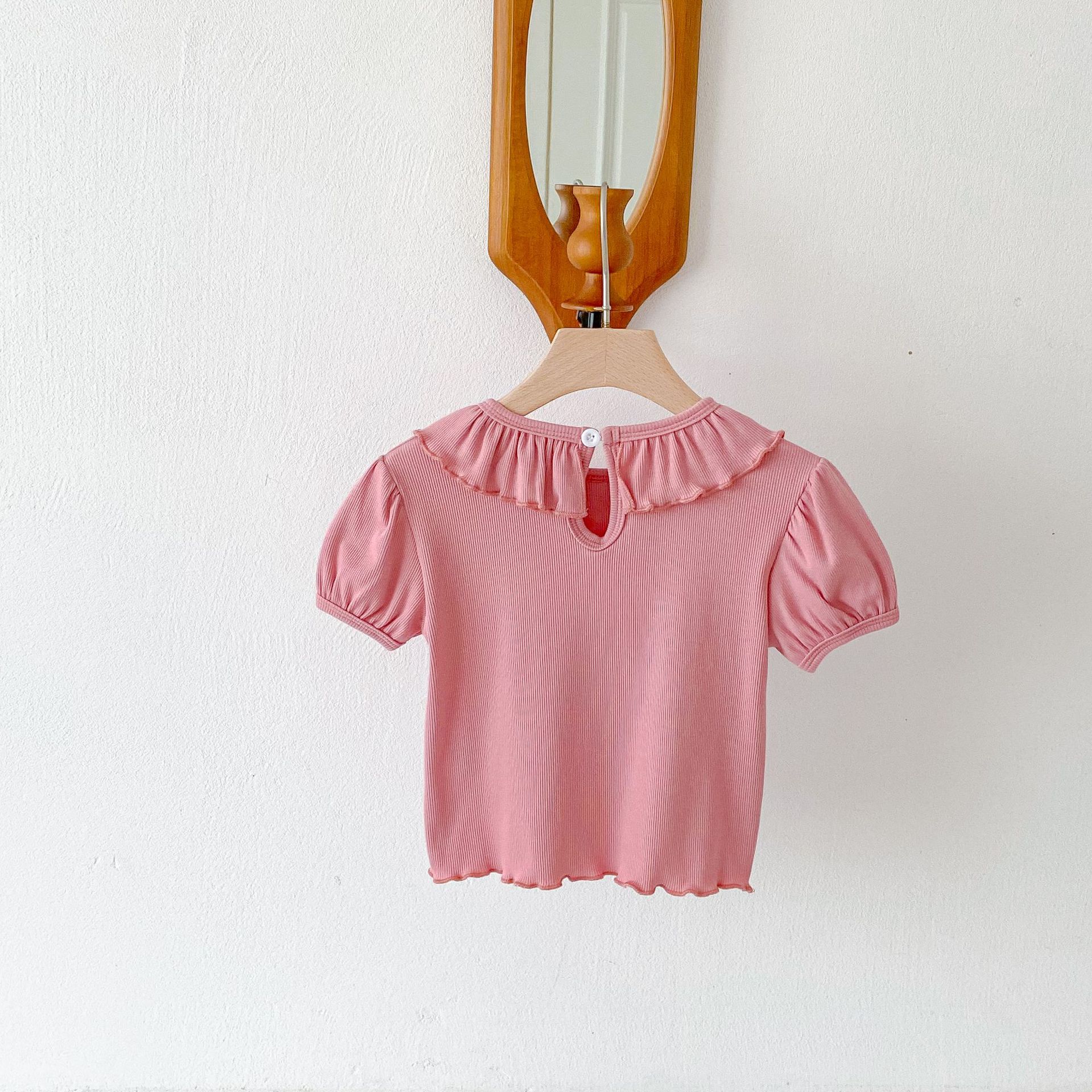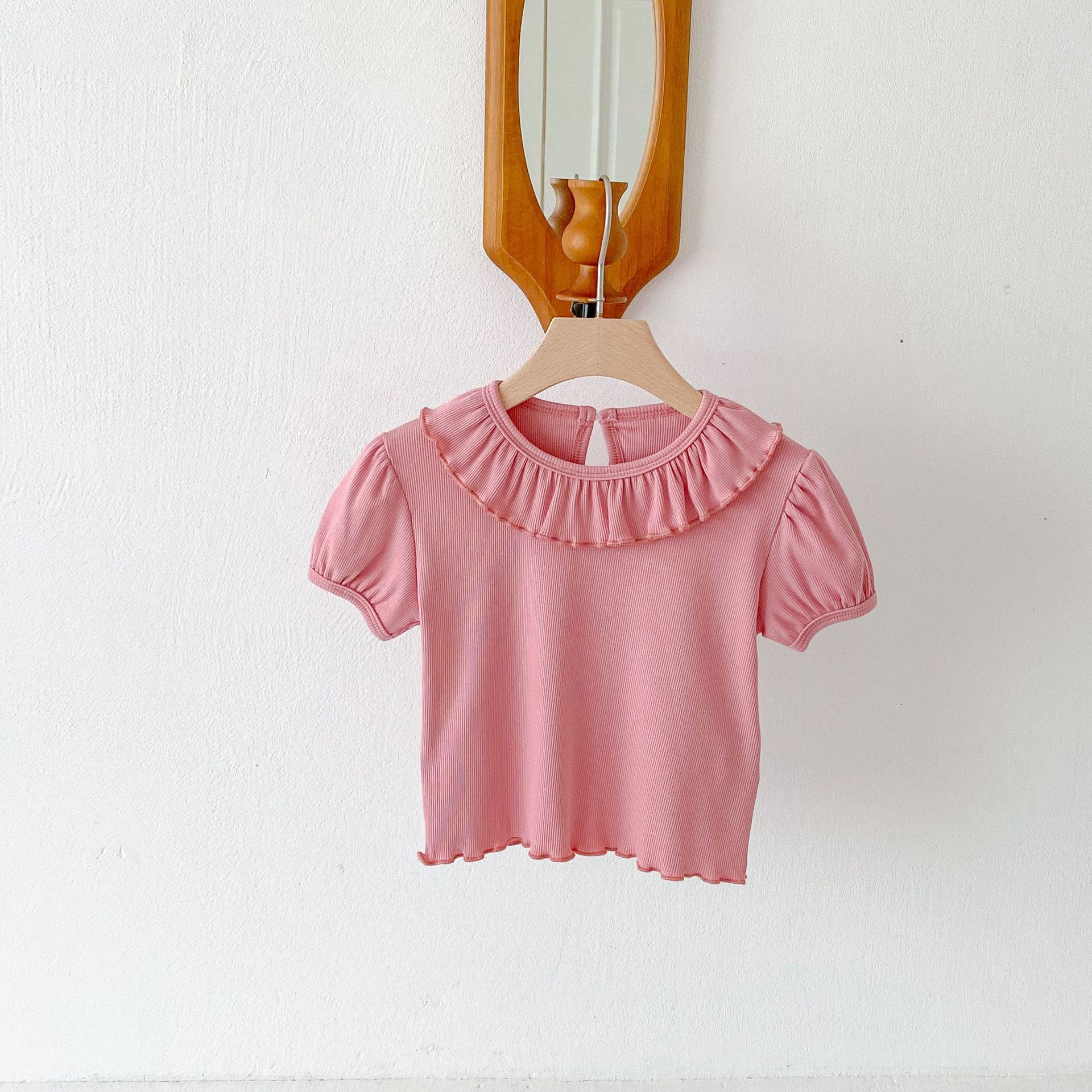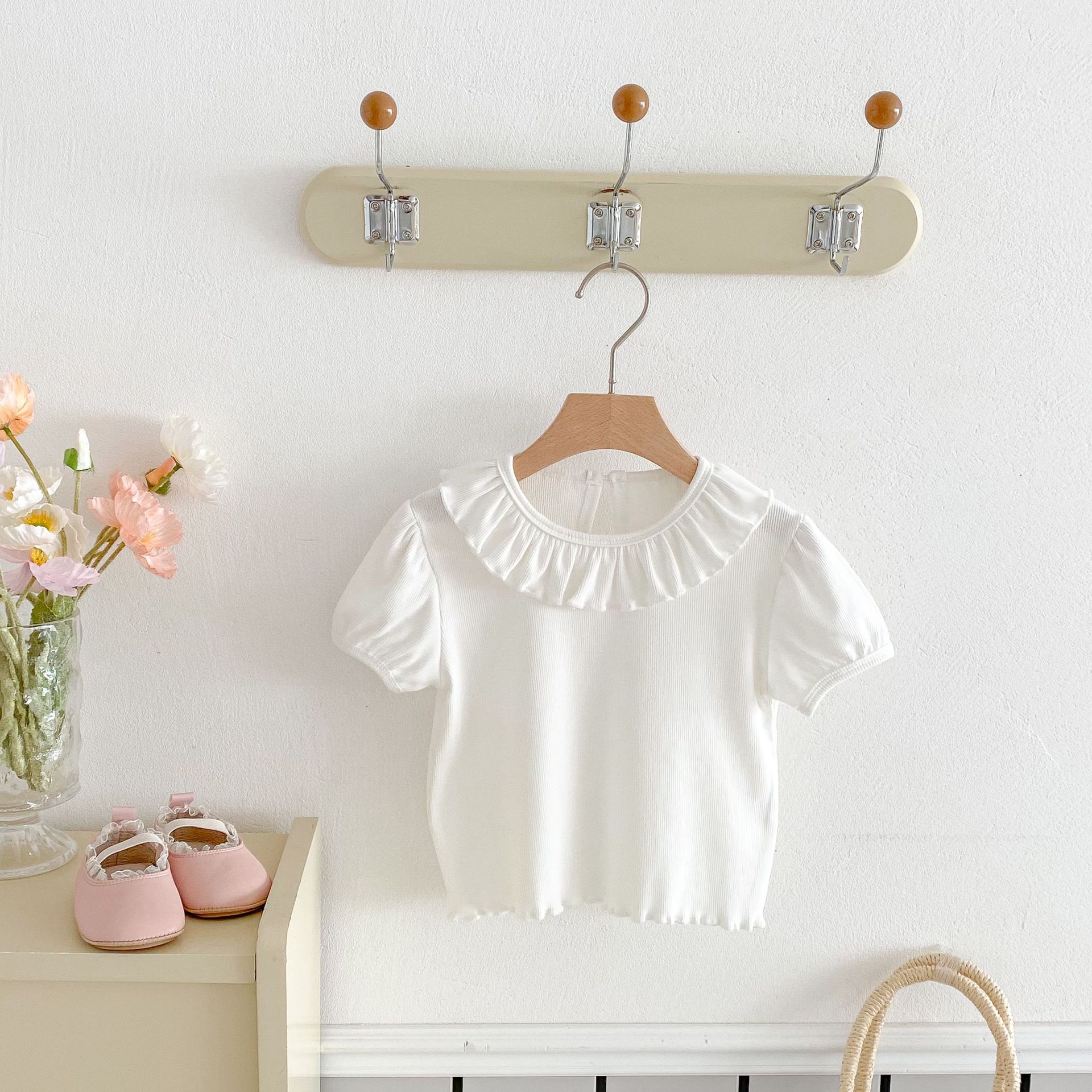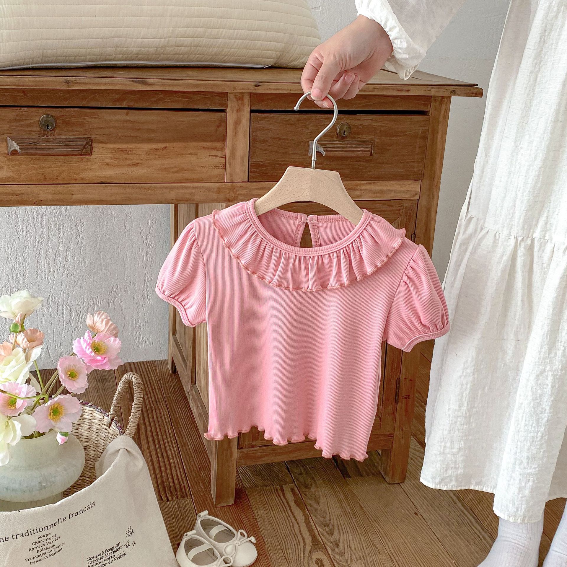여름 한국 아동복 상의 2025 신상 스트라이프 라펠 반팔 패셔너블하고 다재다능한 퍼프 슬리브 여아 티셔츠스토어 가기