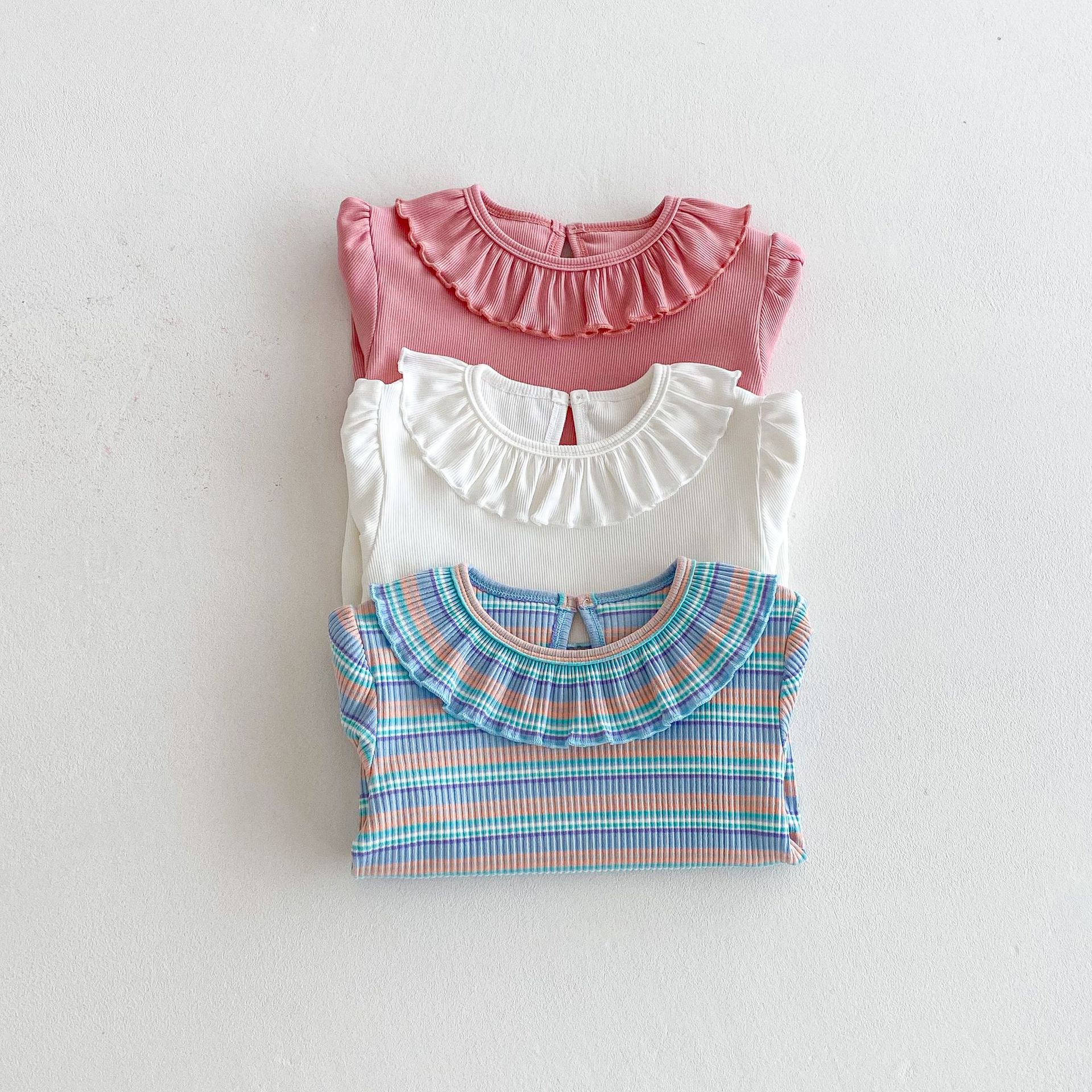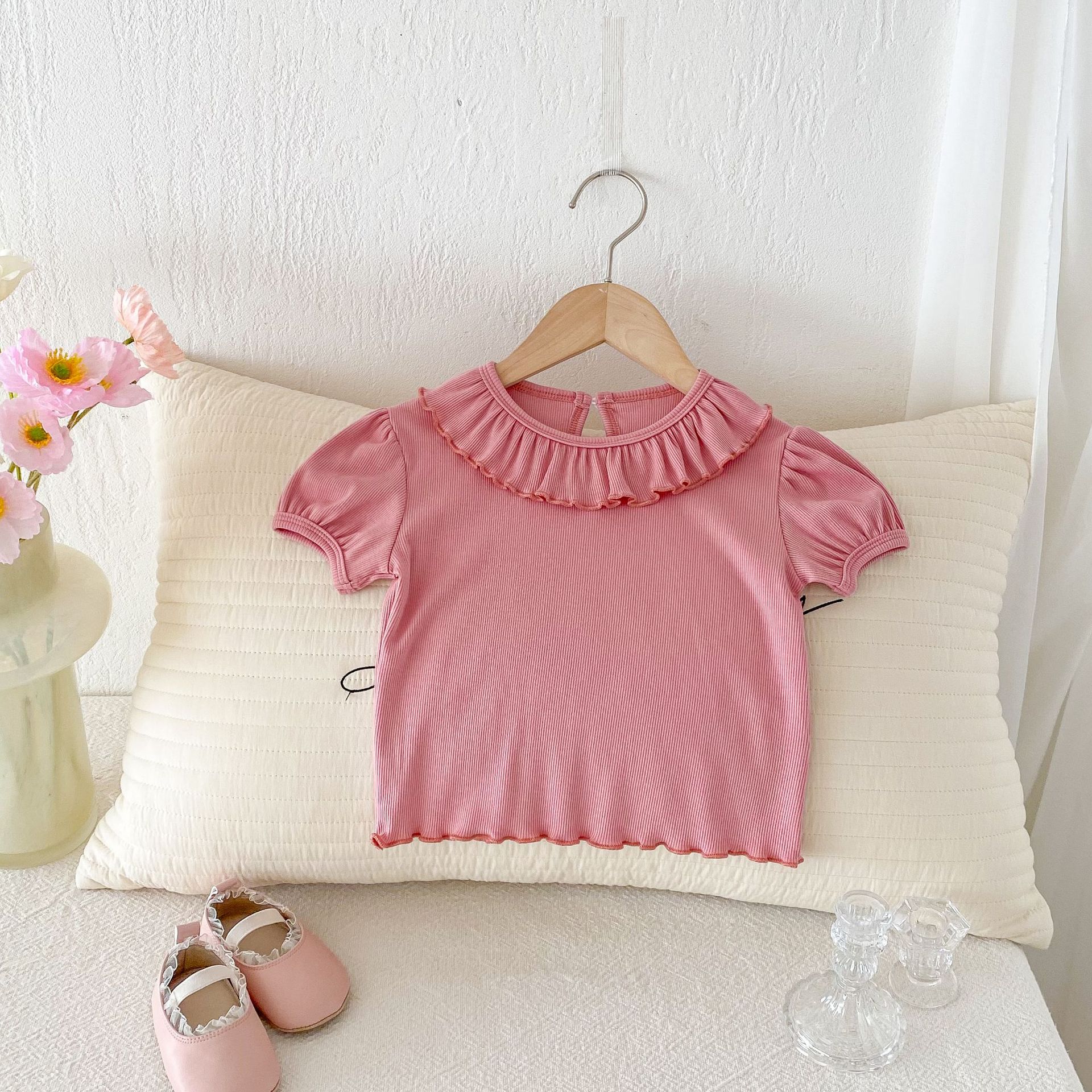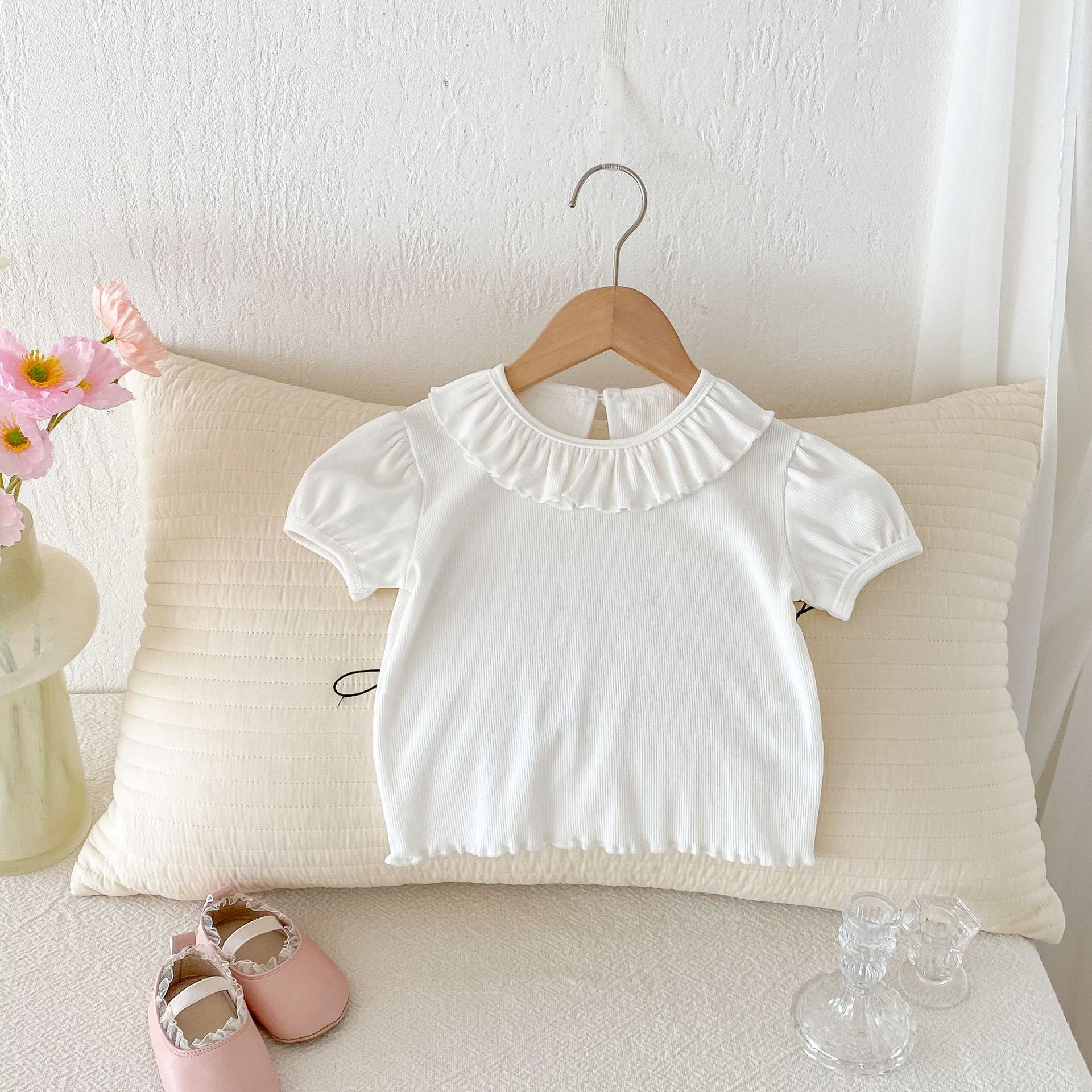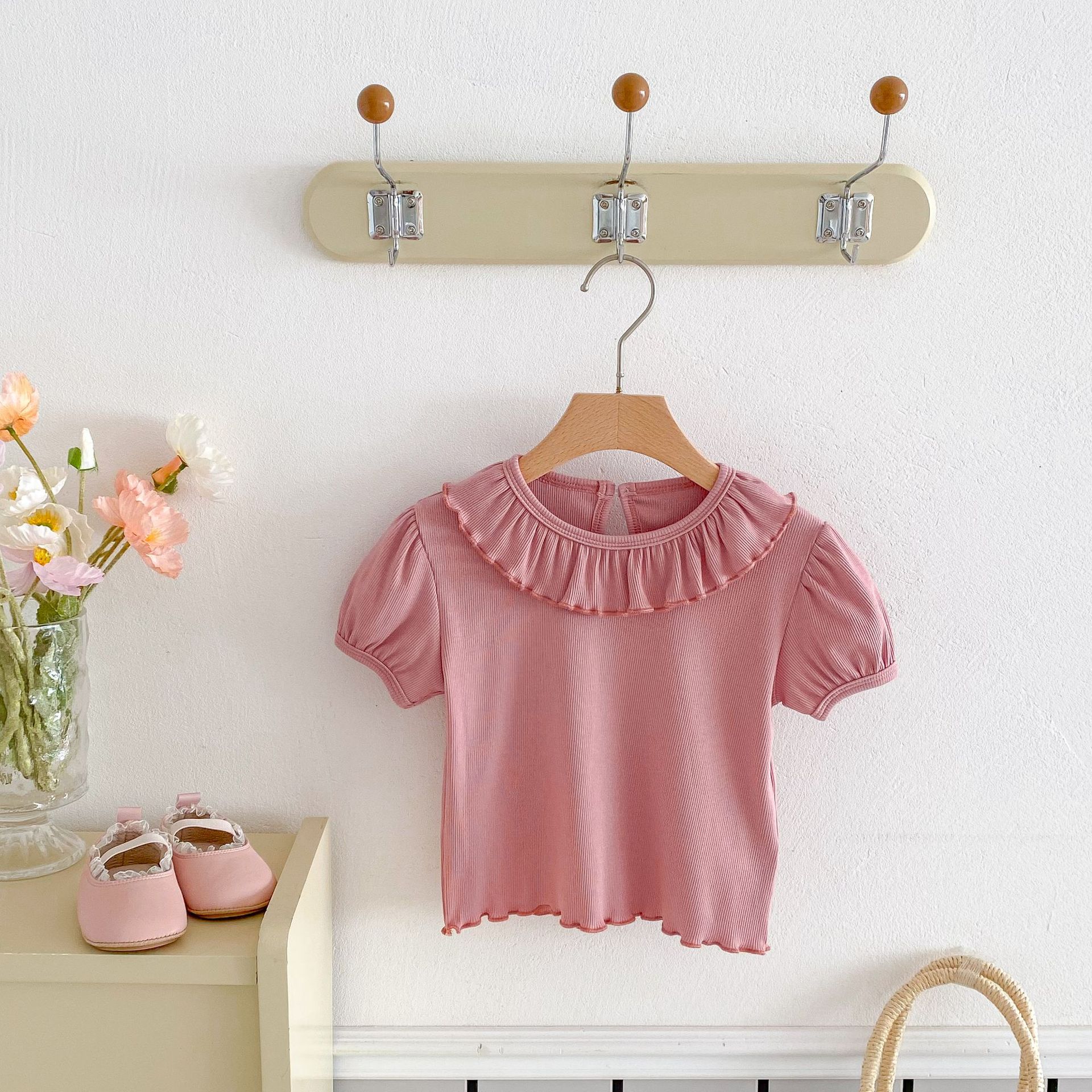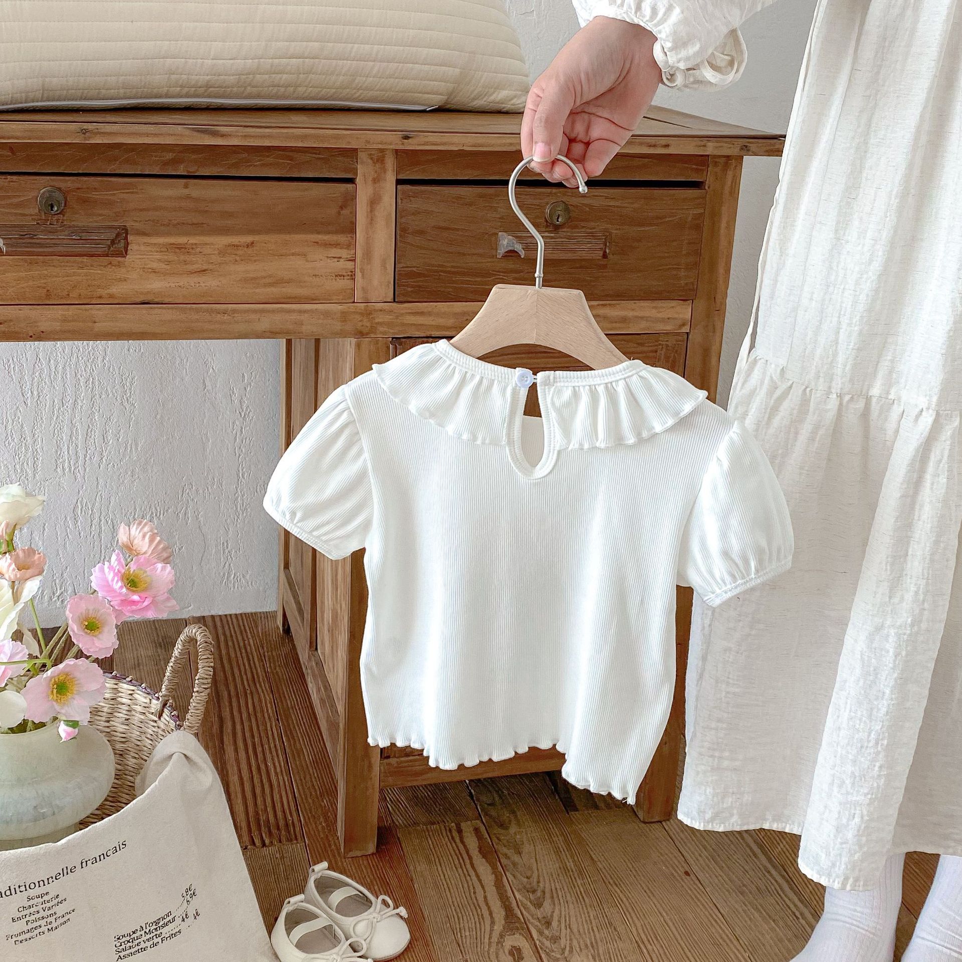 여름 한국 아동복 상의 2025 신상 스트라이프 라펠 반팔 패셔너블하고 다재다능한 퍼프 슬리브 여아 티셔츠스토어 가기