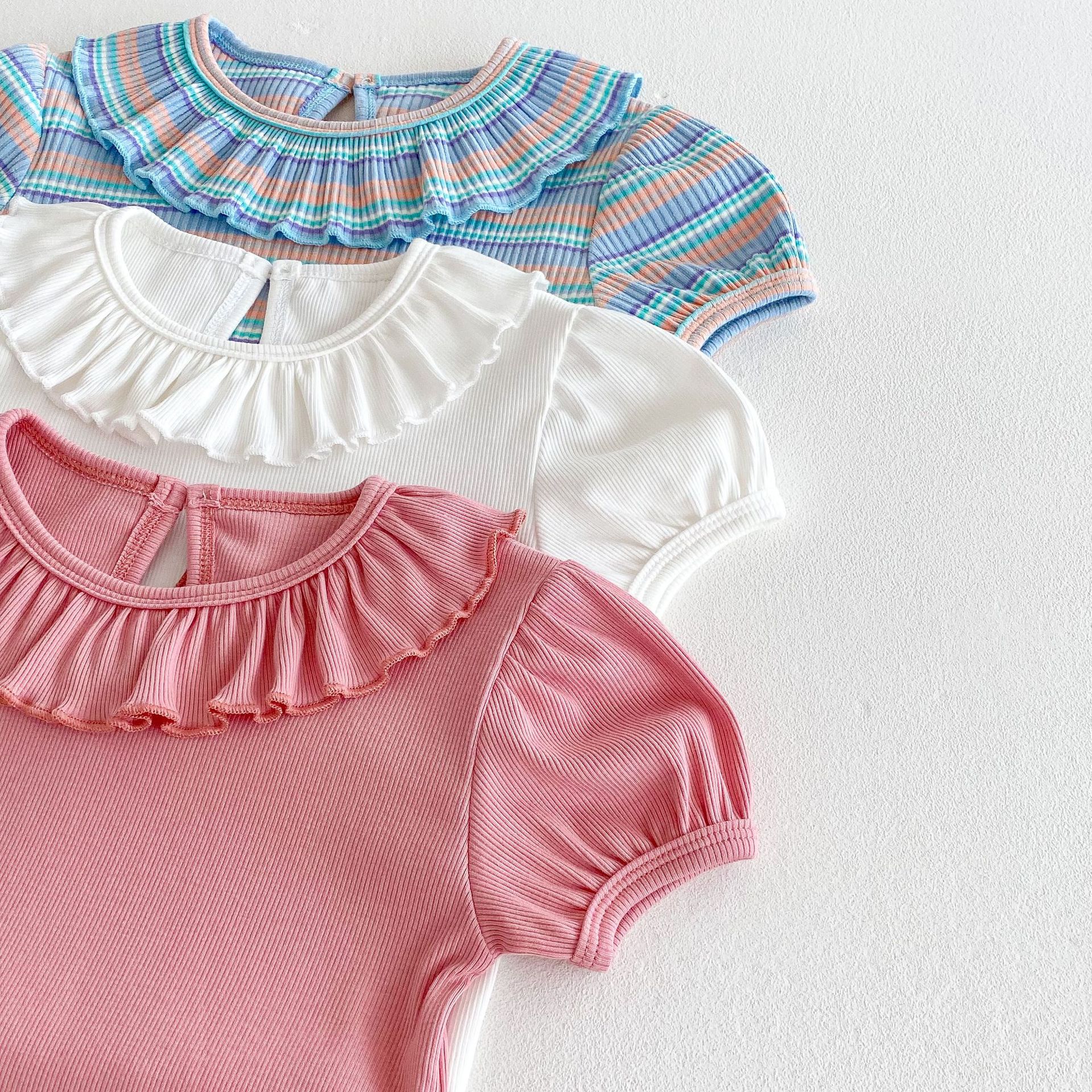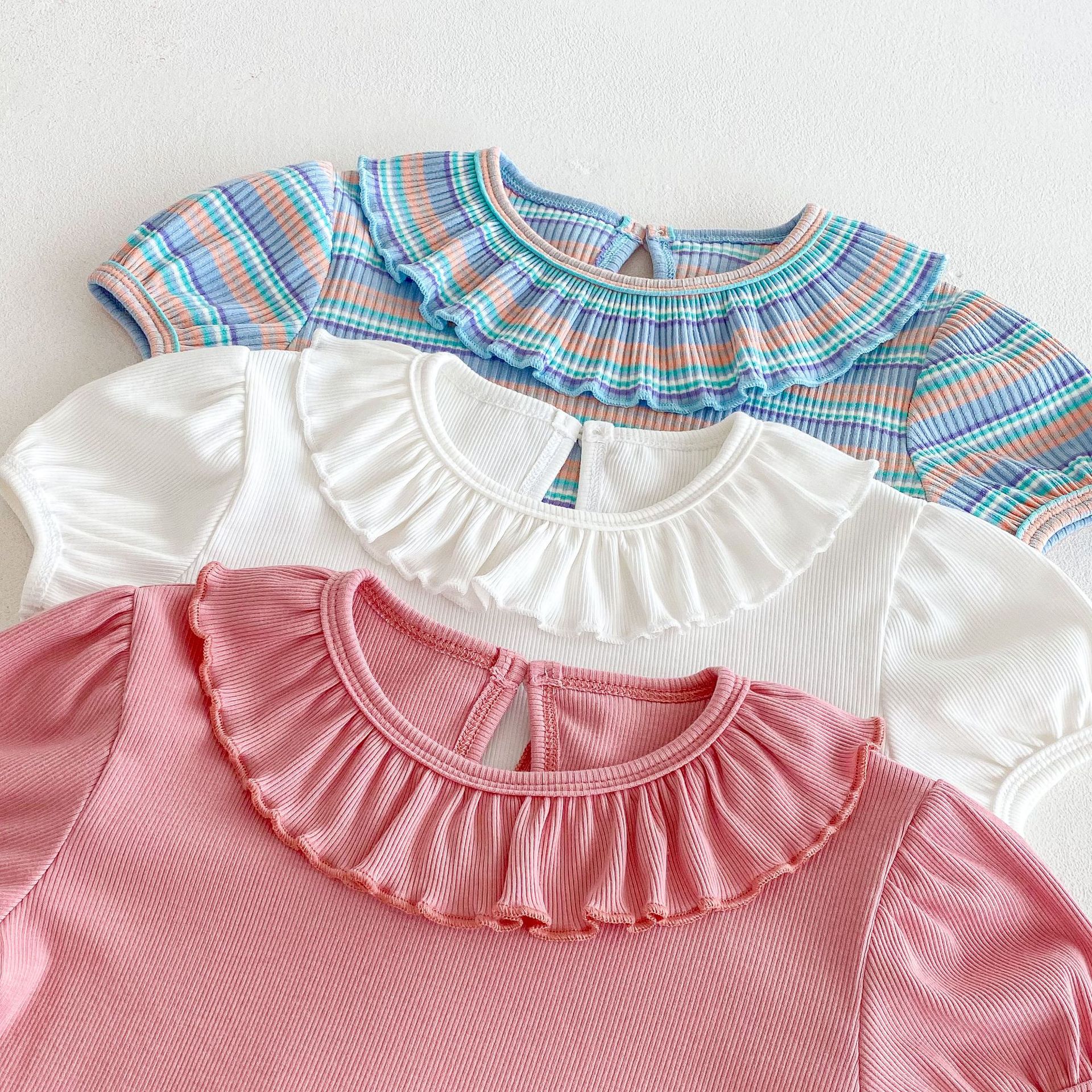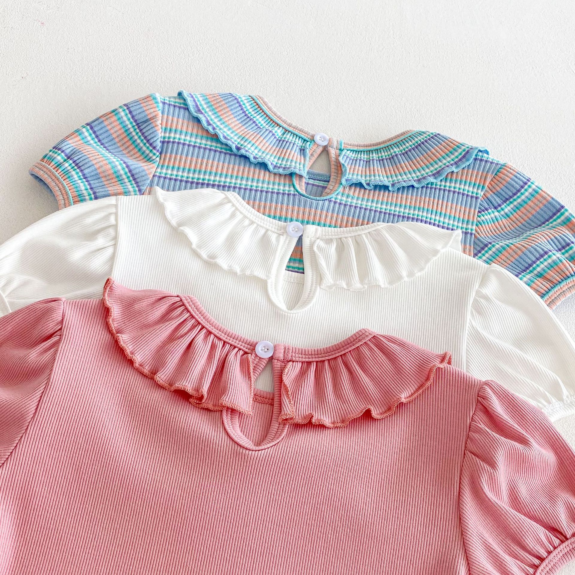 여름 한국 아동복 상의 2025 신상 스트라이프 라펠 반팔 패셔너블하고 다재다능한 퍼프 슬리브 여아 티셔츠