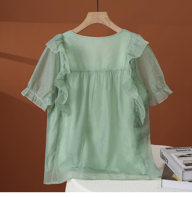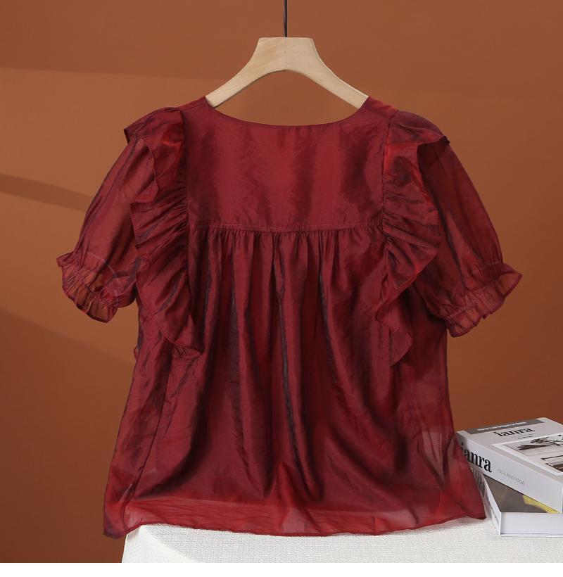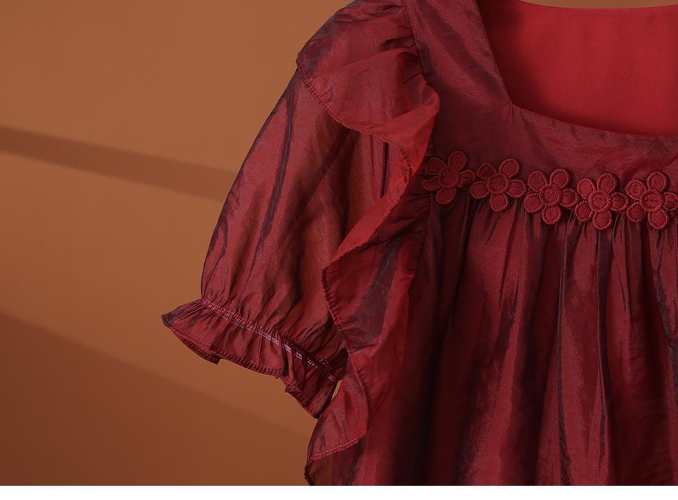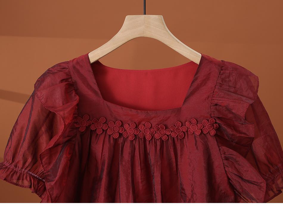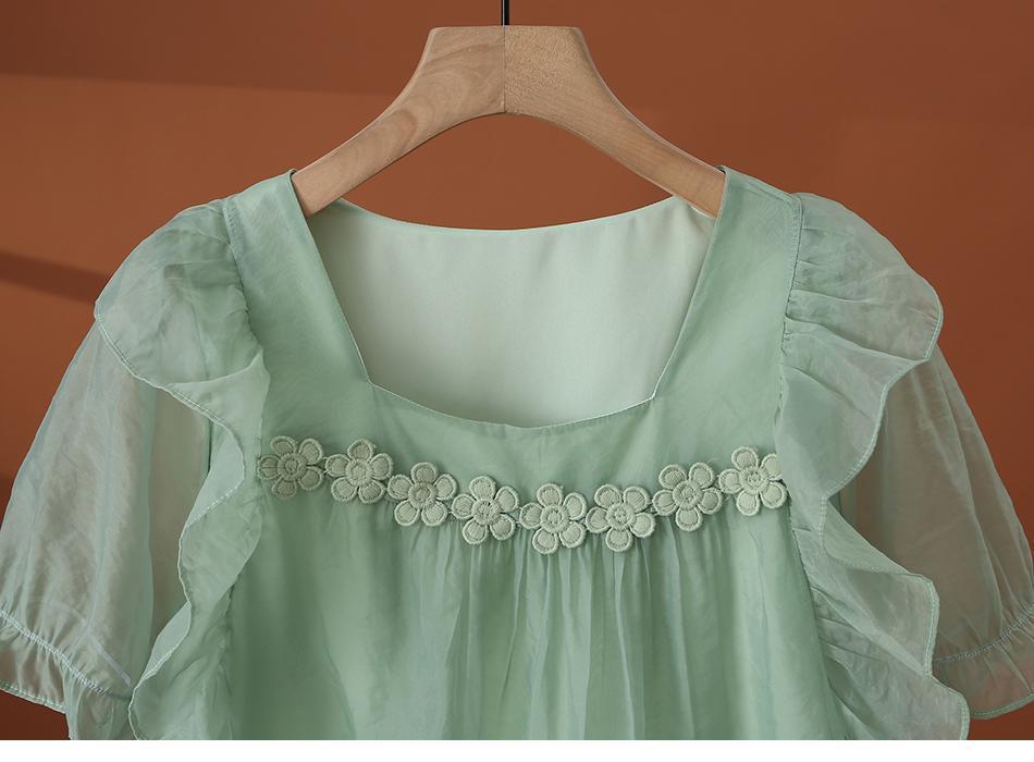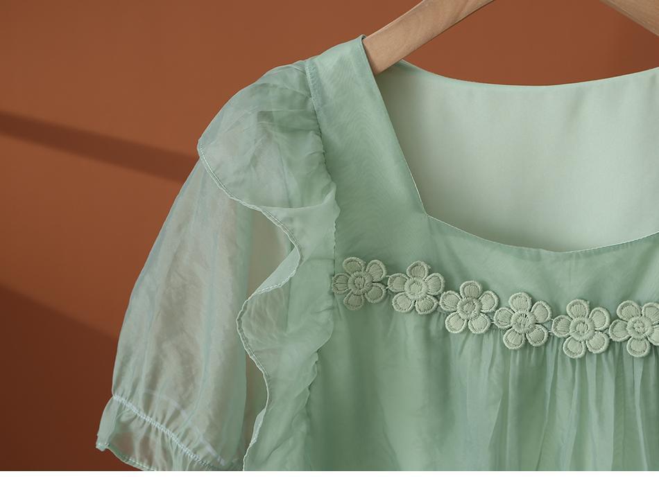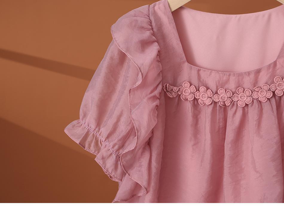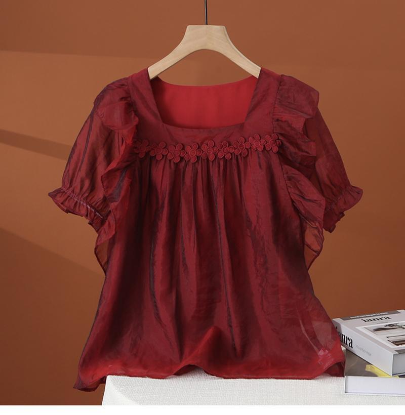 여름 스퀘어 넥 쉬폰 셔츠 여성 반팔 2024 새로운 패션 서양식 레이스 꽃스토어 가기