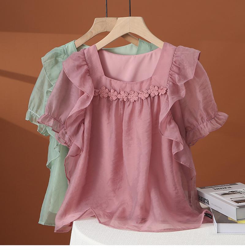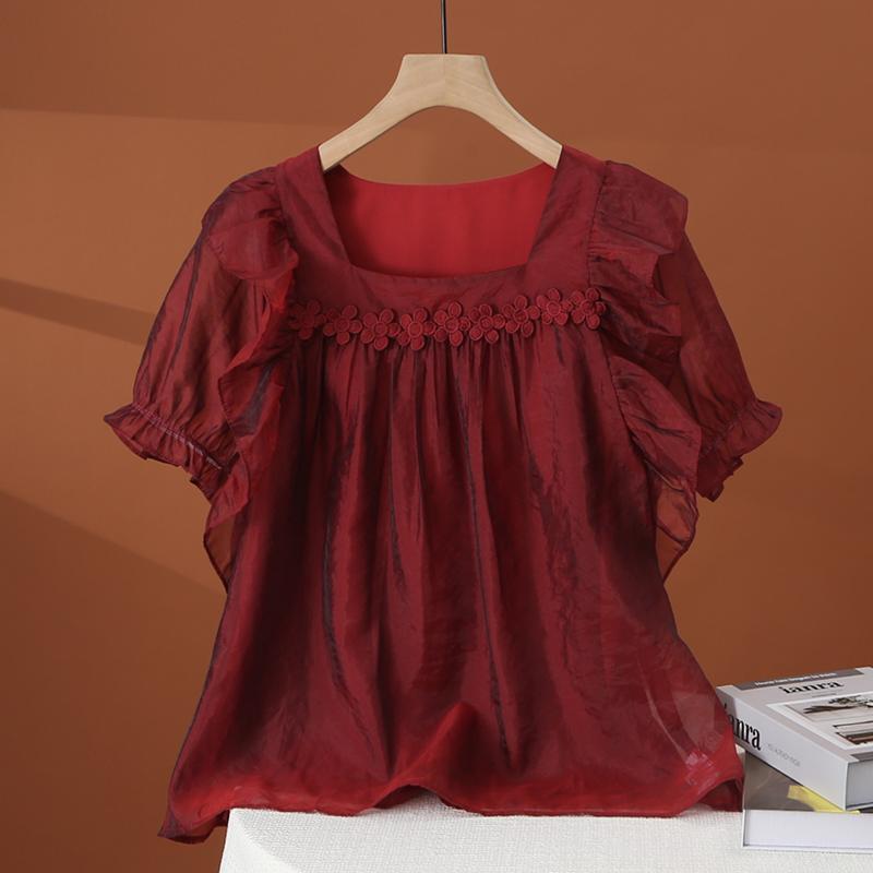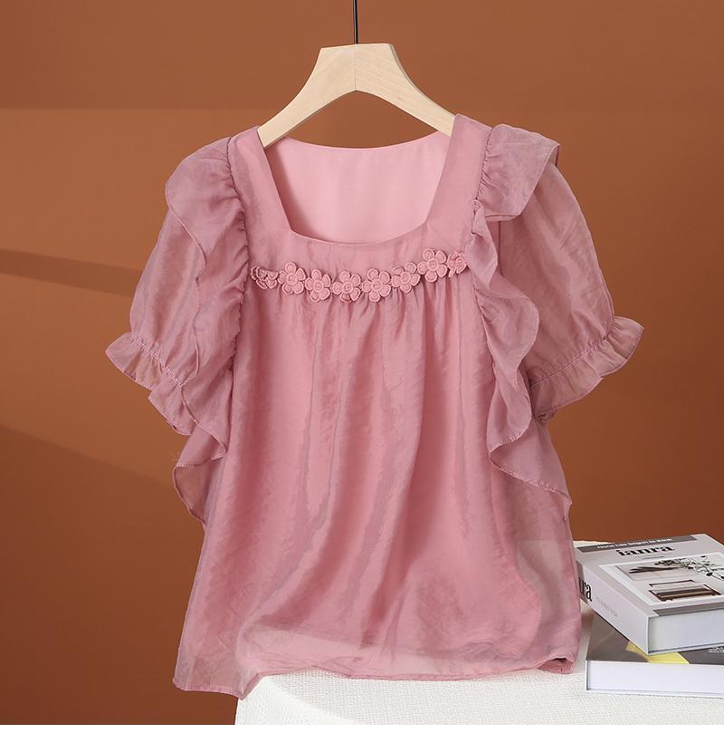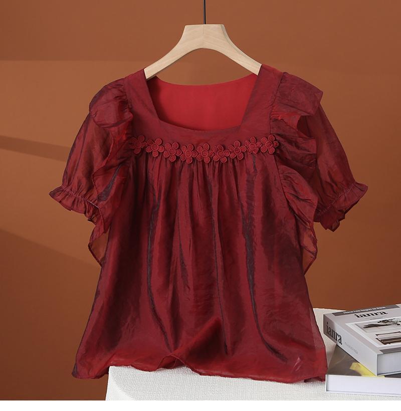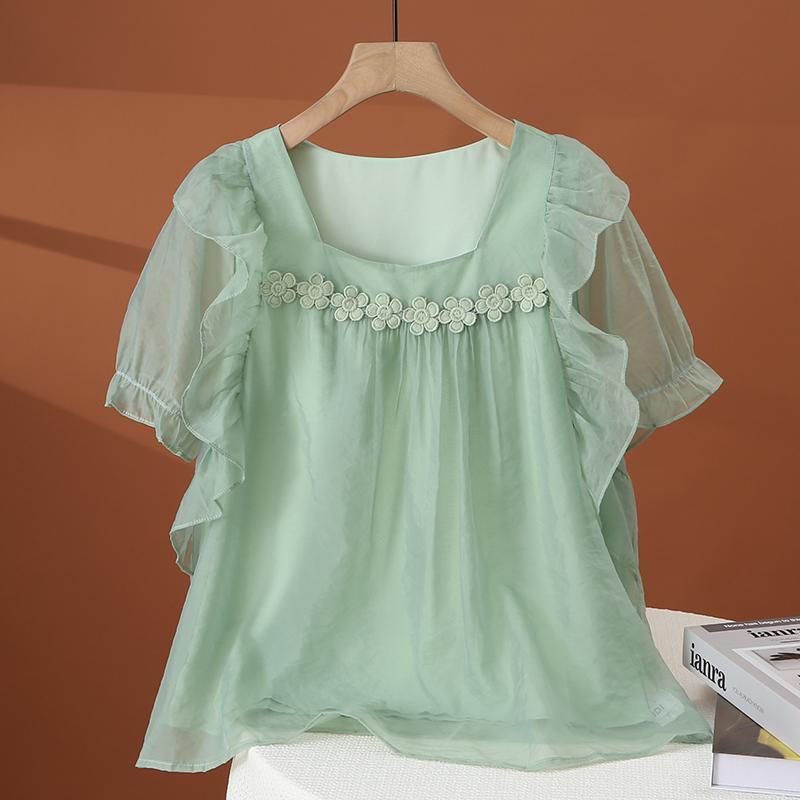여름 스퀘어 넥 쉬폰 셔츠 여성 반팔 2024 새로운 패션 서양식 레이스 꽃
