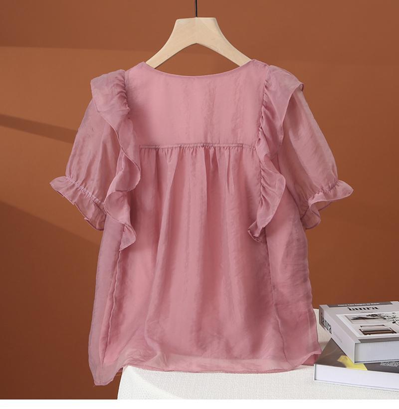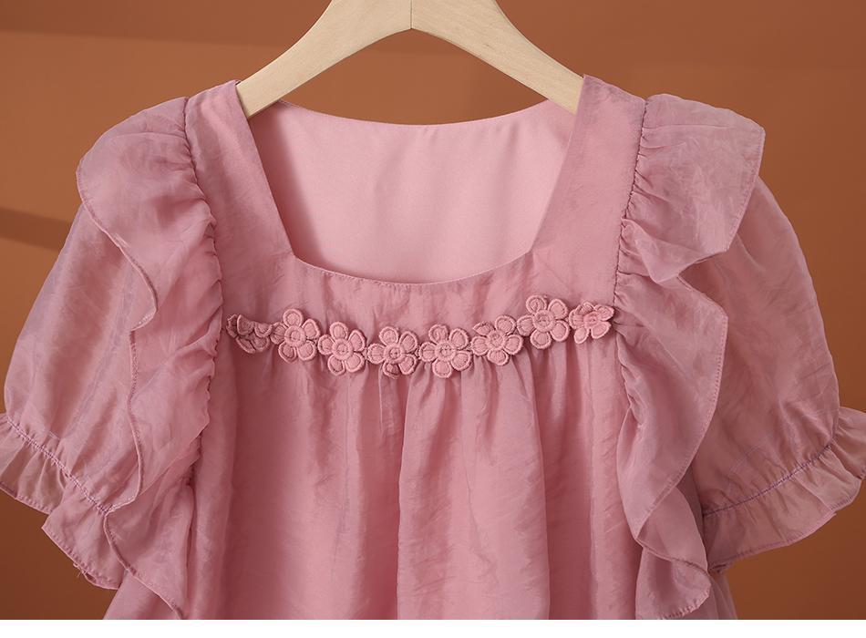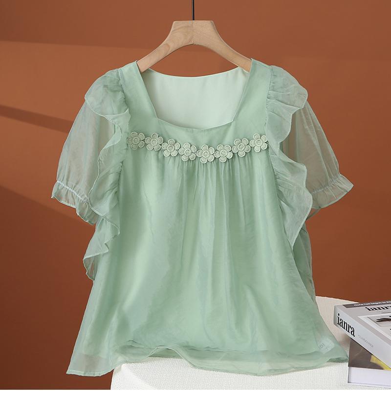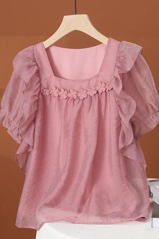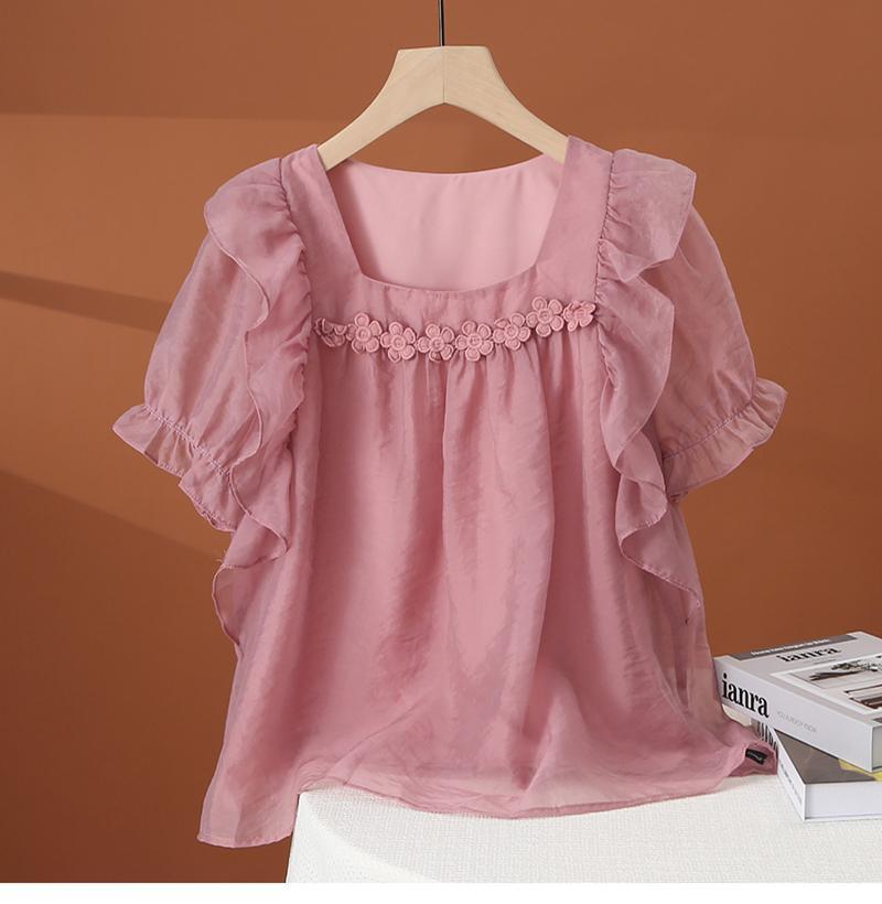 여름 스퀘어 넥 쉬폰 셔츠 여성 반팔 2024 새로운 패션 서양식 레이스 꽃