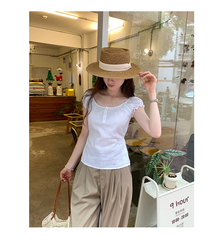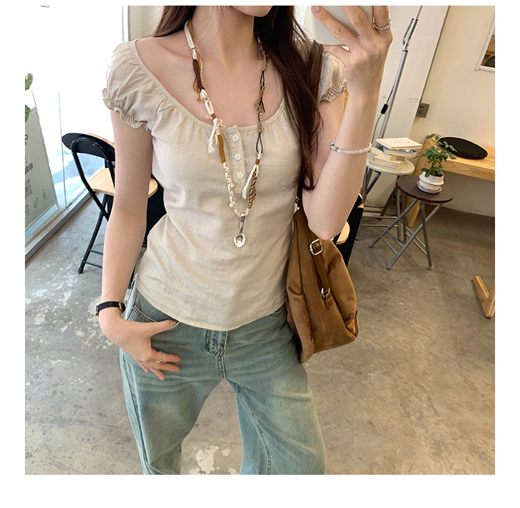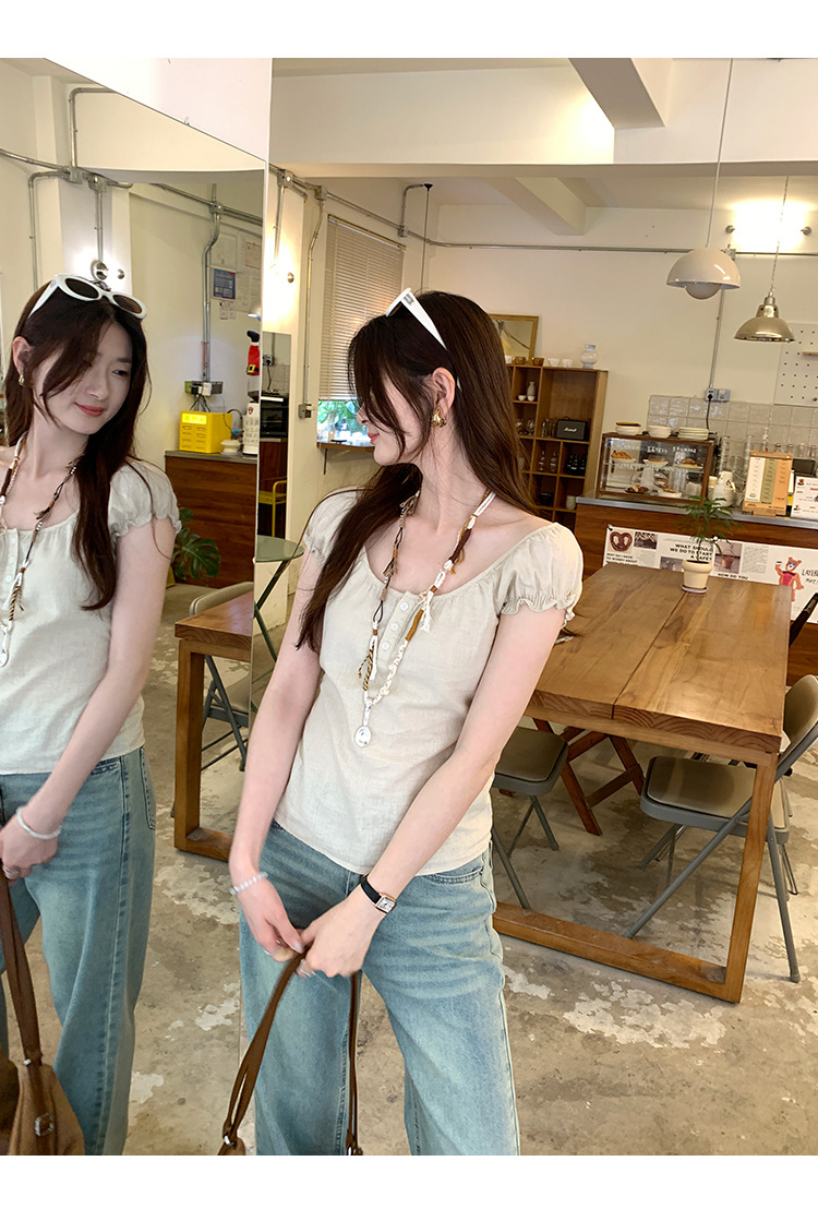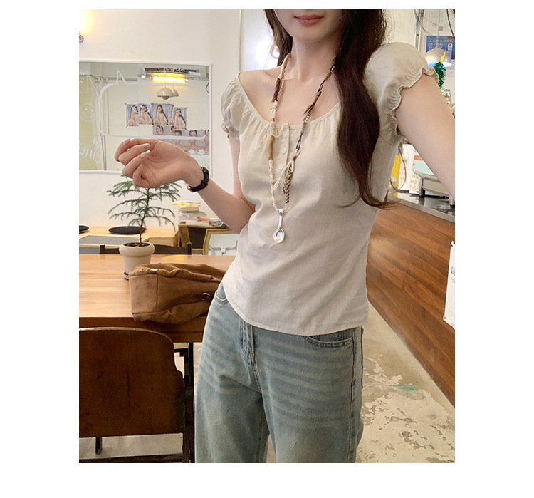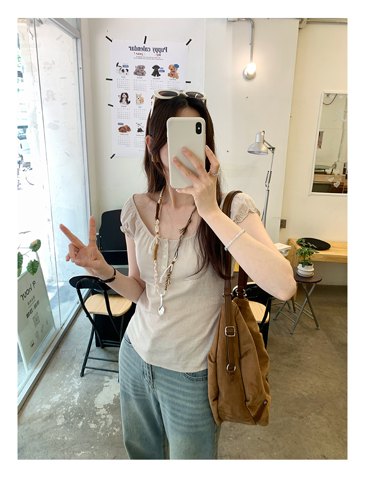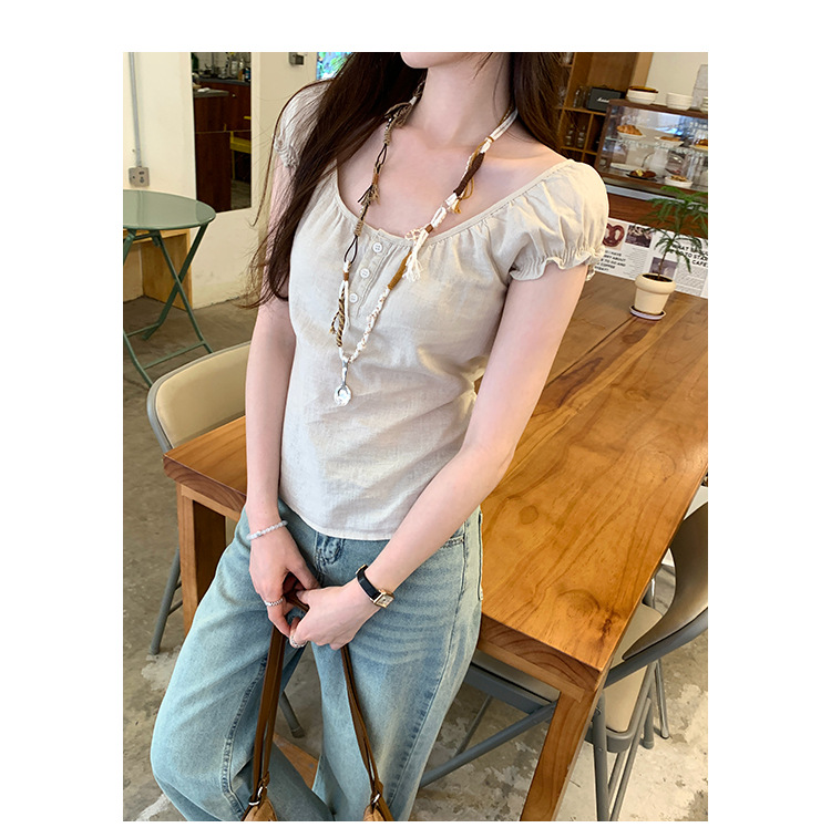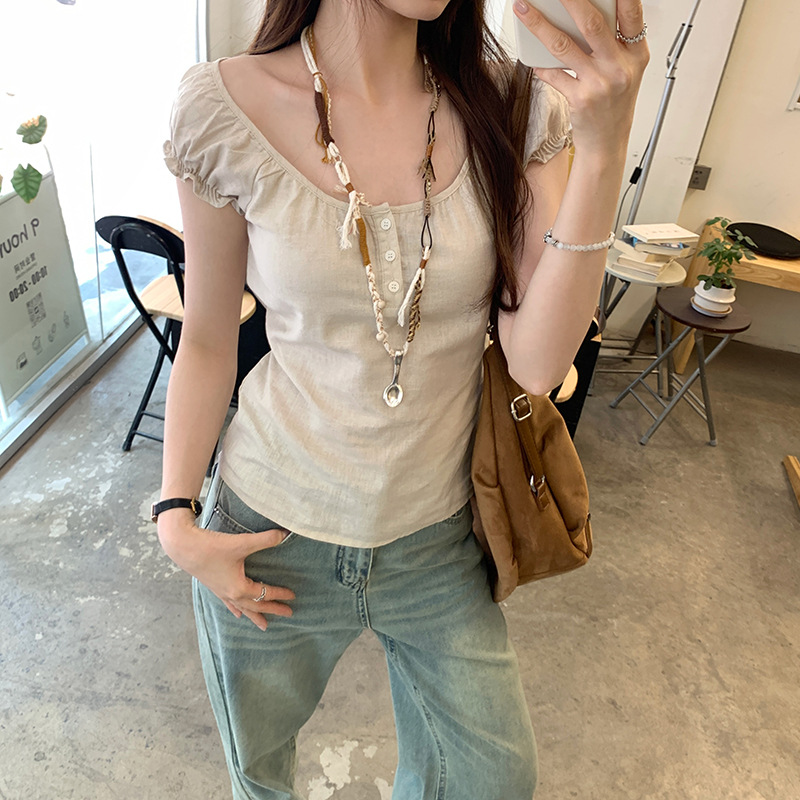프랑스 스타일의 우아한 라미 퍼프 슬리브 슬림 핏 반팔 티셔츠 여성용 2025 년 여름 새로운 아름다운 싱글 웨어 스몰 탑