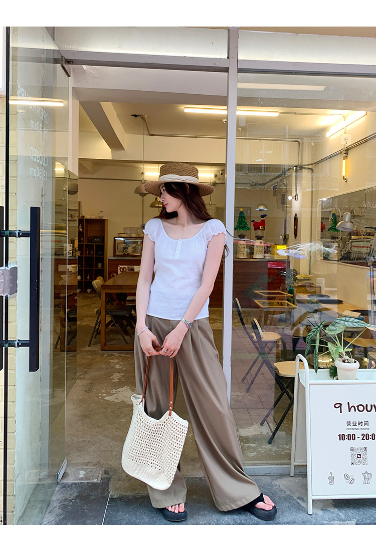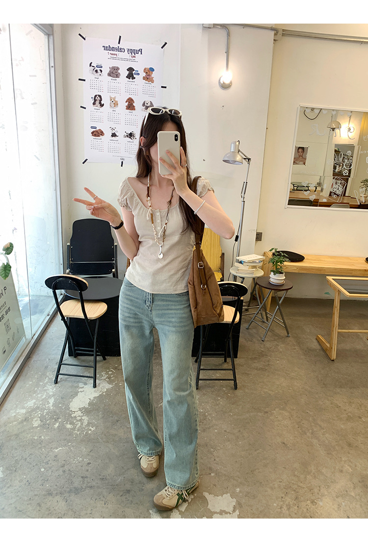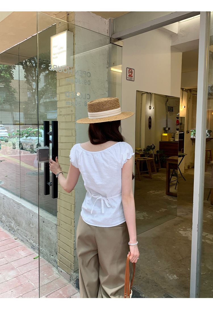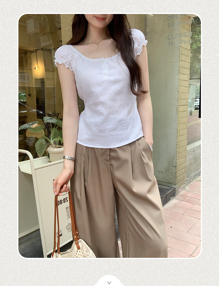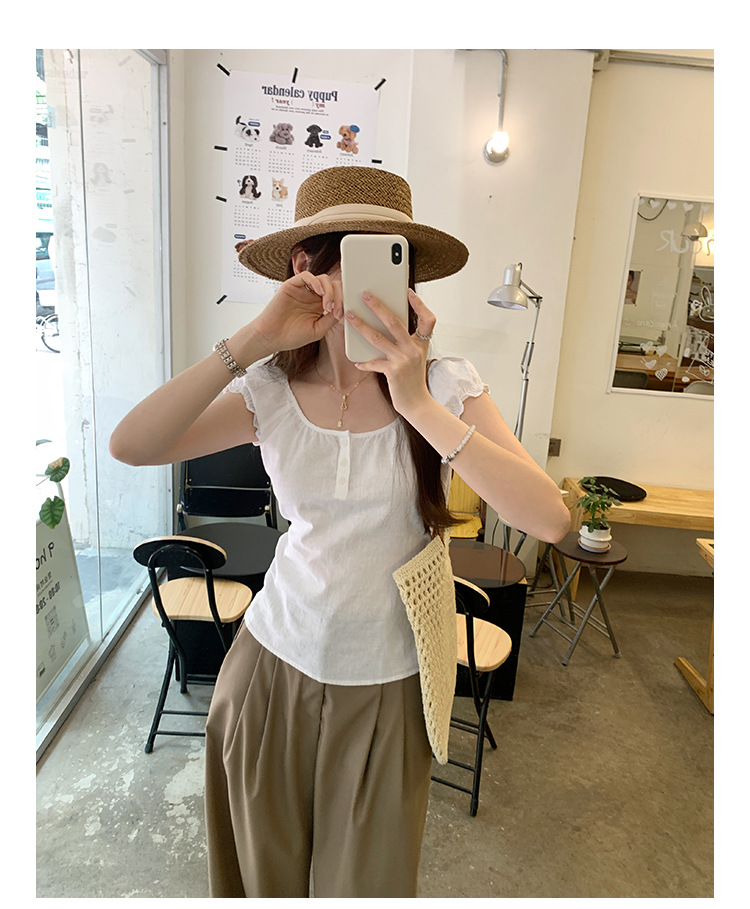 프랑스 스타일의 우아한 라미 퍼프 슬리브 슬림 핏 반팔 티셔츠 여성용 2025 년 여름 새로운 아름다운 싱글 웨어 스몰 탑스토어 가기