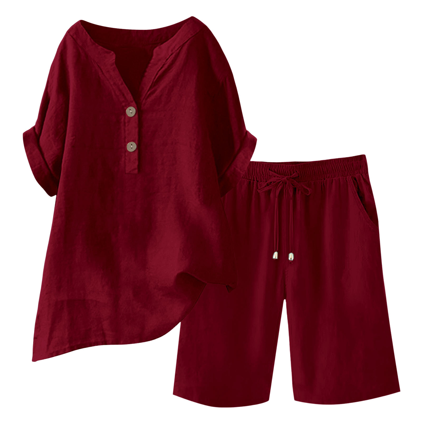 2025 Amazon 유럽과 미국 여름 느슨한 여성 면화 및 린넨 v 넥 반팔 + 드로스트링 포켓 반바지 세트