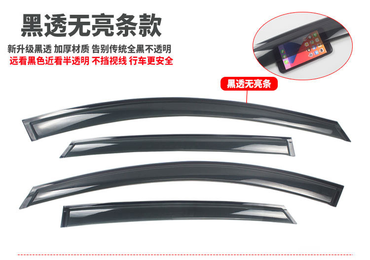 本公司雨挡主要为:黑透无亮条款和3D立体亮条款,专车专用,车型齐全。
