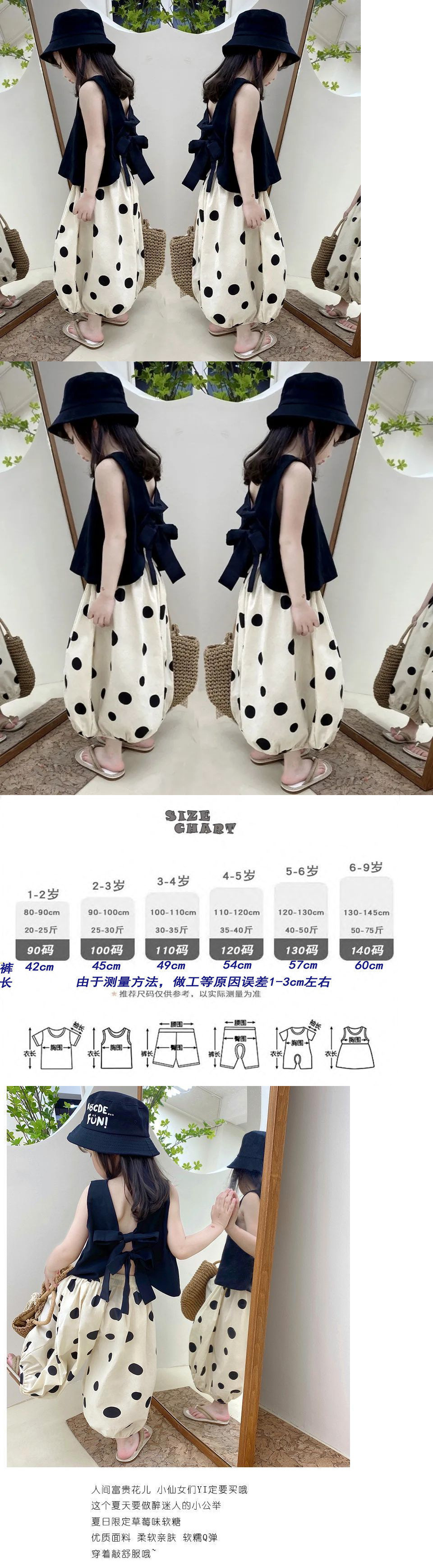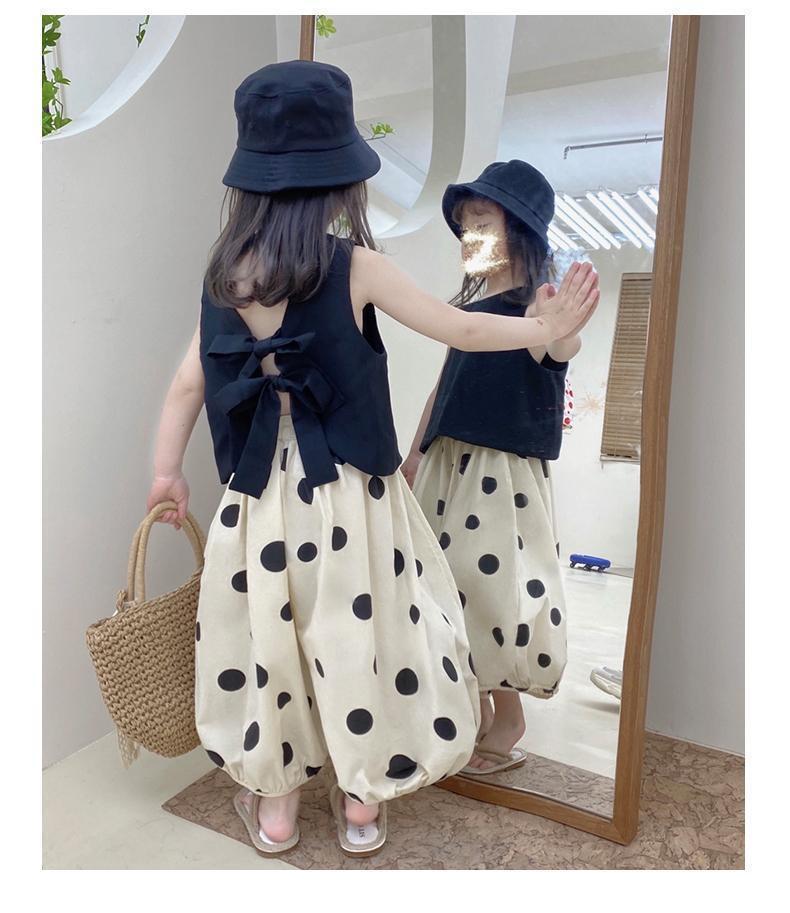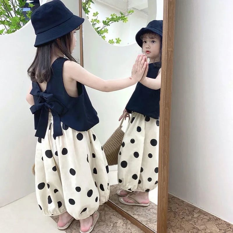 여아 정장 여름 옷 2024 새로운 투피스 조끼 반팔 캐주얼 블루머 얇은 폴카 도트 와이드 팬츠 유행스토어 가기