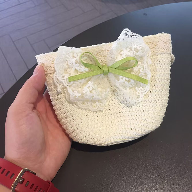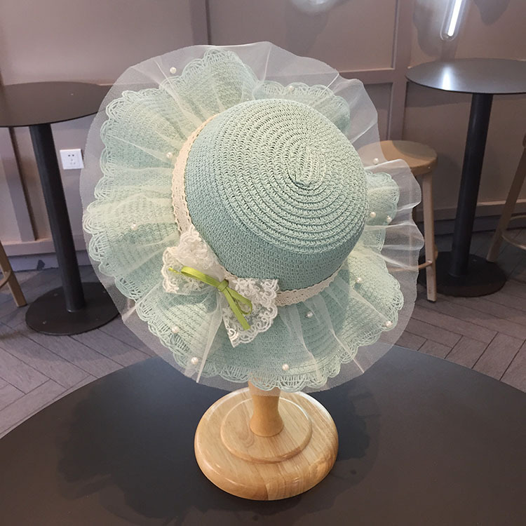 여름 소녀 레이스 진주 녹색 활 공주 스타일 큰 챙 해변 모자 태양 보호 어부 모자 밀짚 모자