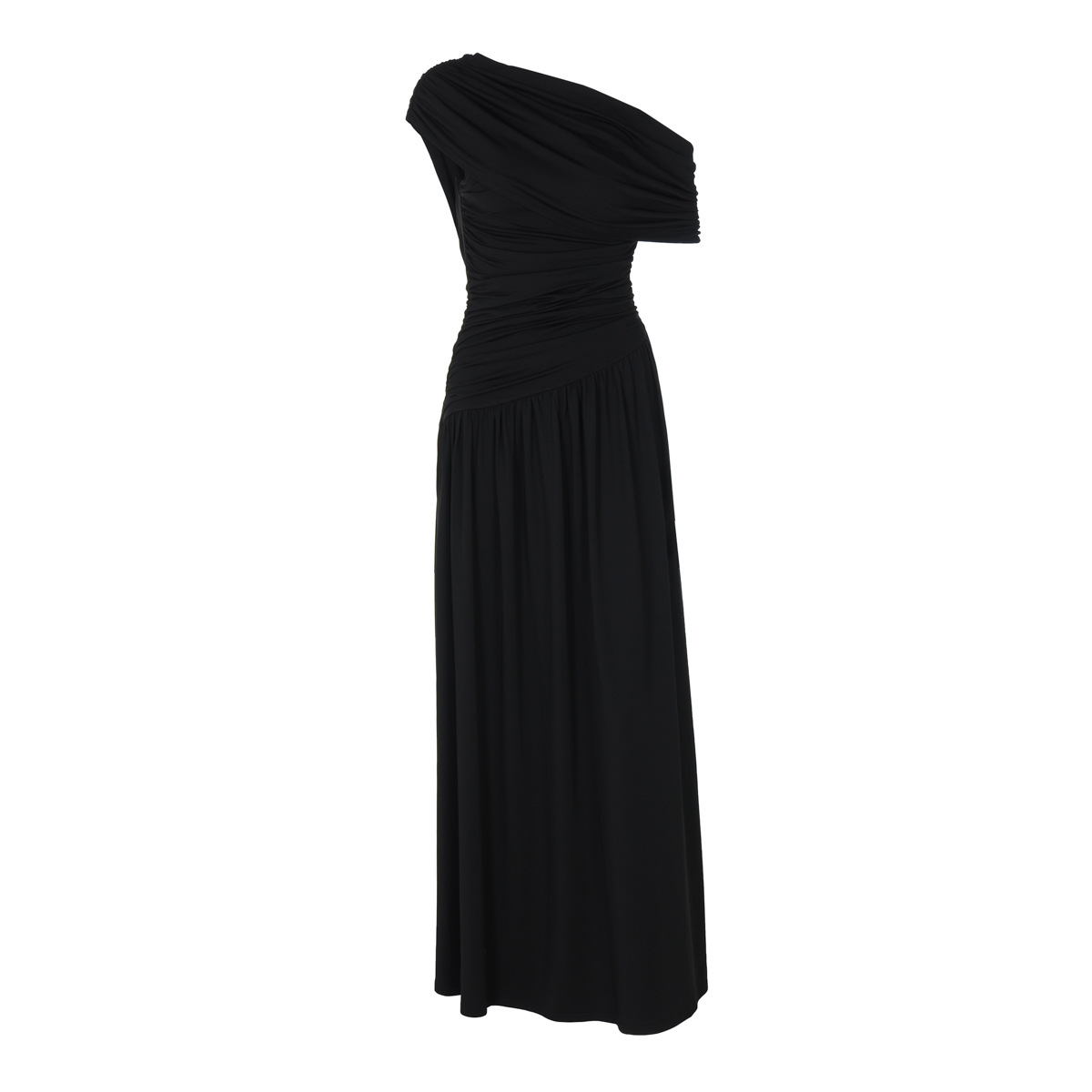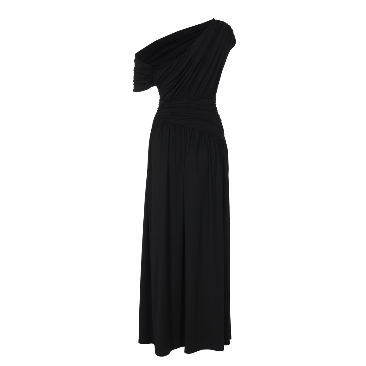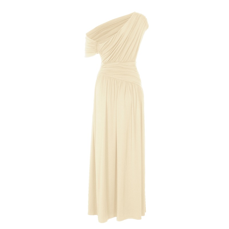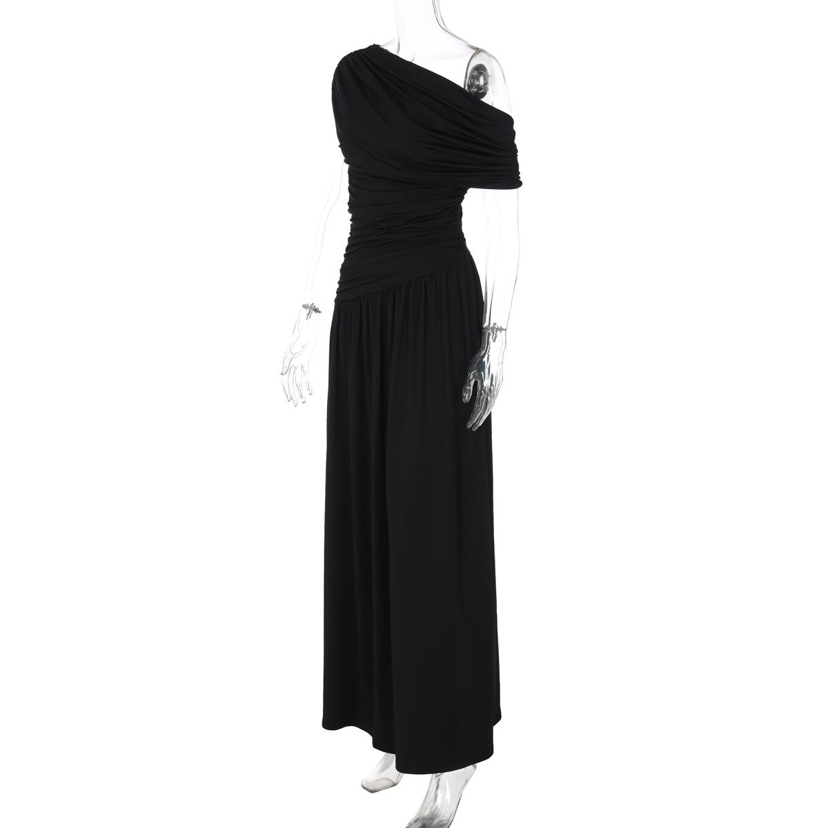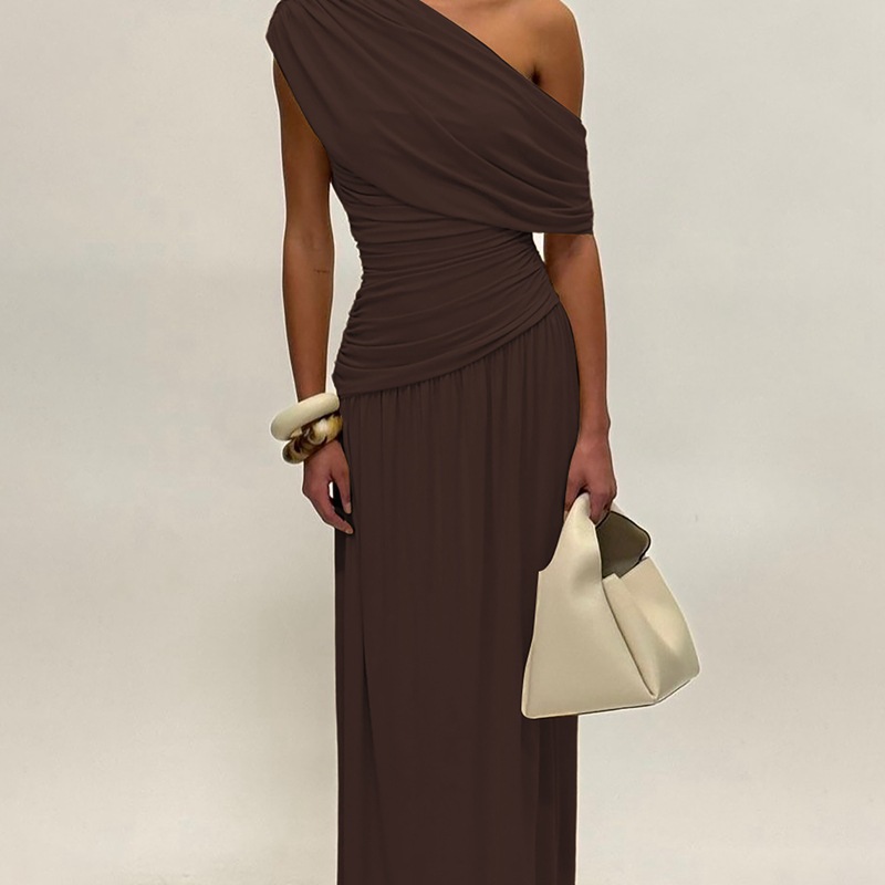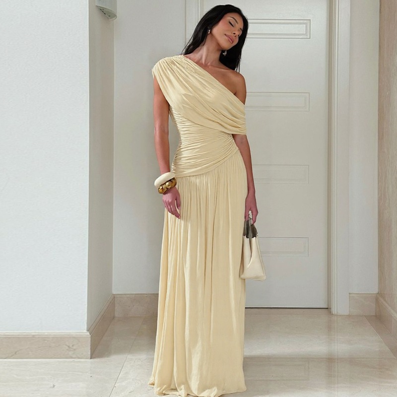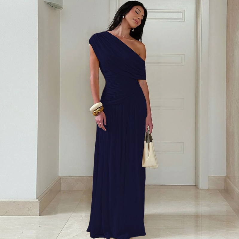 유럽과 미국에서 인기 있는 여성복 2026 봄 신상품 패셔너블하고 섹시한 사선 넥라인 주름 장식 불규칙 솔리드 컬러 원피스 도매스토어 가기