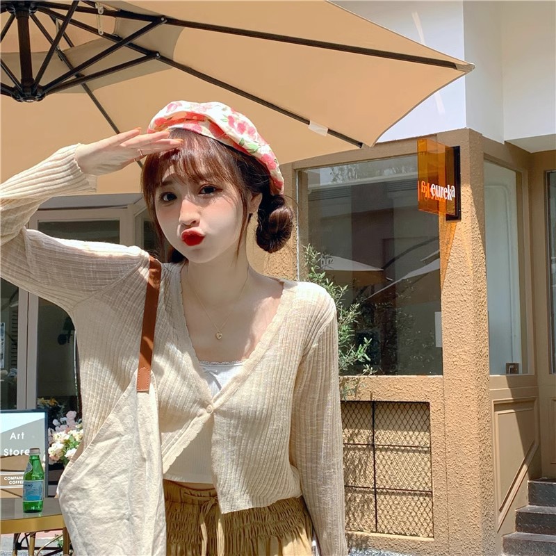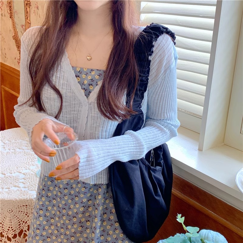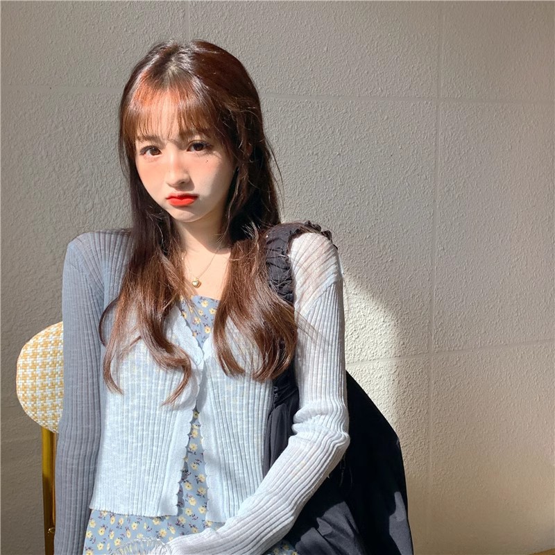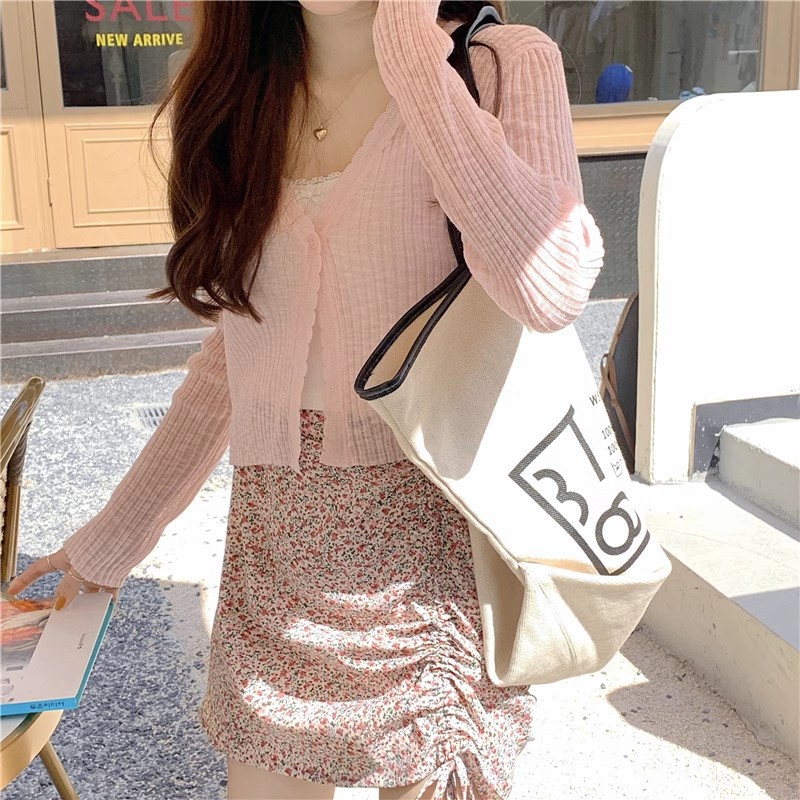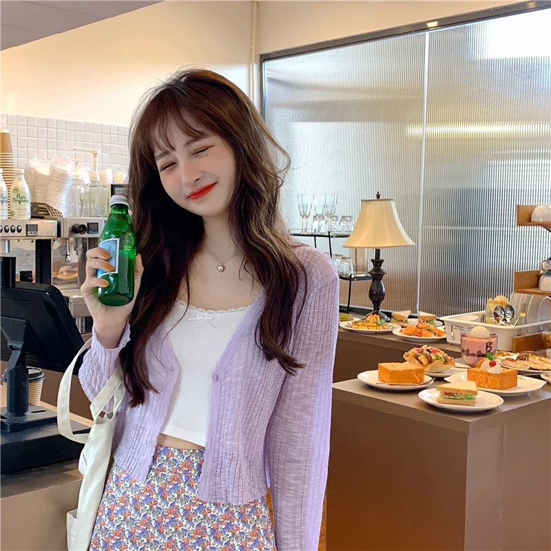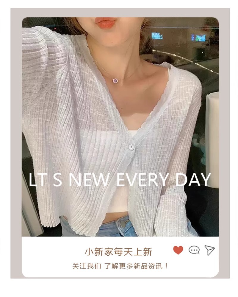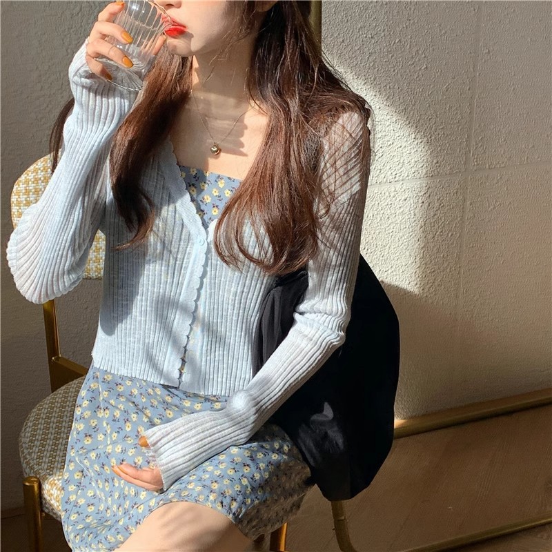 여름 얇은 V 넥 니트 카디건 여성용 에어컨 셔츠 숄더 아웃 매치하는 긴 스커트 아이스 실크 툴레 선 스크린 코트스토어 가기