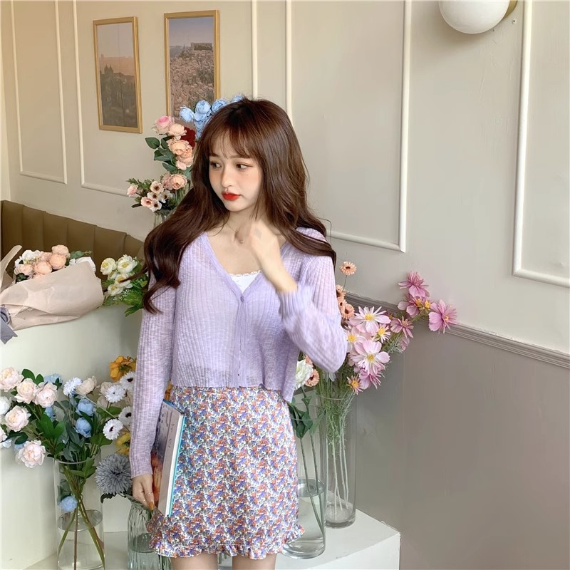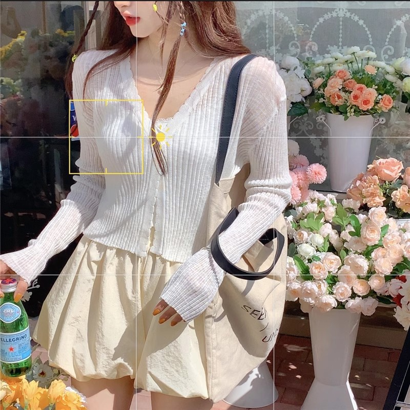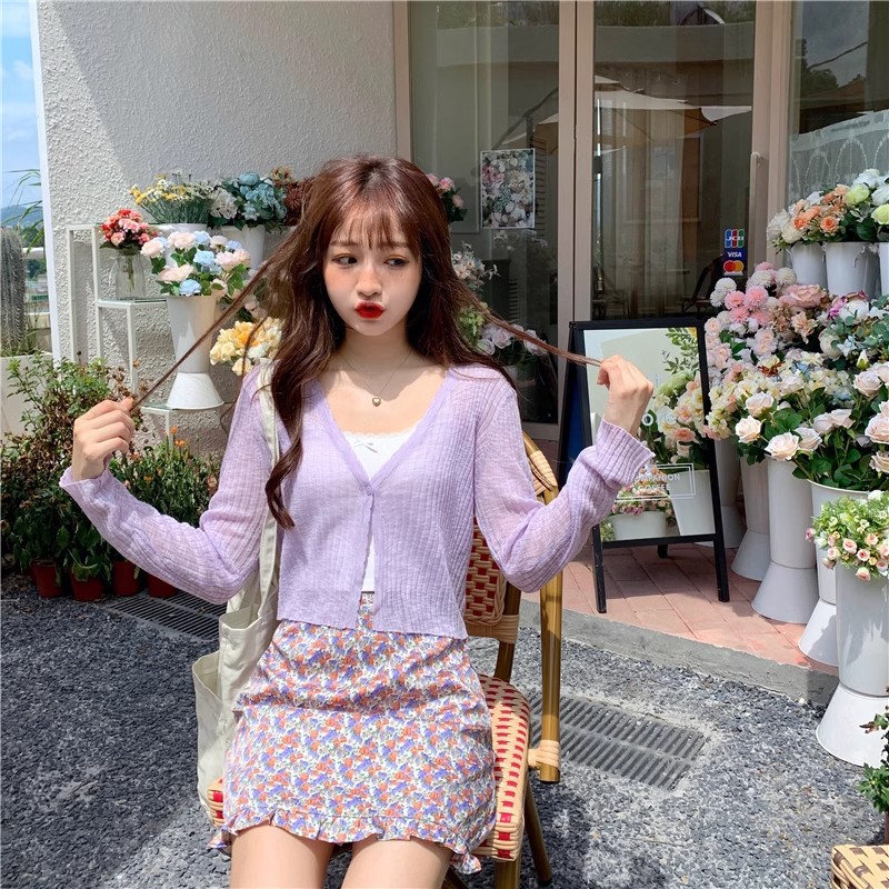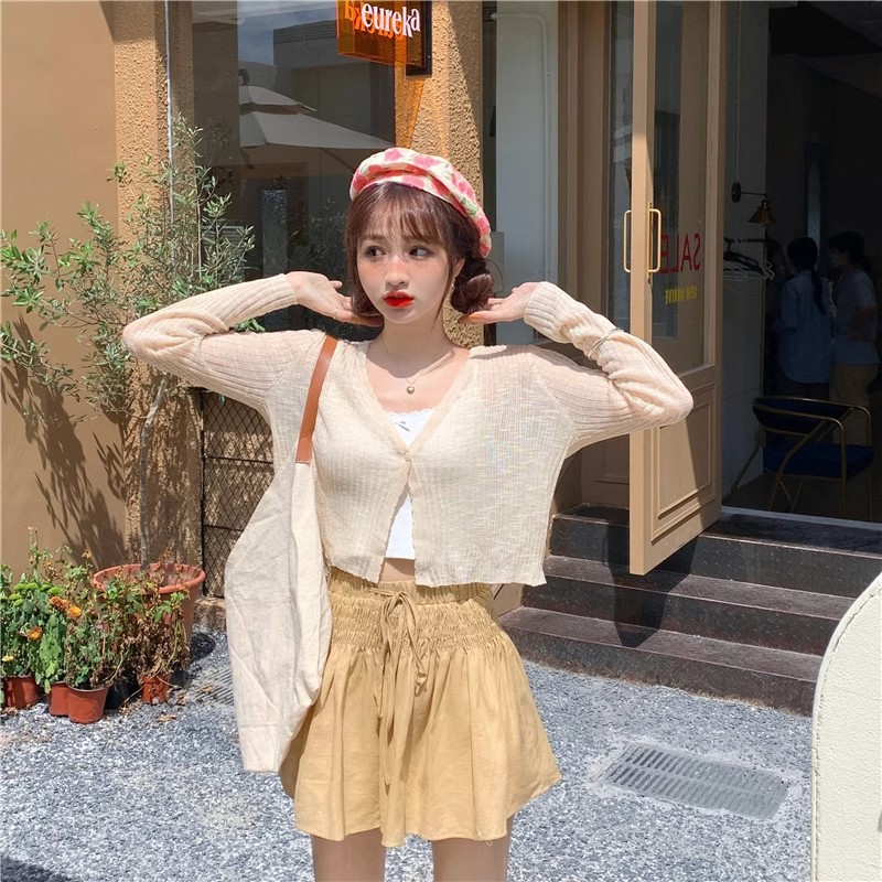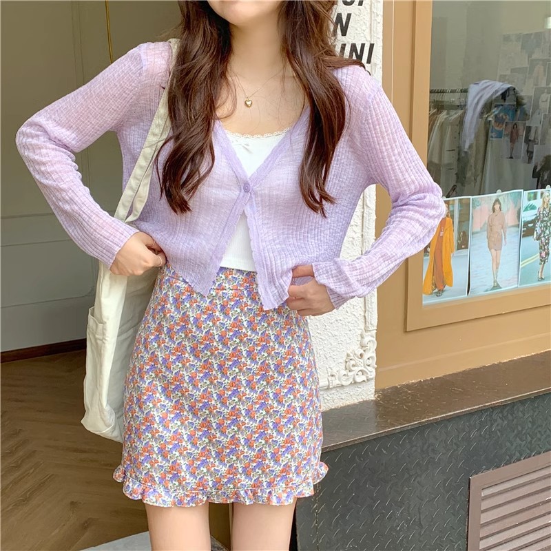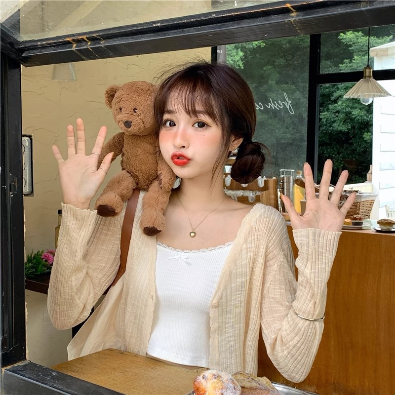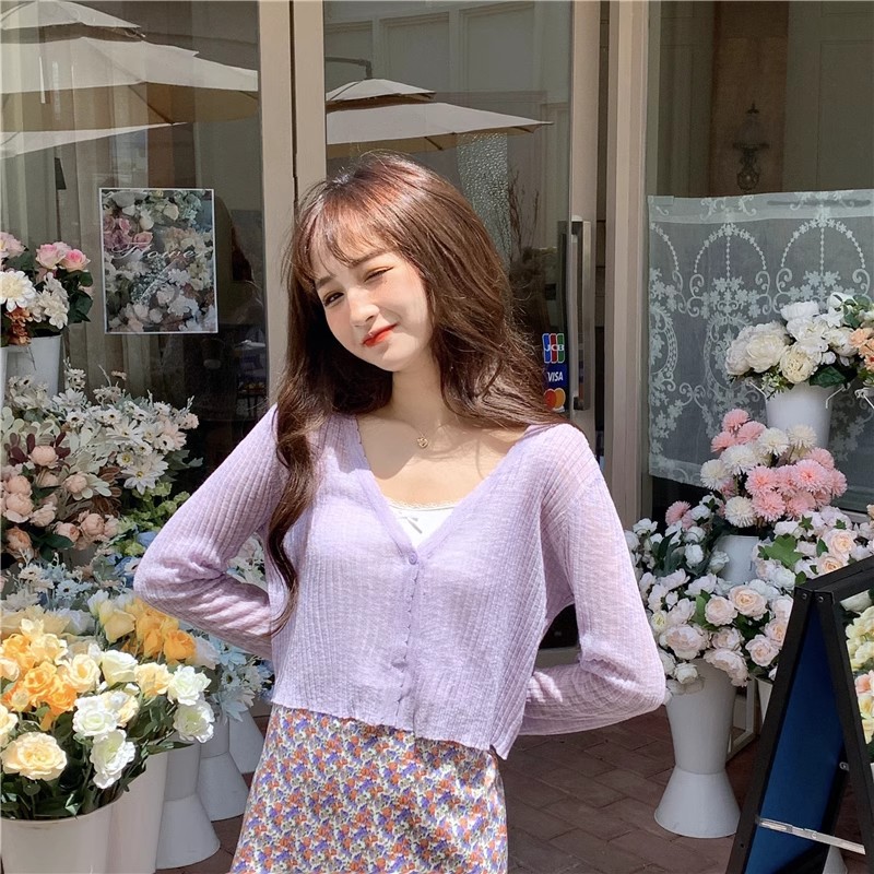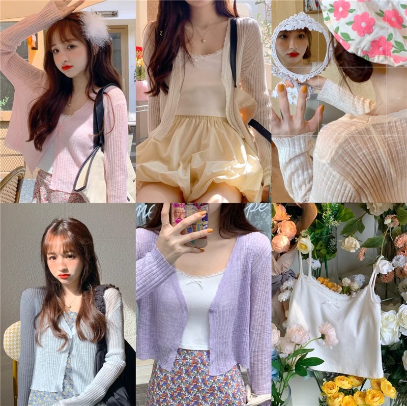 여름 얇은 V 넥 니트 카디건 여성용 에어컨 셔츠 숄더 아웃 매치하는 긴 스커트 아이스 실크 툴레 선 스크린 코트스토어 가기