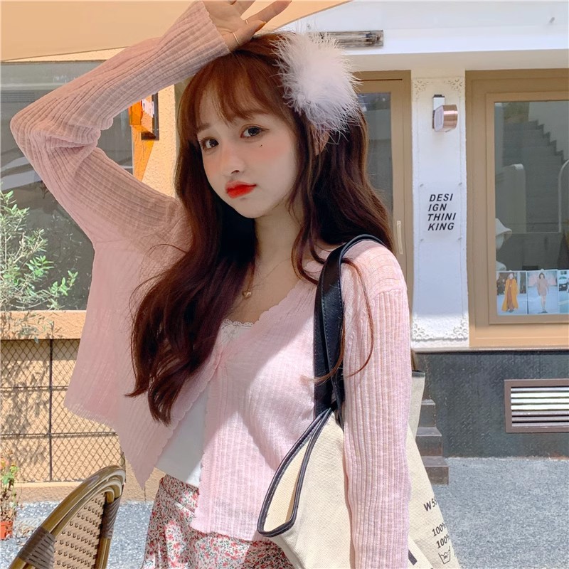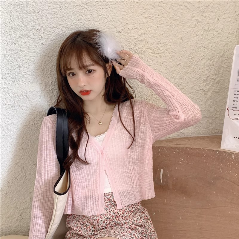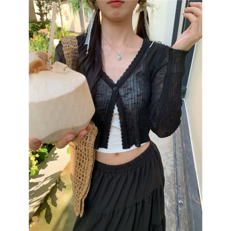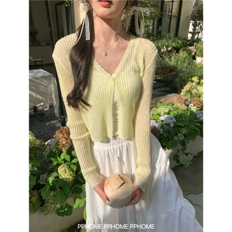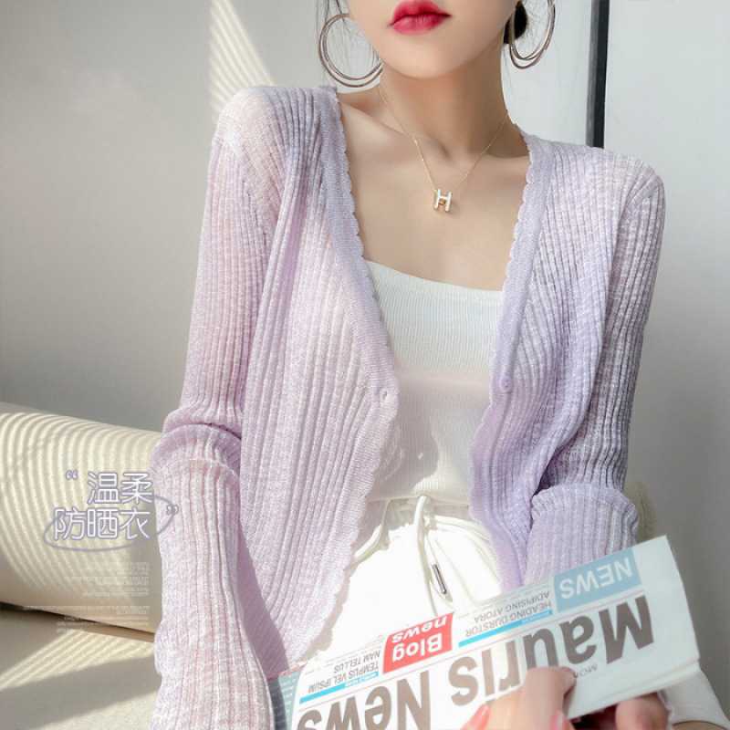 여름 얇은 V 넥 니트 카디건 여성용 에어컨 셔츠 숄더 아웃 매치하는 긴 스커트 아이스 실크 툴레 선 스크린 코트