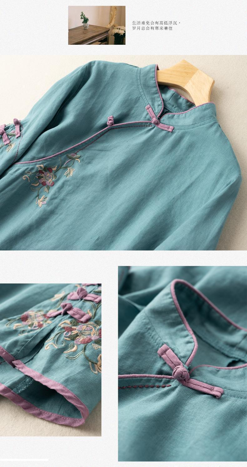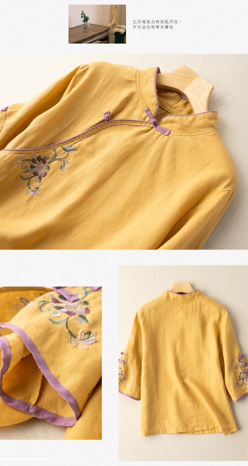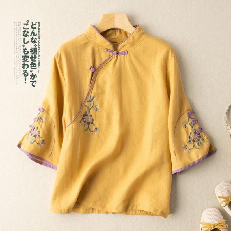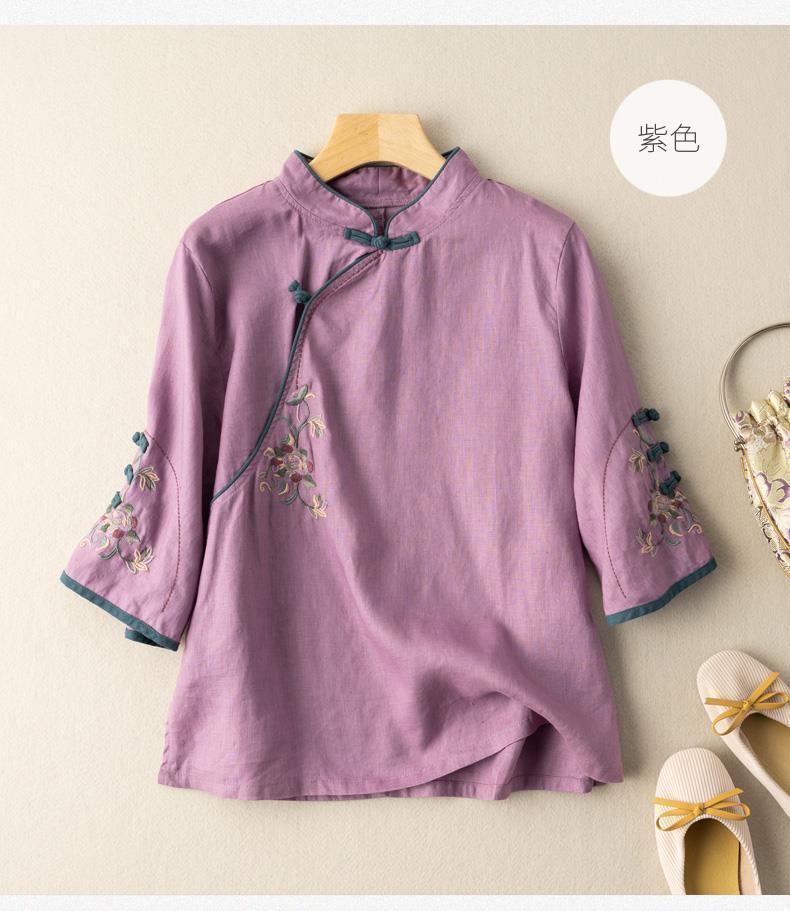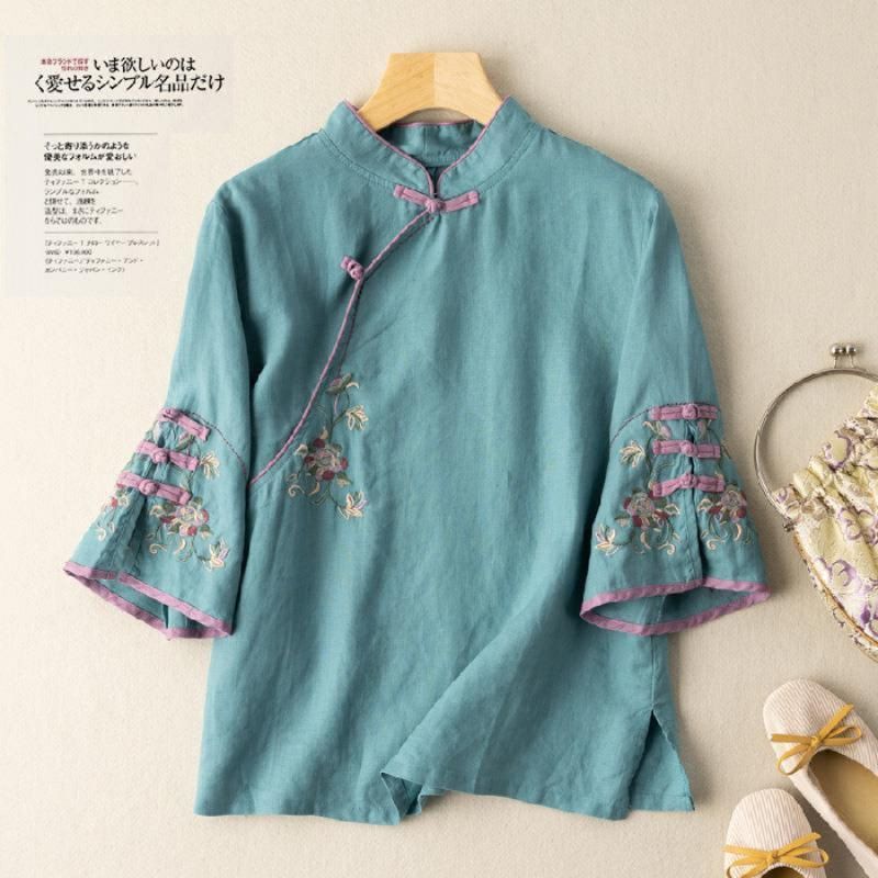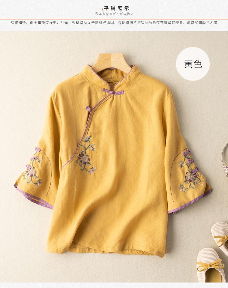 2025 새로운 중국 스타일 복고풍 면화 및 린넨 셔츠 여성 봄, 여름 중국 스타일 스탠드 칼라 버튼 탑 비스듬한 칼라 수 놓은 차 옷스토어 가기