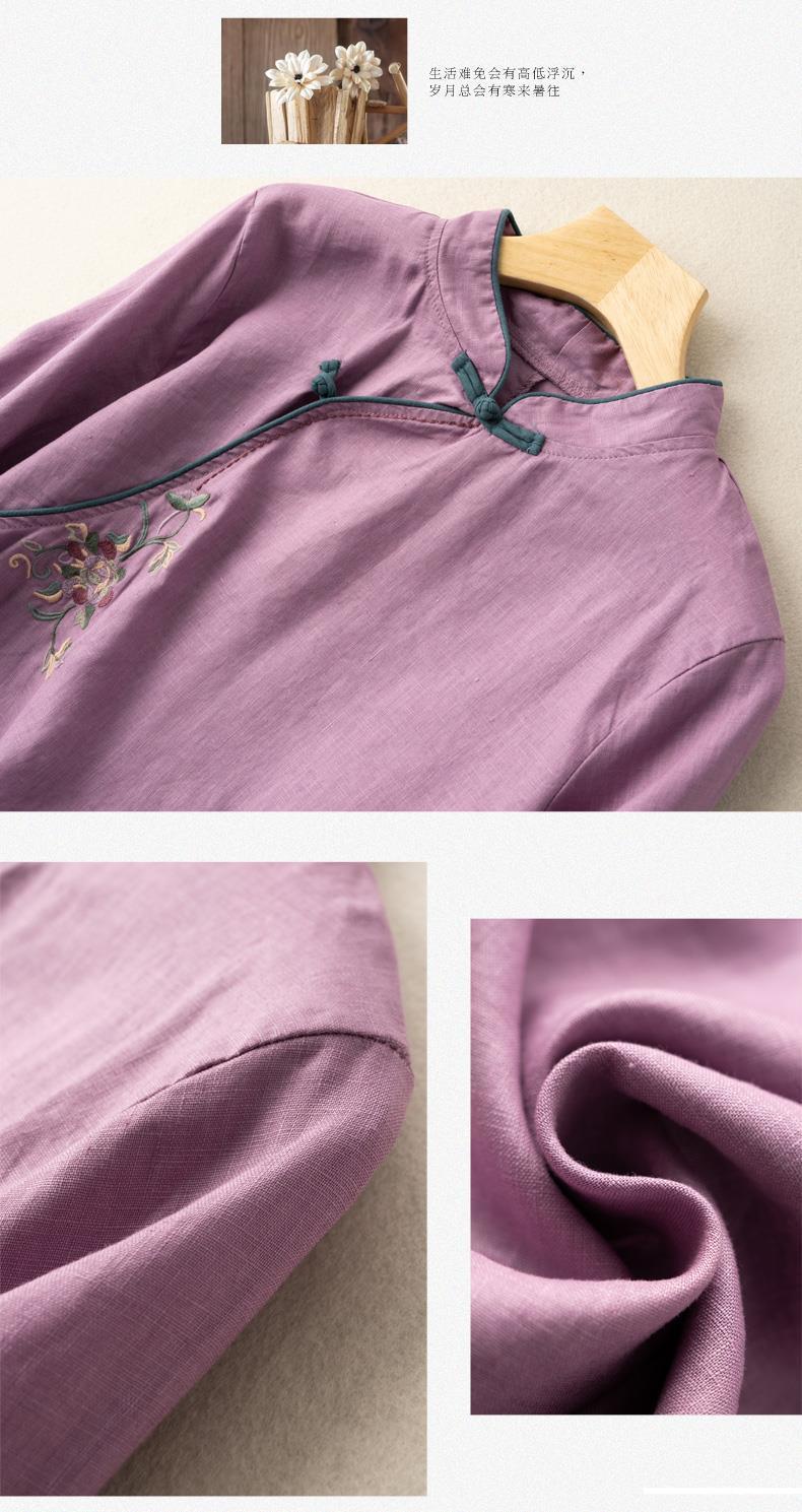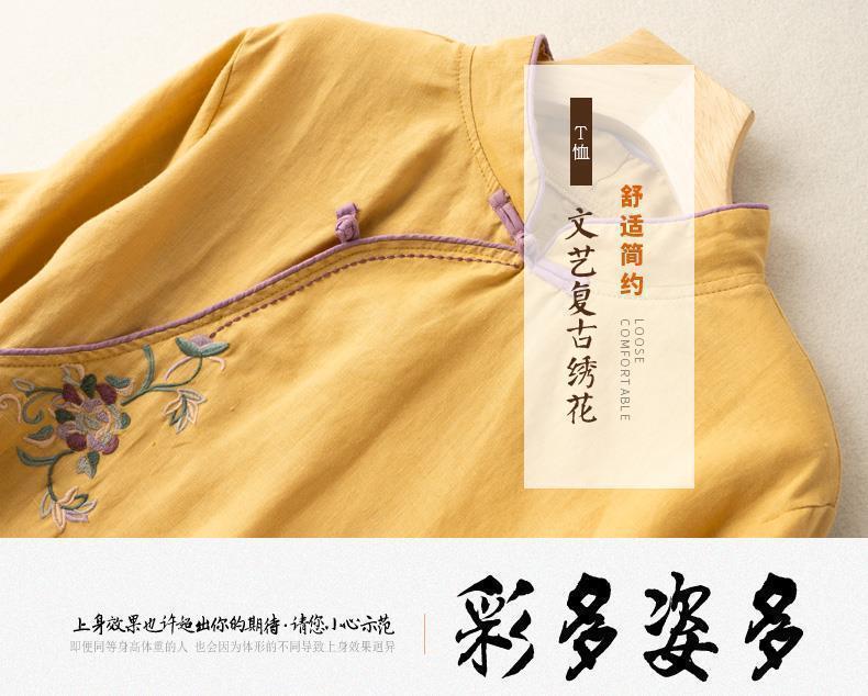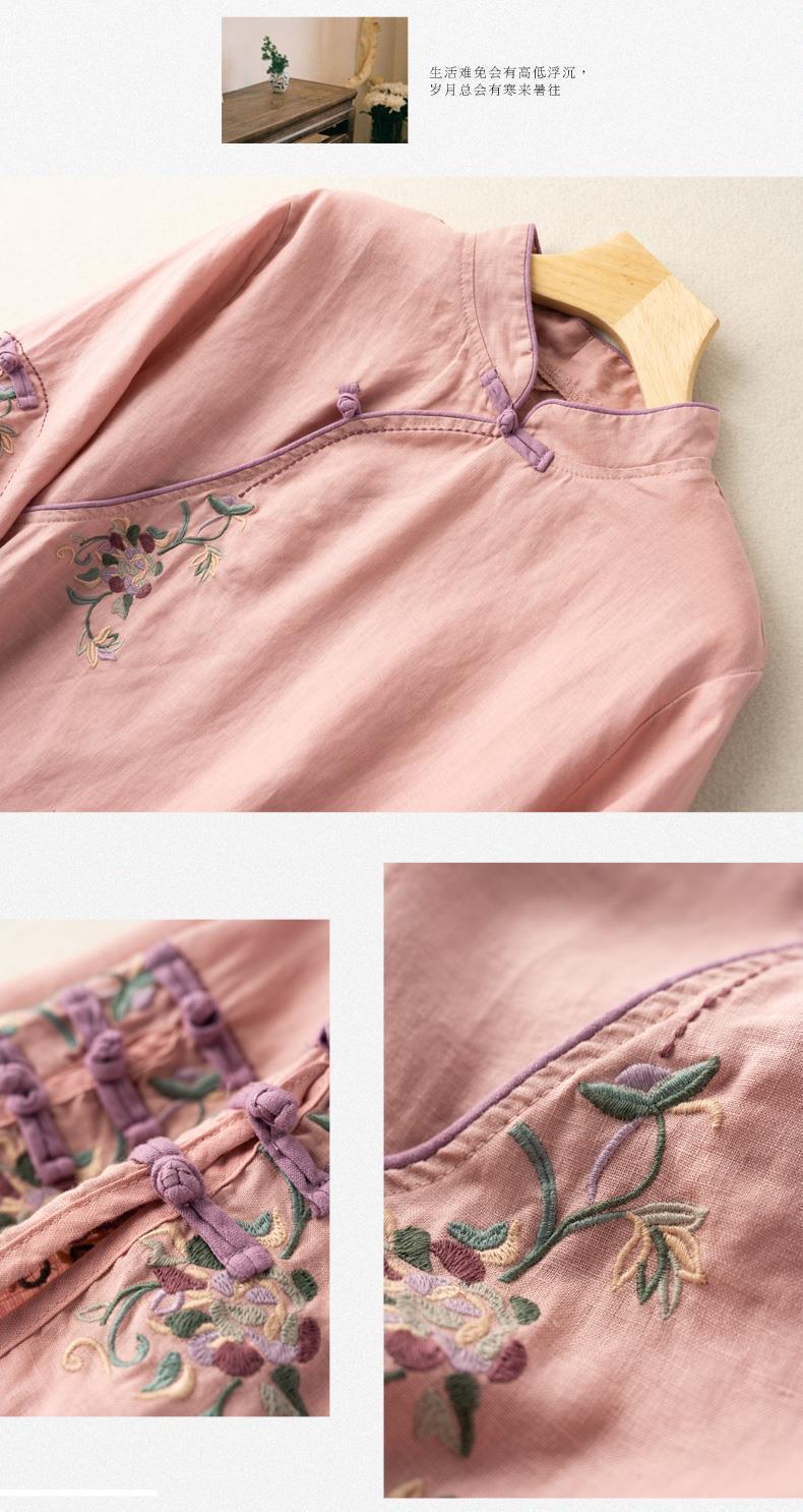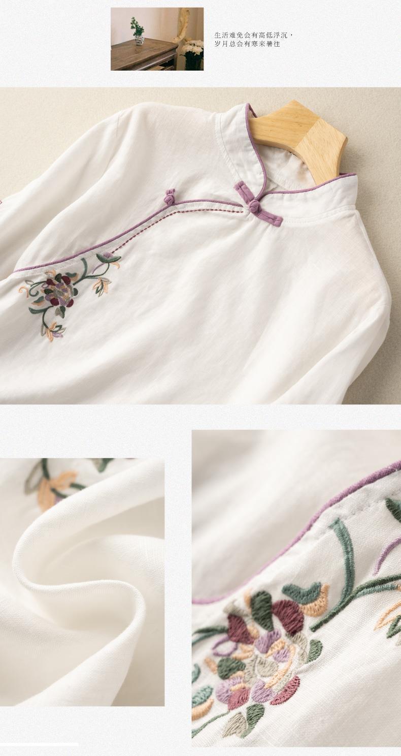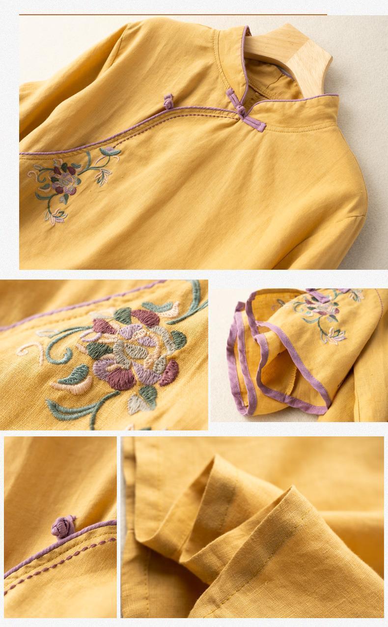 2025 새로운 중국 스타일 복고풍 면화 및 린넨 셔츠 여성 봄, 여름 중국 스타일 스탠드 칼라 버튼 탑 비스듬한 칼라 수 놓은 차 옷스토어 가기