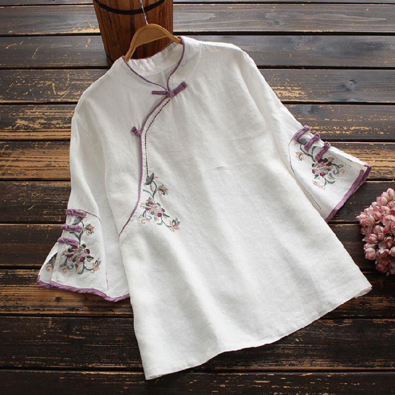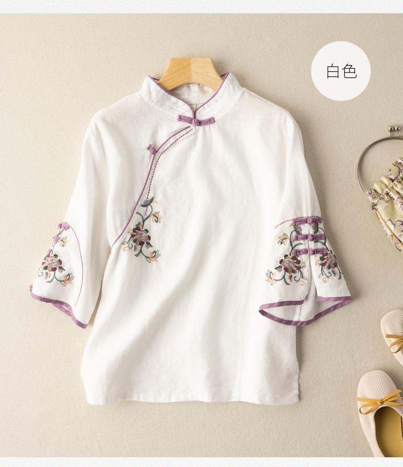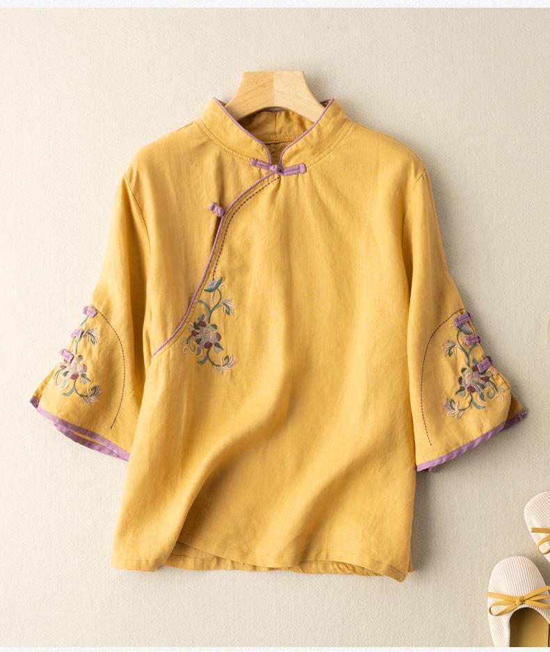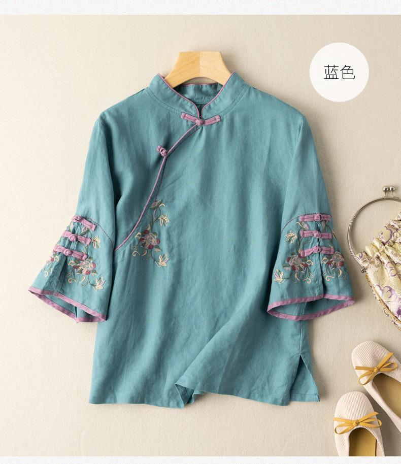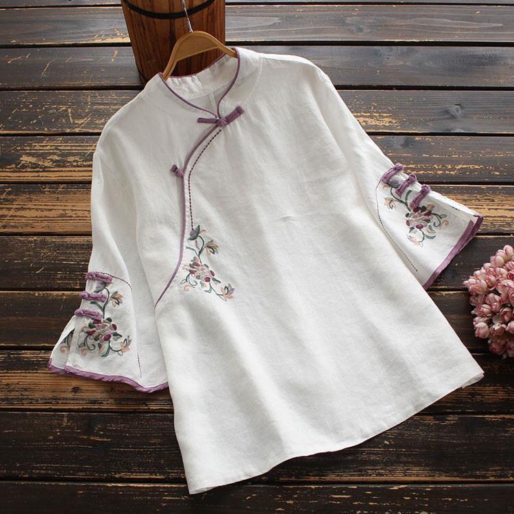 2025 새로운 중국 스타일 복고풍 면화 및 린넨 셔츠 여성 봄, 여름 중국 스타일 스탠드 칼라 버튼 탑 비스듬한 칼라 수 놓은 차 옷
