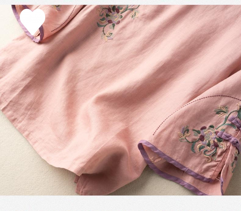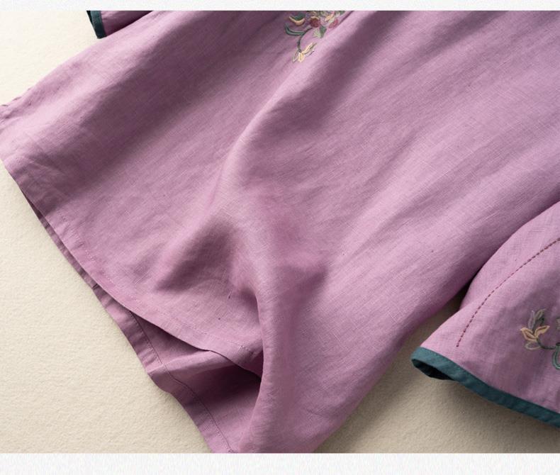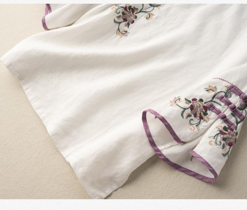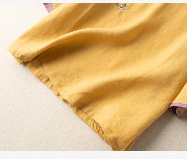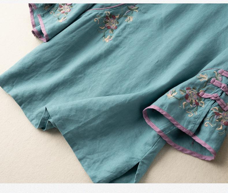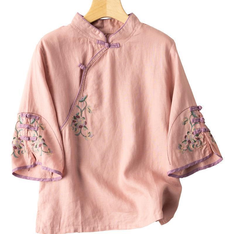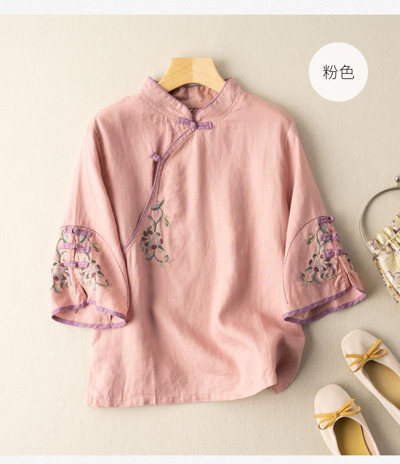 2025 새로운 중국 스타일 복고풍 면화 및 린넨 셔츠 여성 봄, 여름 중국 스타일 스탠드 칼라 버튼 탑 비스듬한 칼라 수 놓은 차 옷