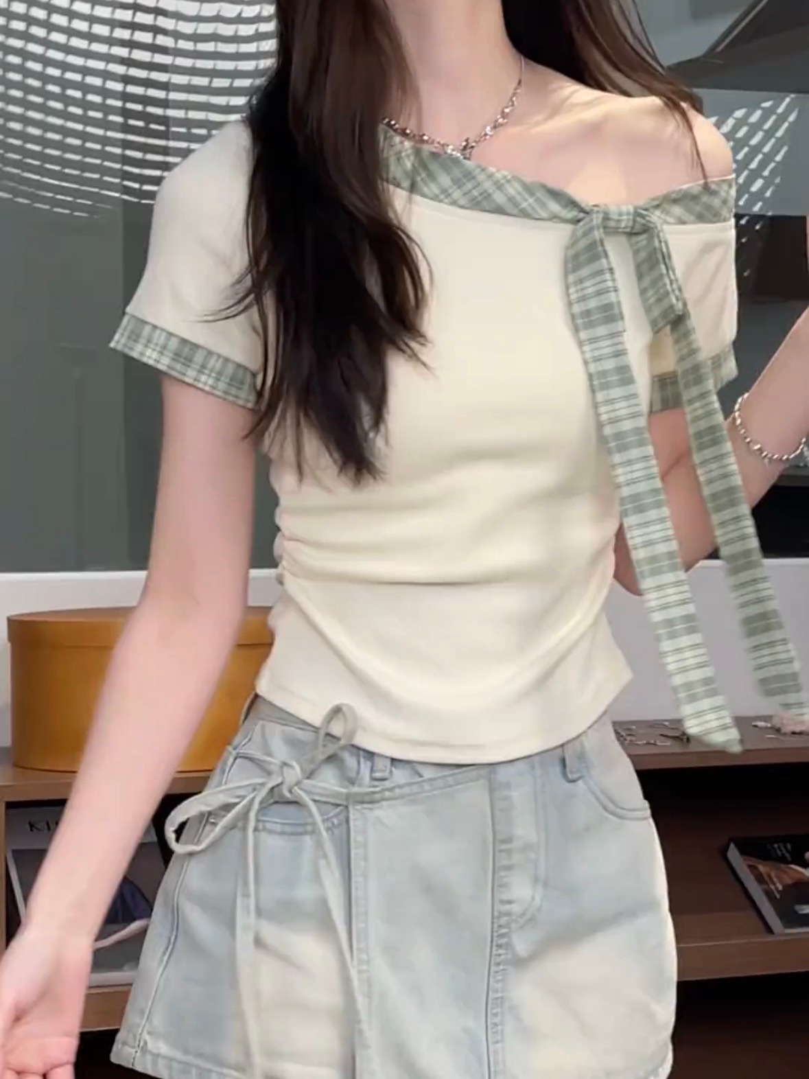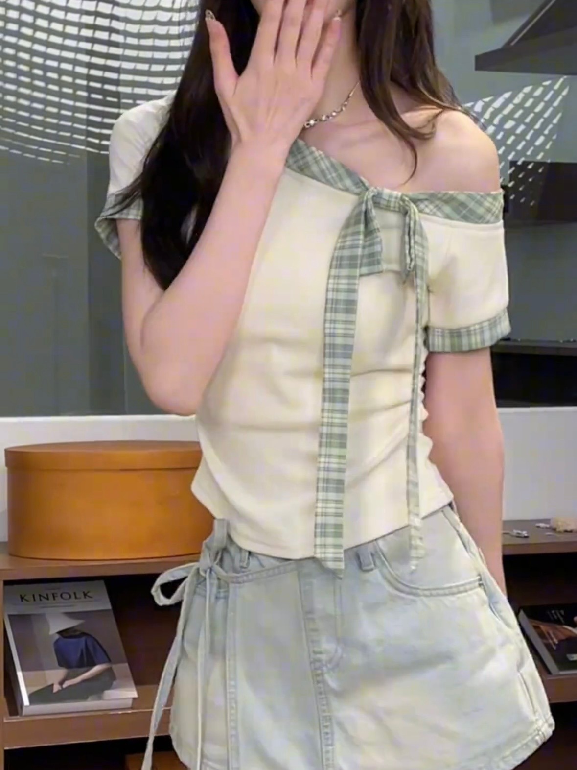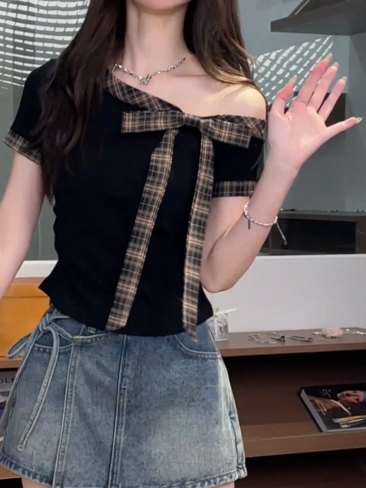 달콤한 스타일 스트라이프 짧은 소매 티셔츠 여성의 여름 새로운 활 티셔츠 슬림 오픈 숄더 디자인 센스 탑 도매스토어 가기