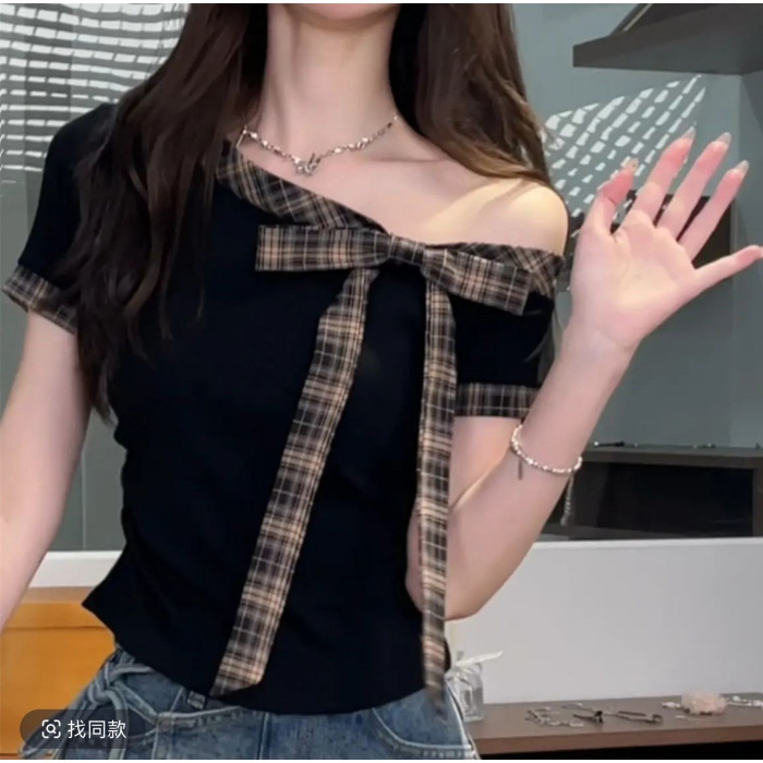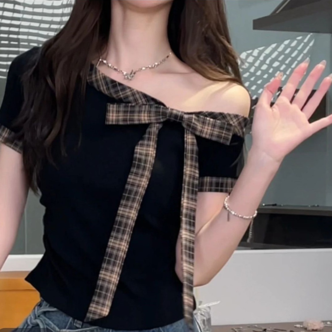 달콤한 스타일 스트라이프 짧은 소매 티셔츠 여성의 여름 새로운 활 티셔츠 슬림 오픈 숄더 디자인 센스 탑 도매