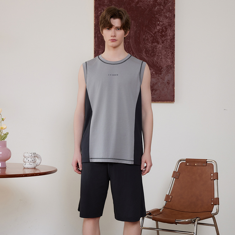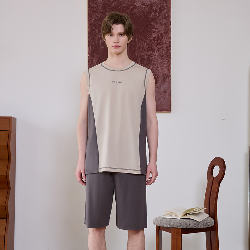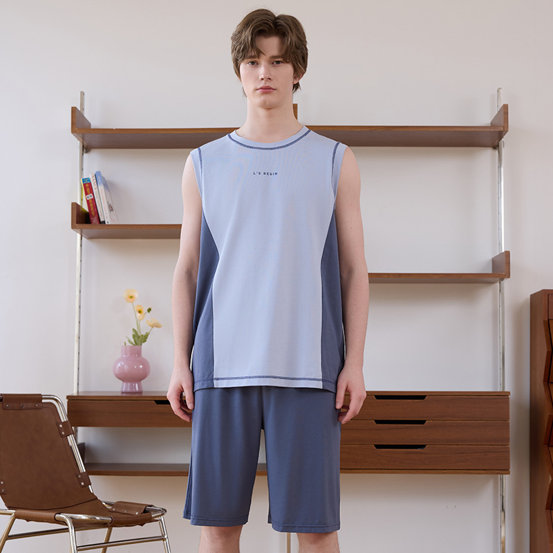 여름 커플 스트레치 렌징 모달 코튼 패션 스포츠 웨어러블 스플라이스 조끼 반바지 남성용 홈웨어