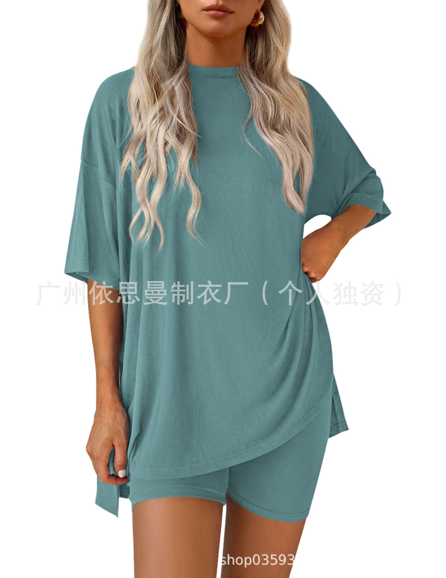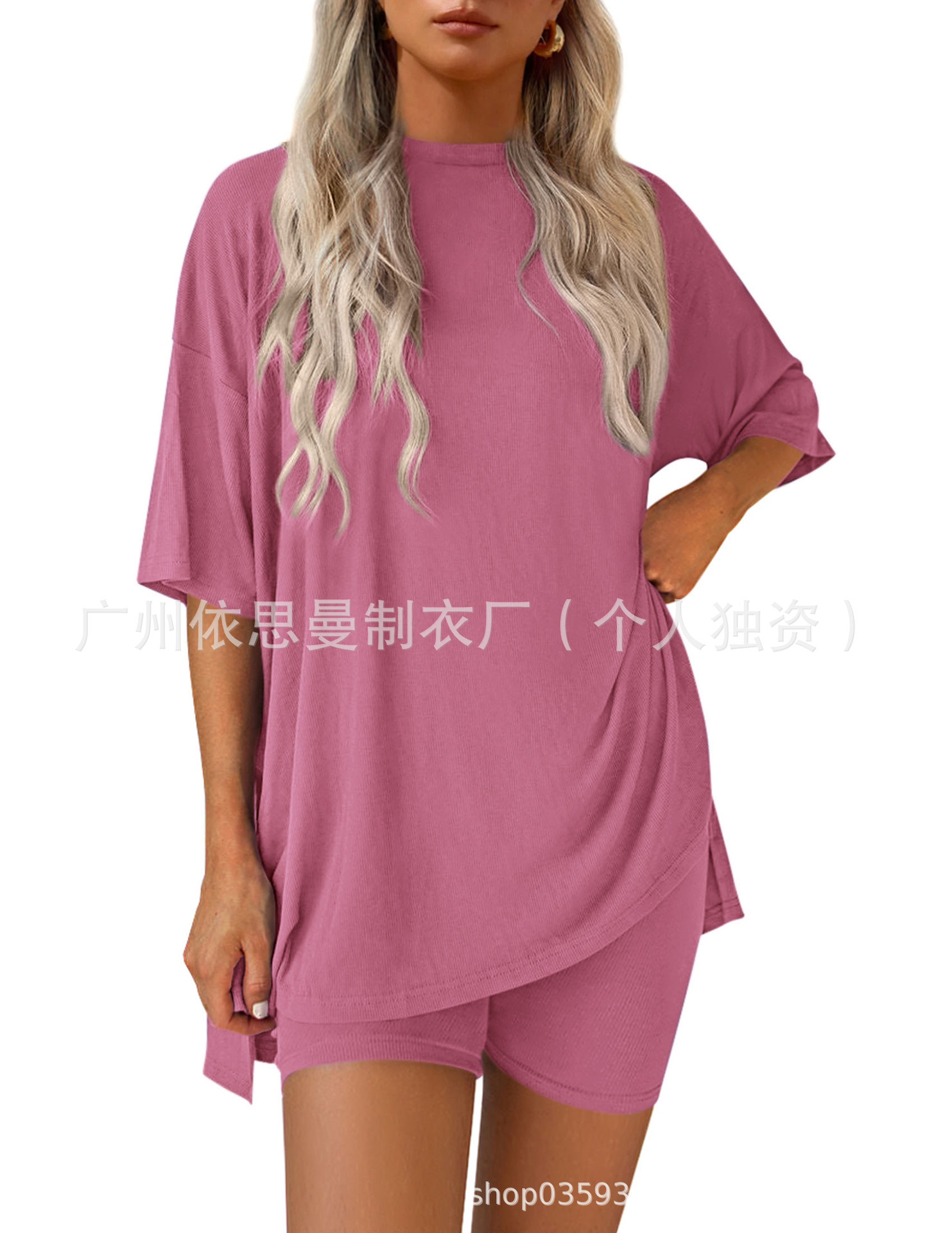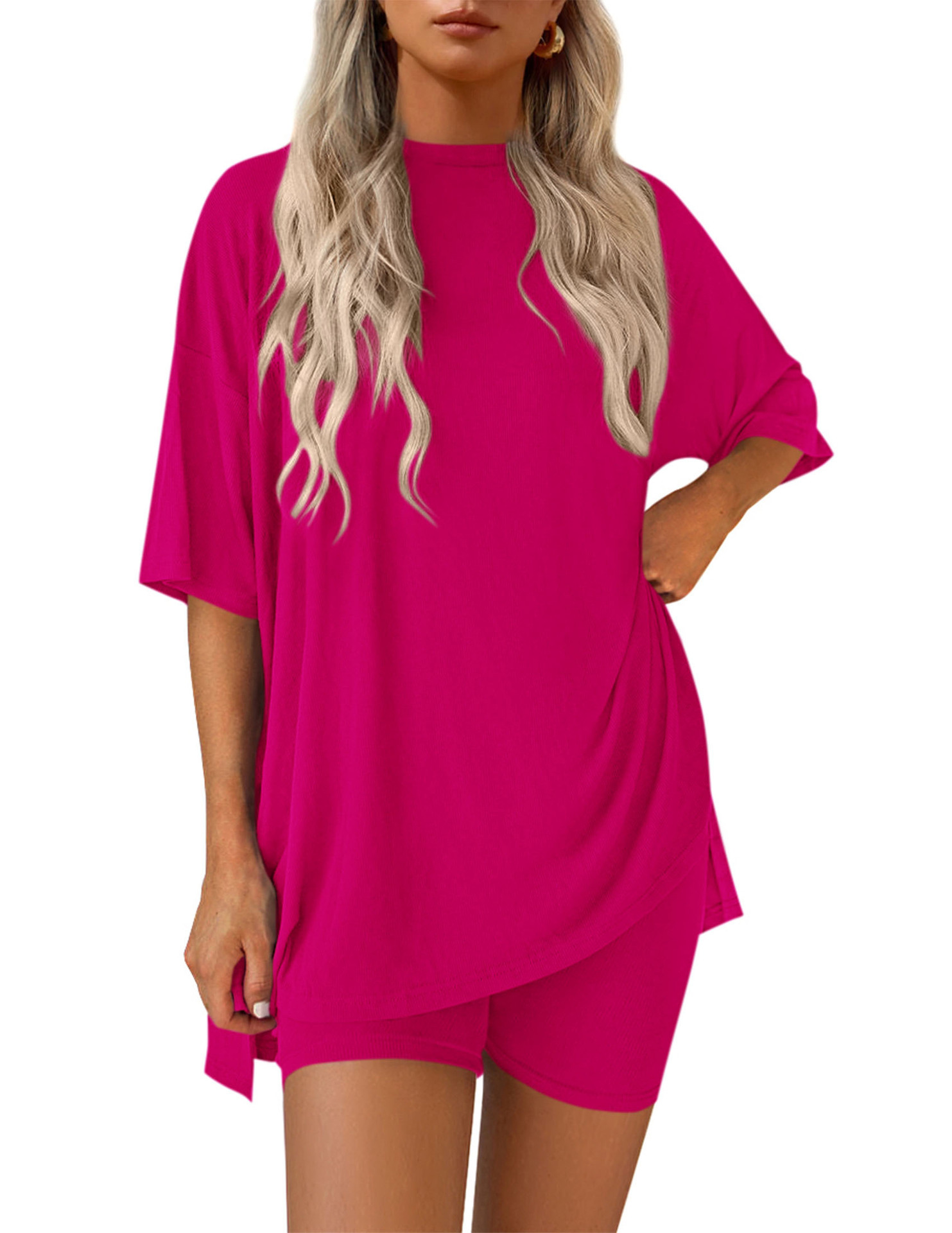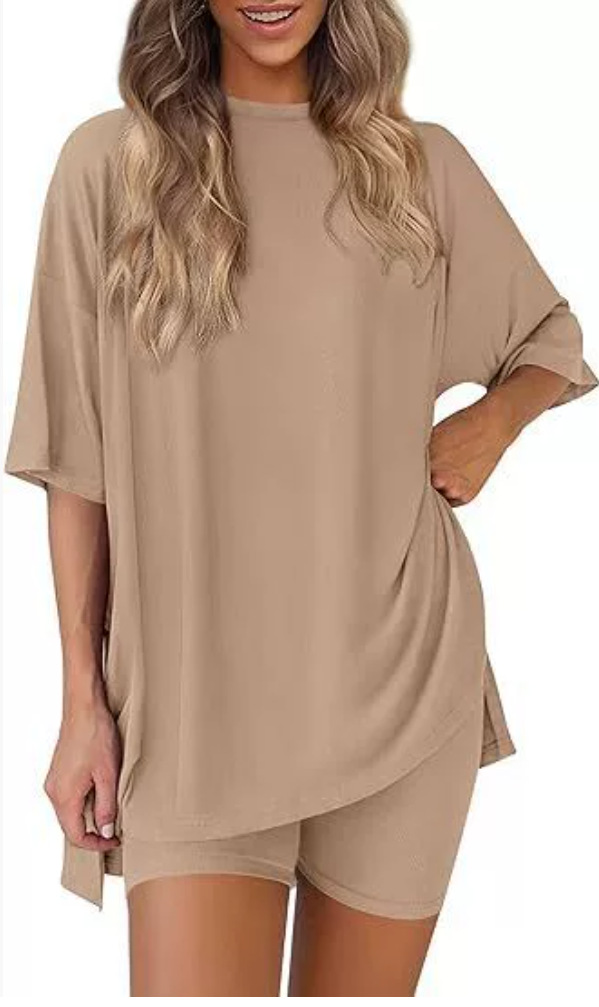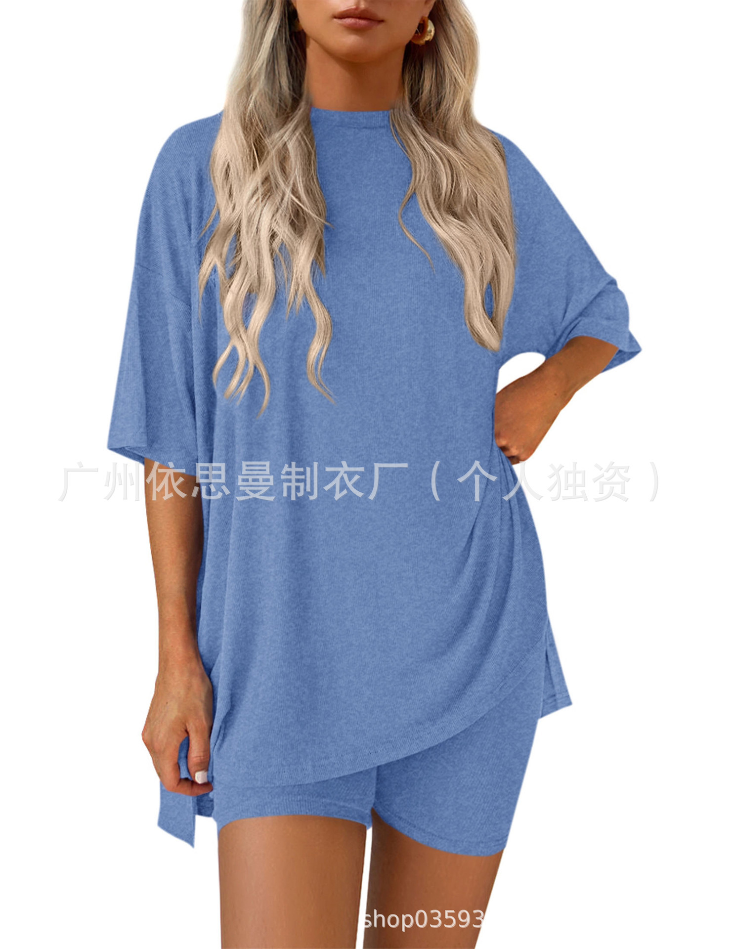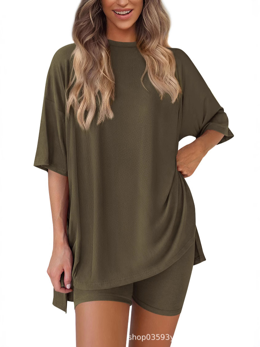 2025 봄과 여름 유럽과 미국 국경 아마존 새로운 느슨한 패션 단색 캐주얼 짧은 소매 반바지 투피스 세트스토어 가기