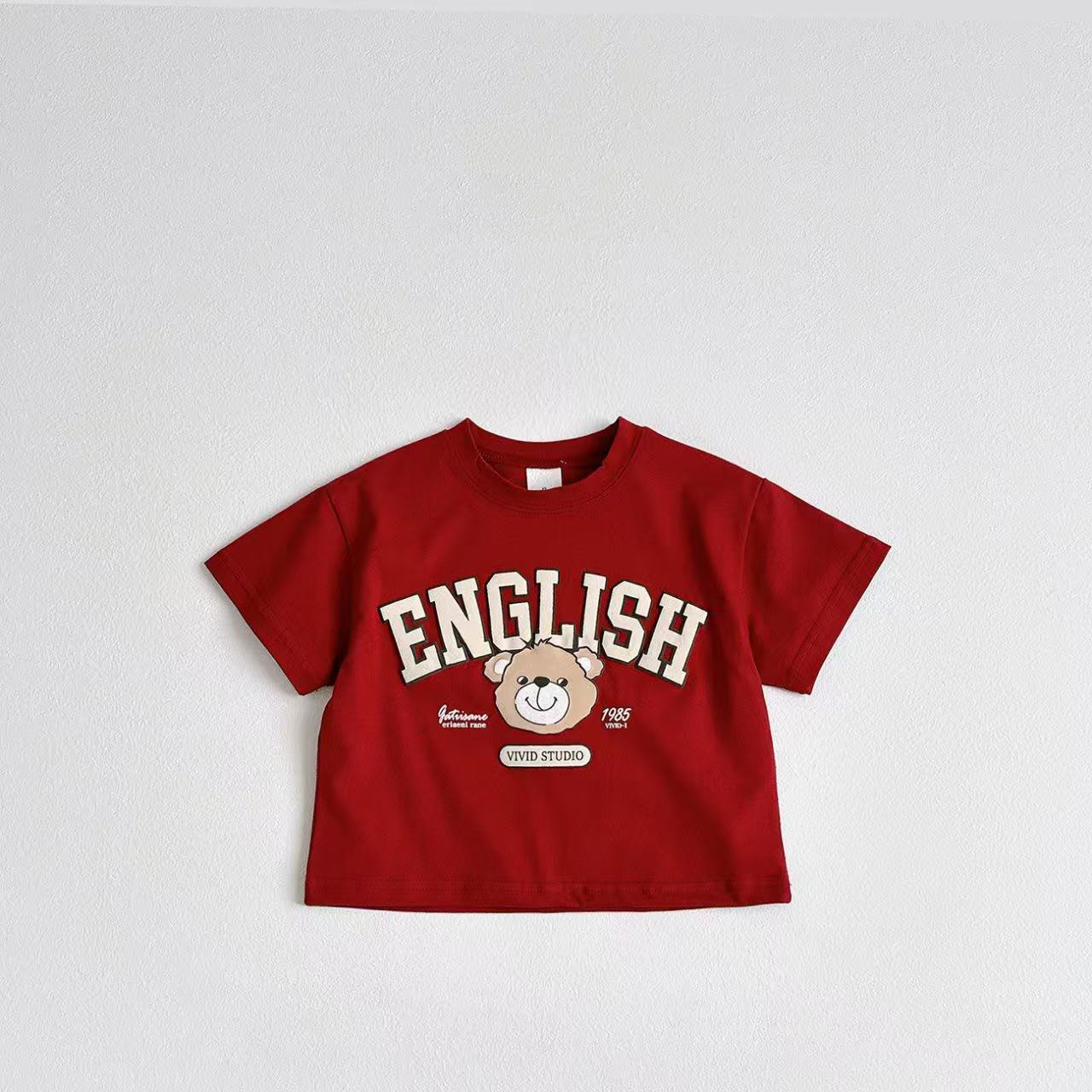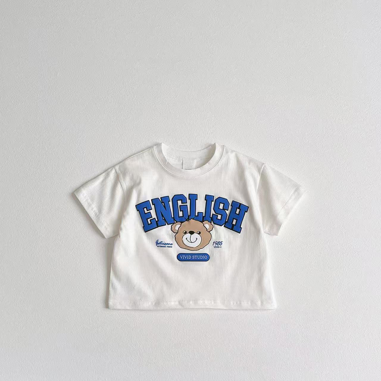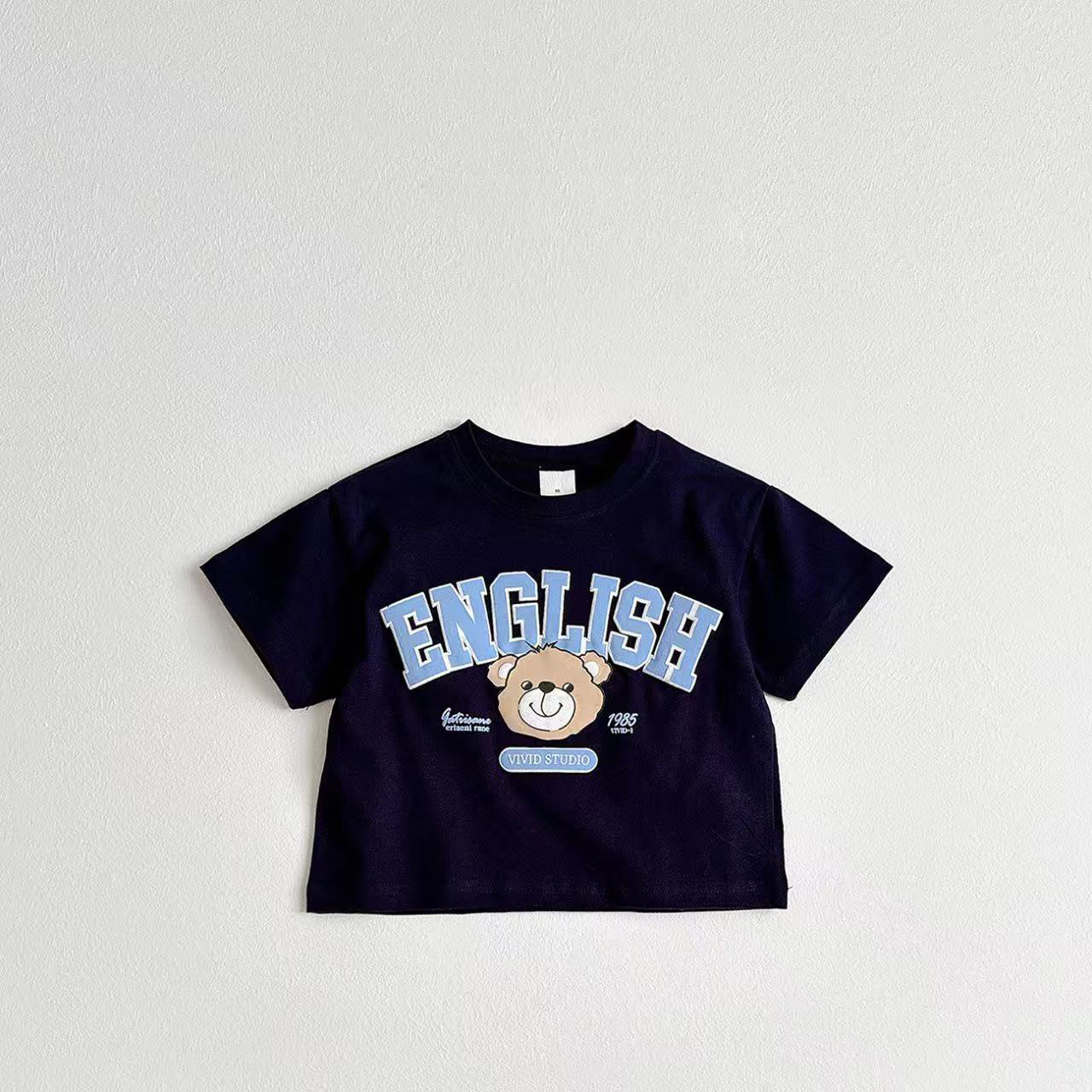 한국 스타일 아동복 대학 곰 어린이 티셔츠 만화 편지 귀여운 아기 반팔 여름 어린이 티셔츠 탑