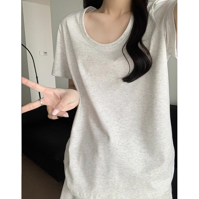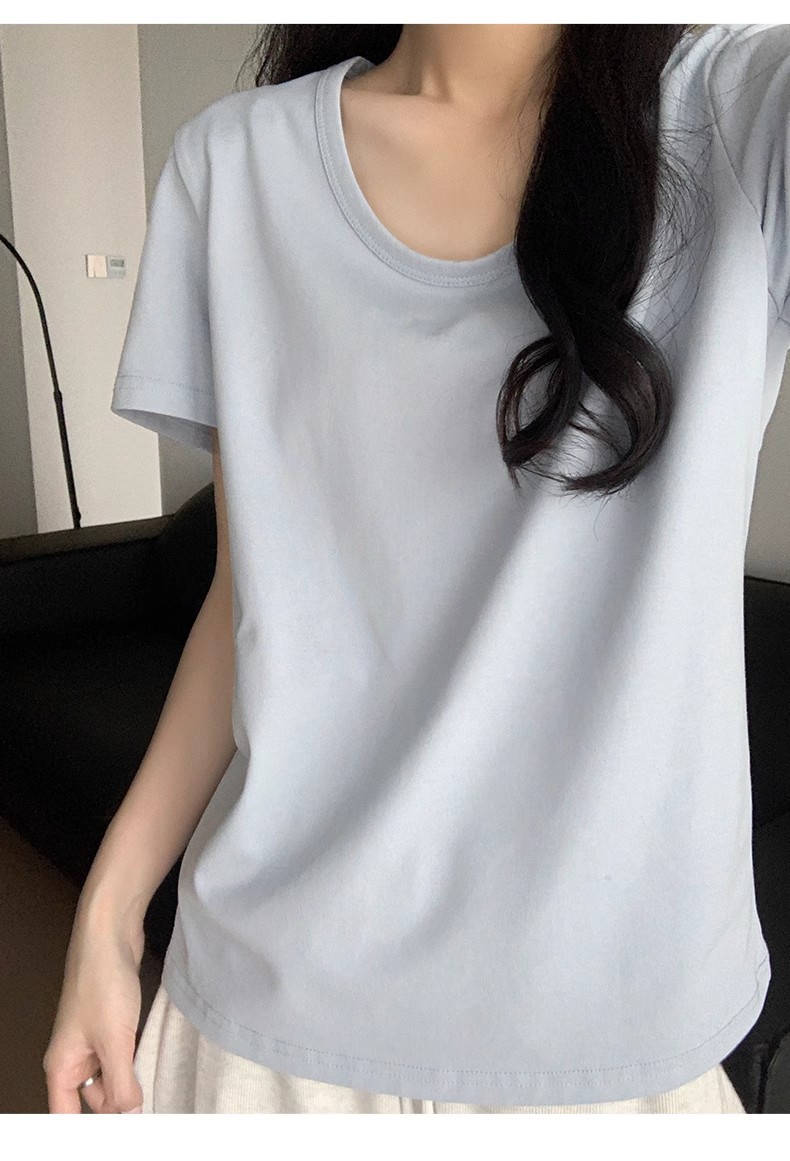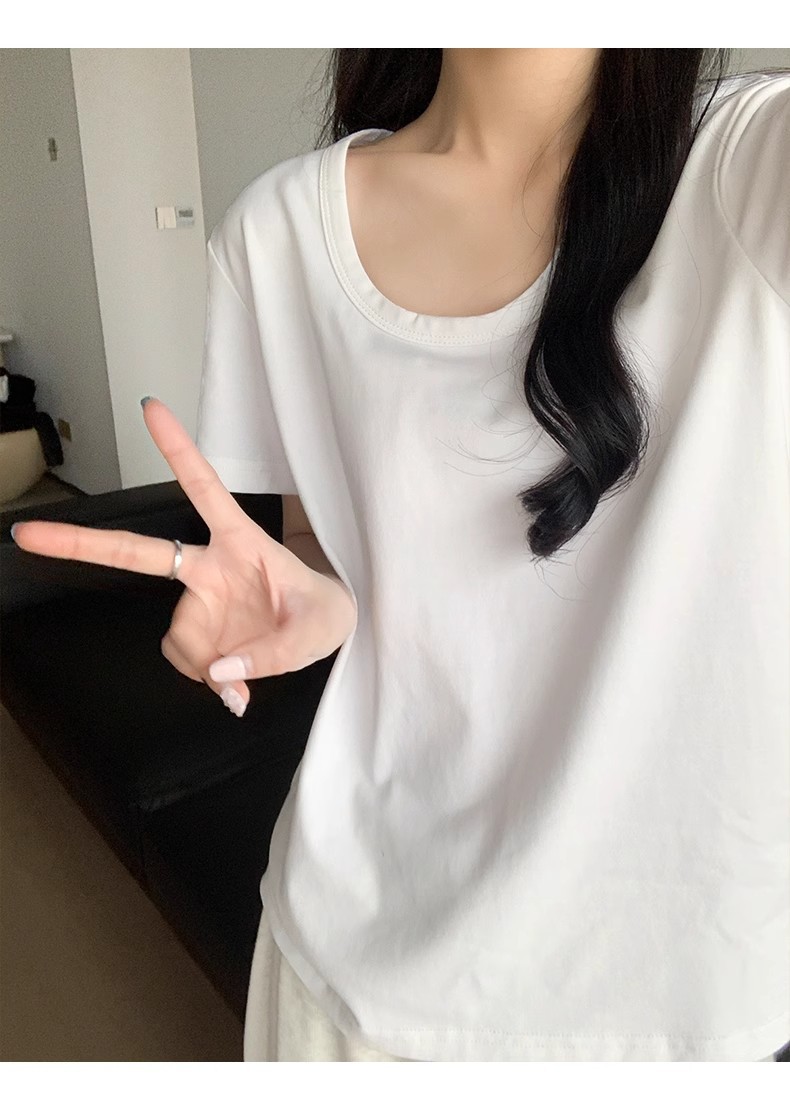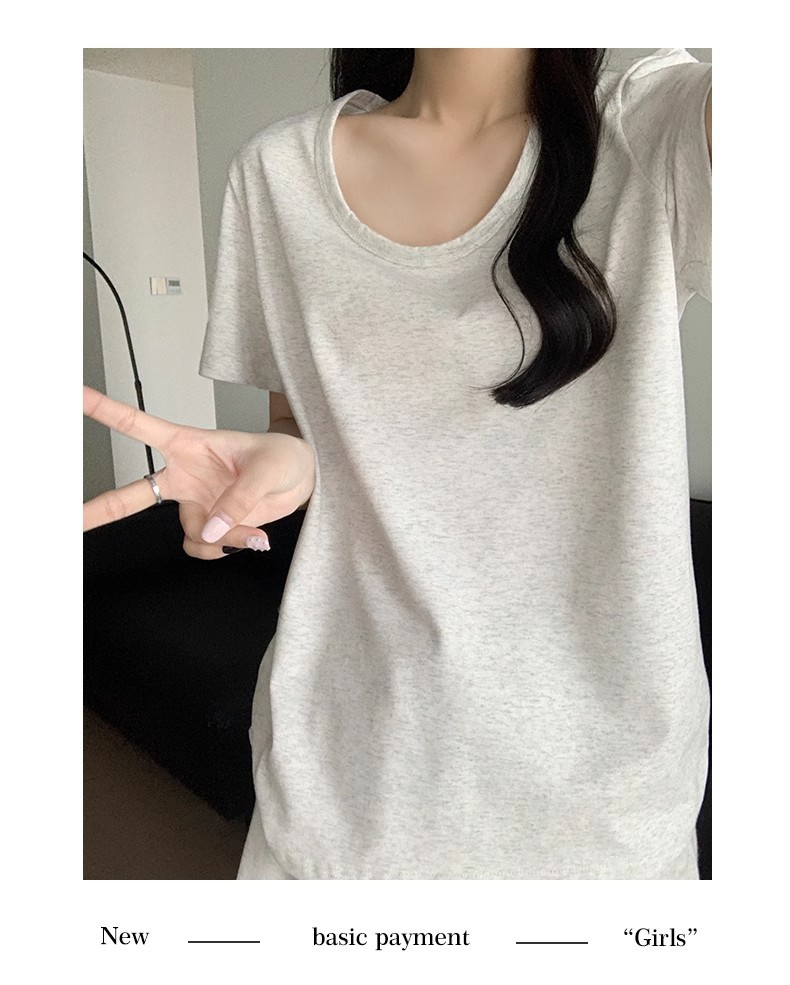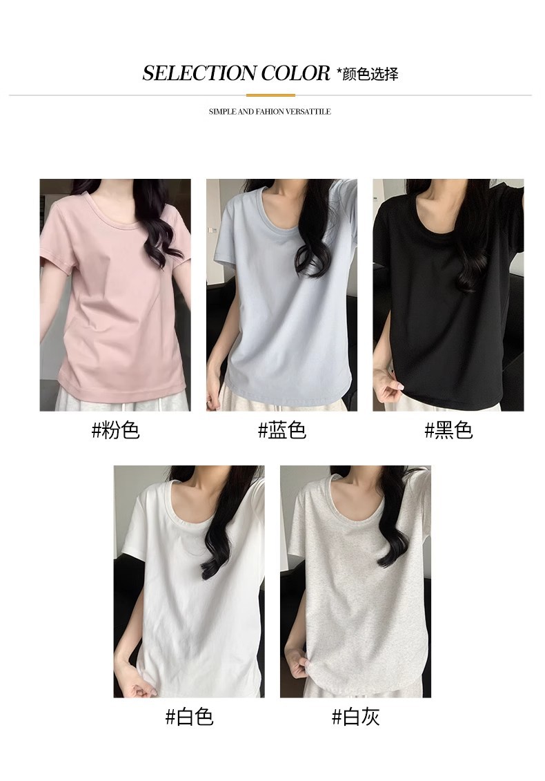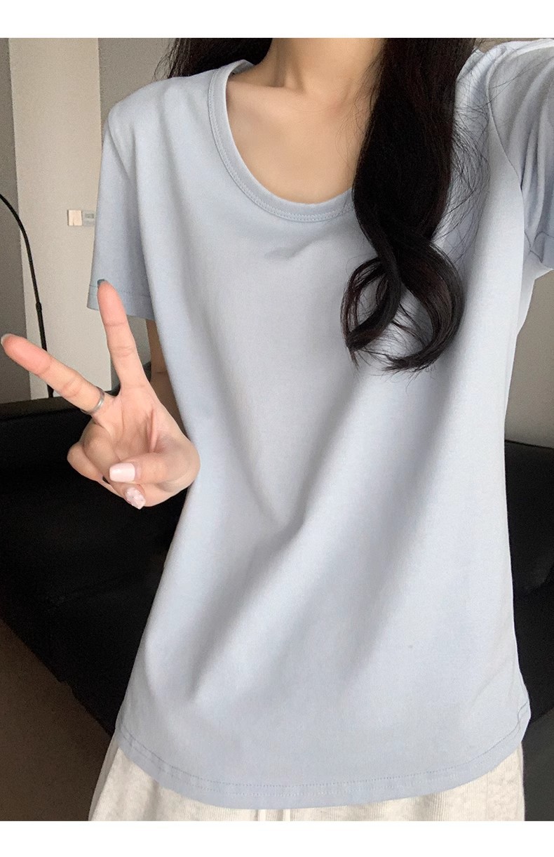 핑크색 U넥 루즈핏 숏슬리브 티셔츠 여성용 여름 2026 신상 레이지 캐주얼 솔리드 컬러 반팔 티셔츠 탑스토어 가기
