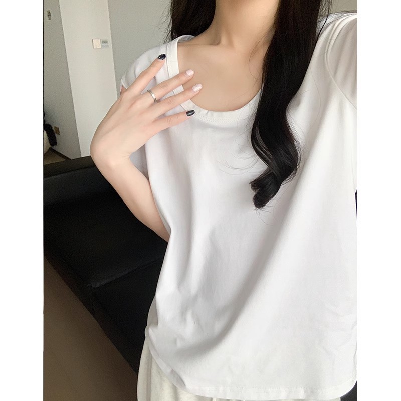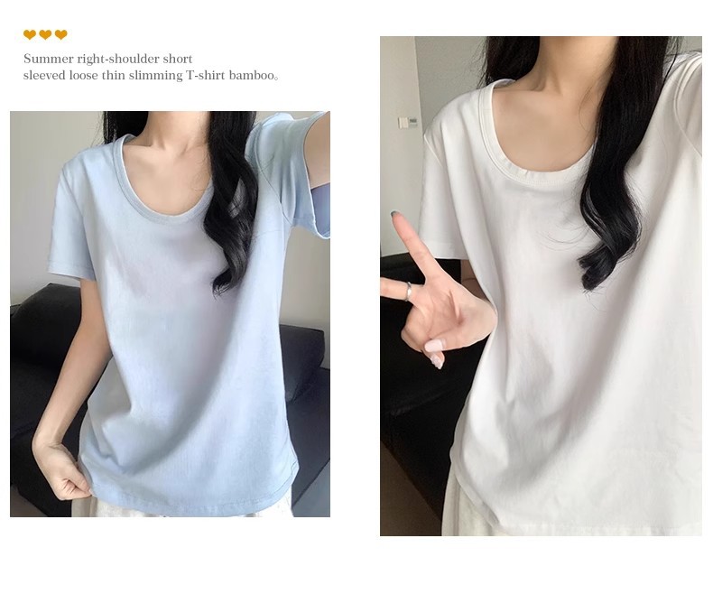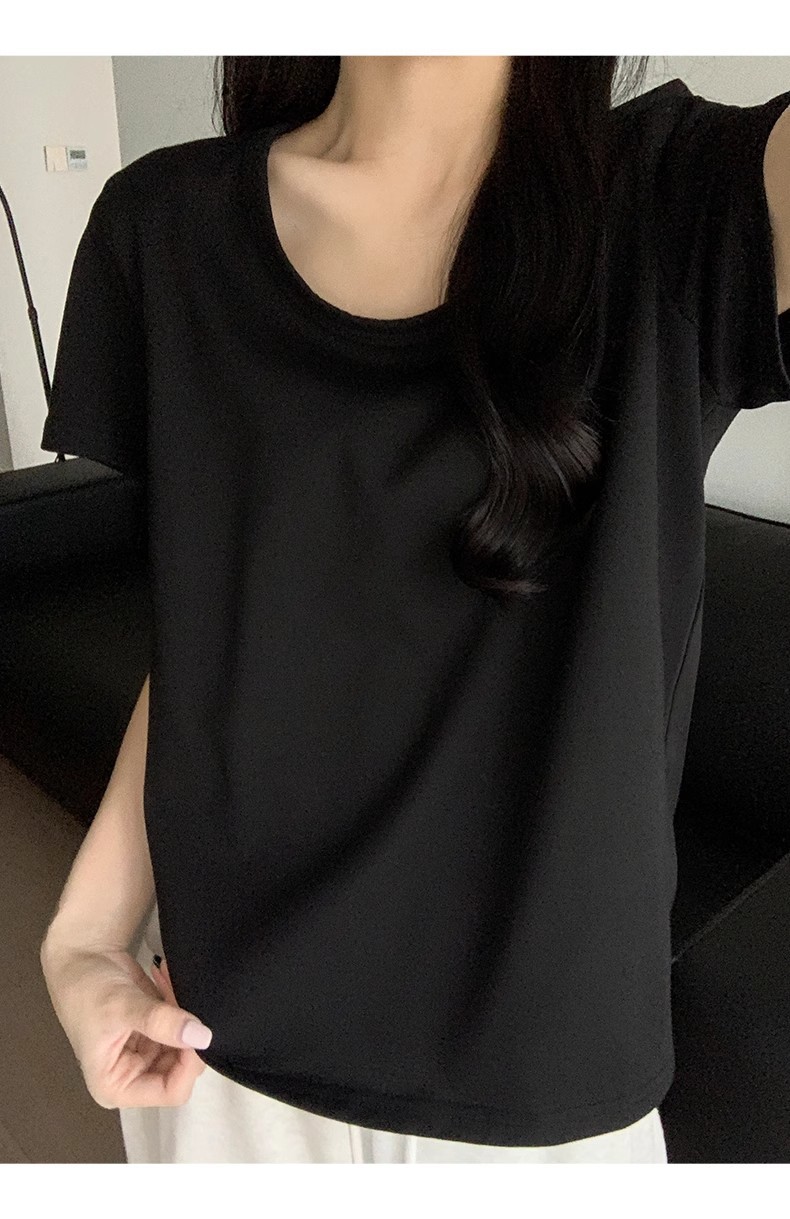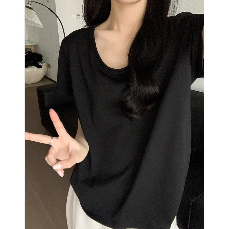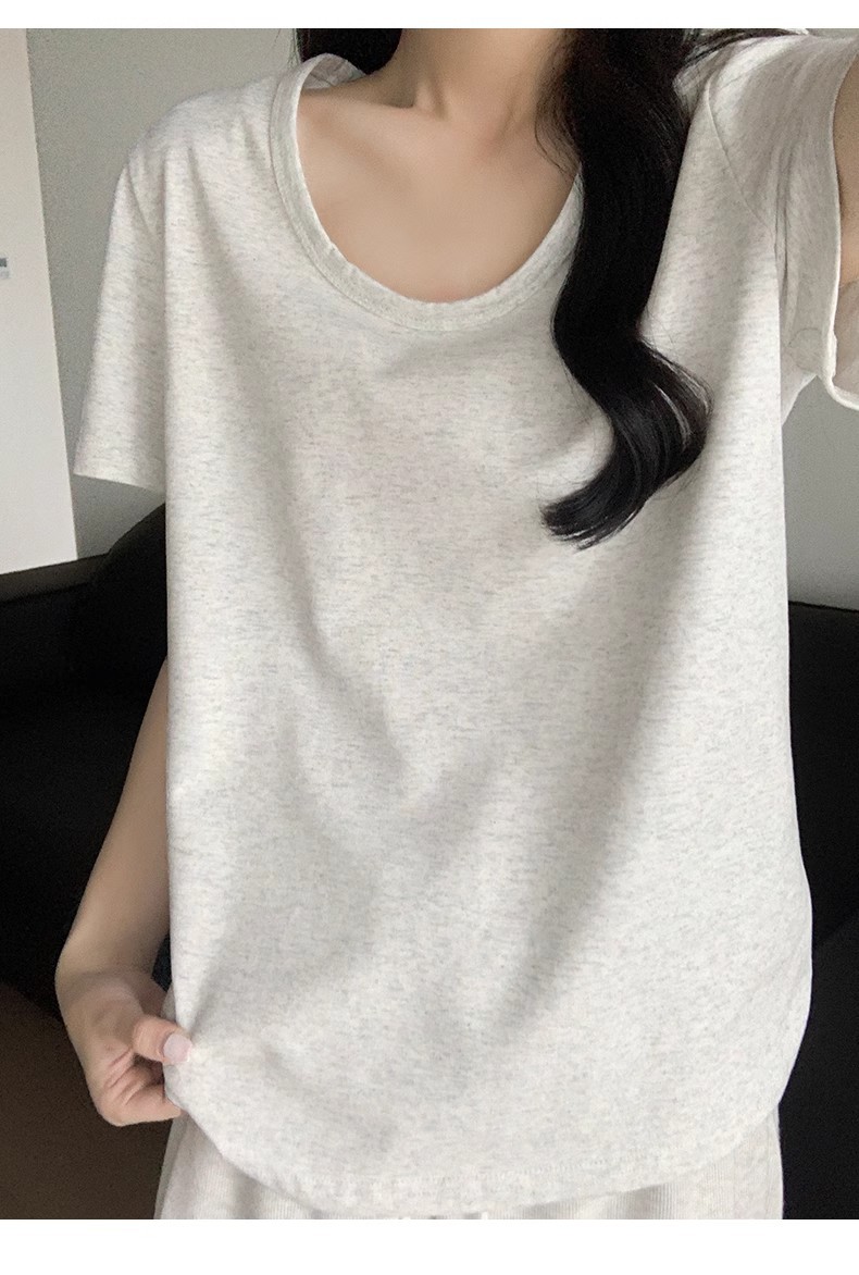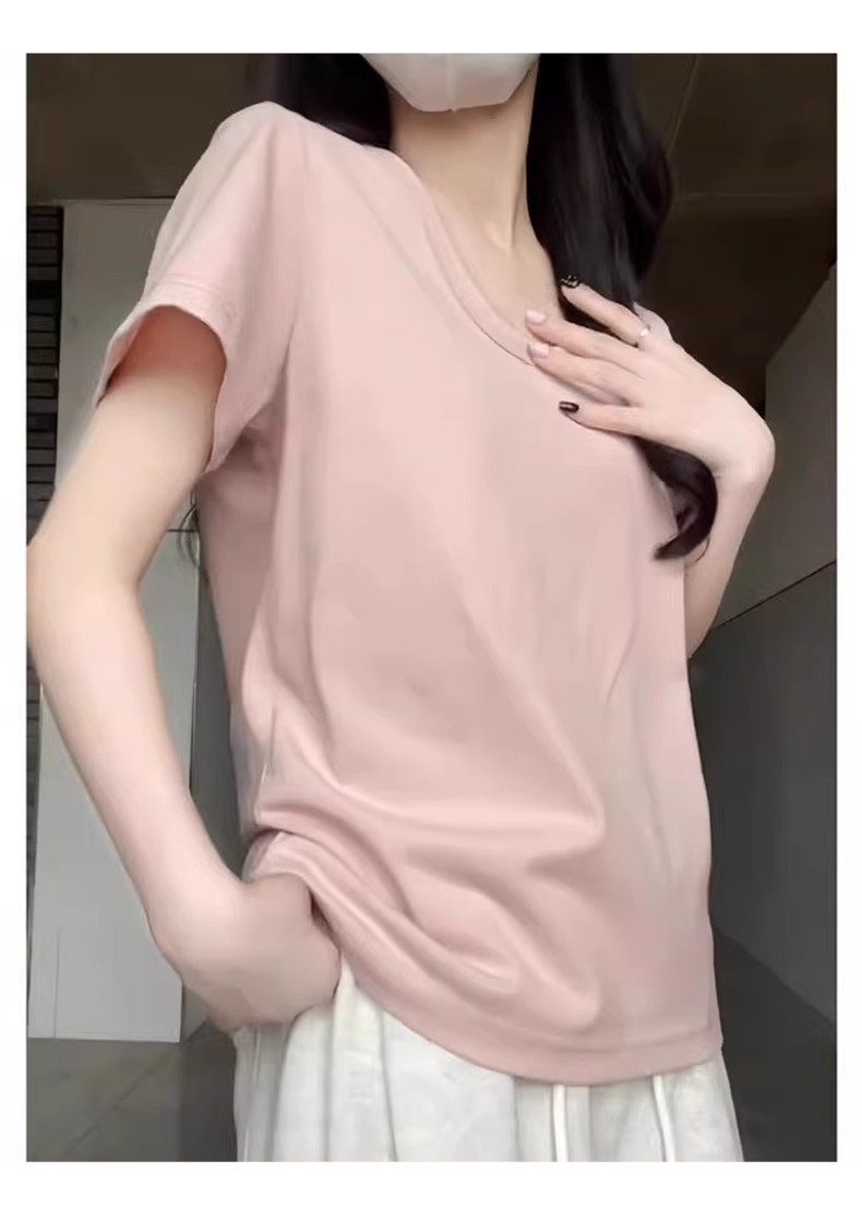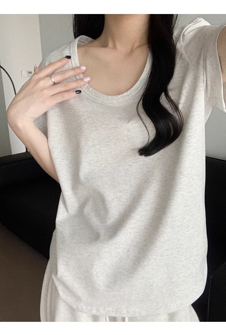 핑크색 U넥 루즈핏 숏슬리브 티셔츠 여성용 여름 2026 신상 레이지 캐주얼 솔리드 컬러 반팔 티셔츠 탑스토어 가기