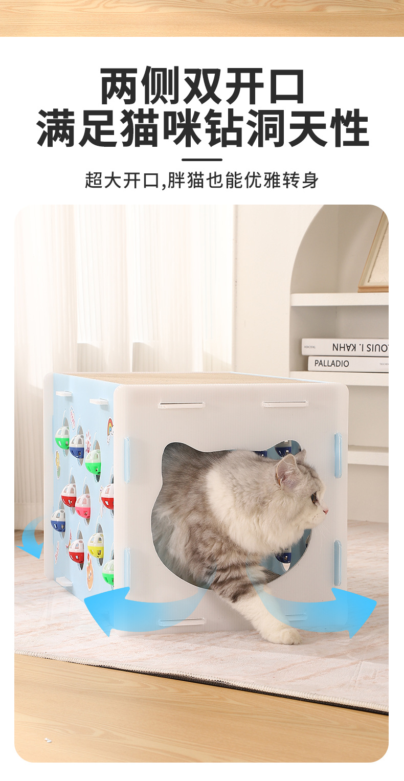 产品特点:两种颜色多一种选择,20个铃铛给猫咪玩耍,上下两层猫抓板,多猫家庭也可使用,尽情释放猫咪玩耍天性,两头可进出,猫咪更开心,使用环保pp材质,用着更放心,猫抓板铃铛均可替换,欢迎大家采购!