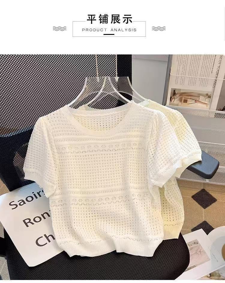 여성을위한 새로운 얼음 실크 스웨터 흰색 여름 라운드 넥 작은 향기 스타일 중공 반팔 셔츠 얇은 풀오버 탑 도매스토어 가기