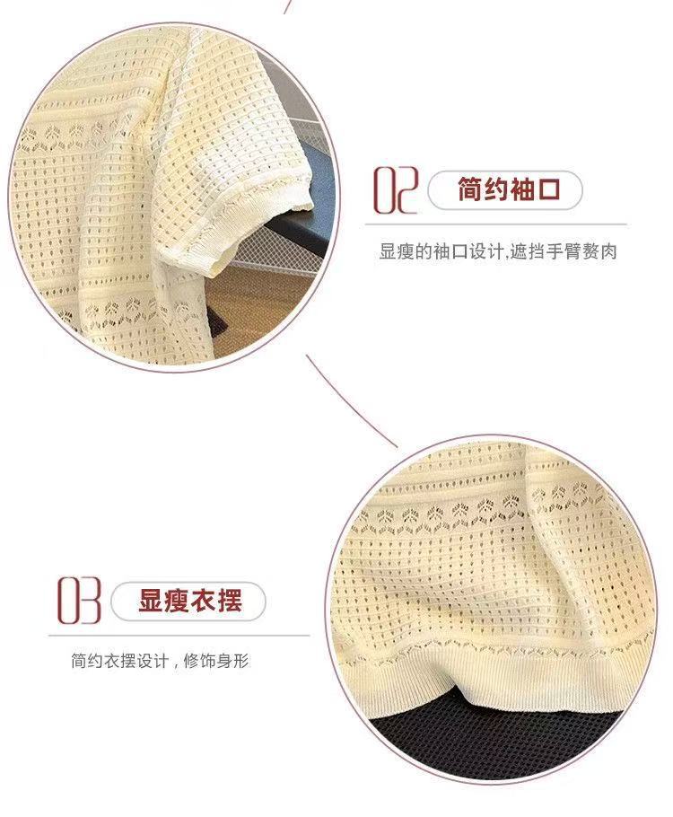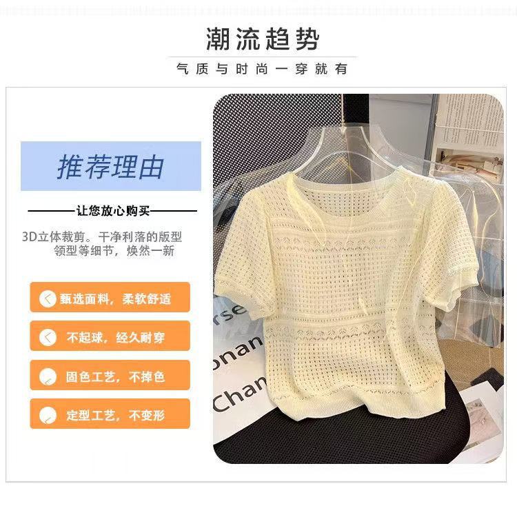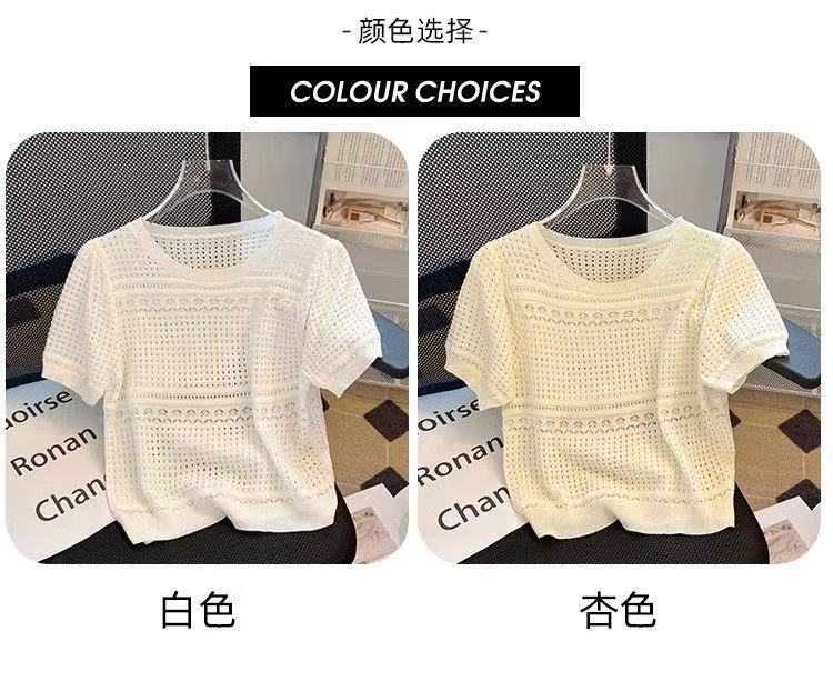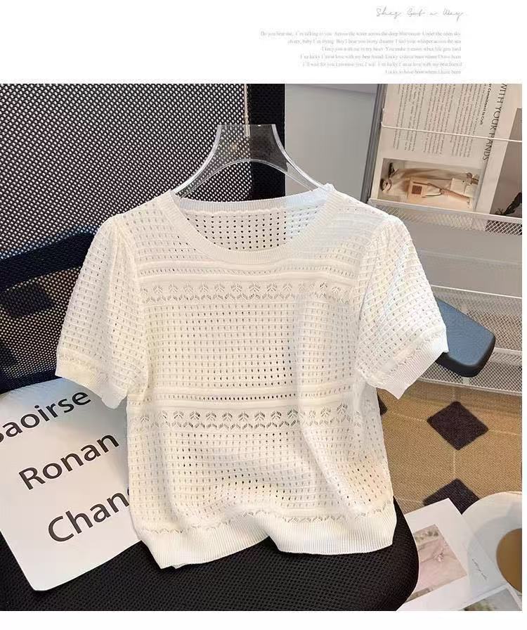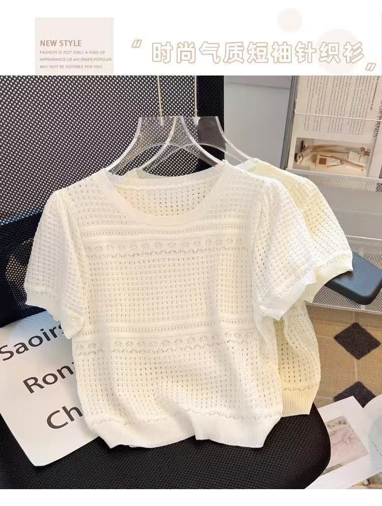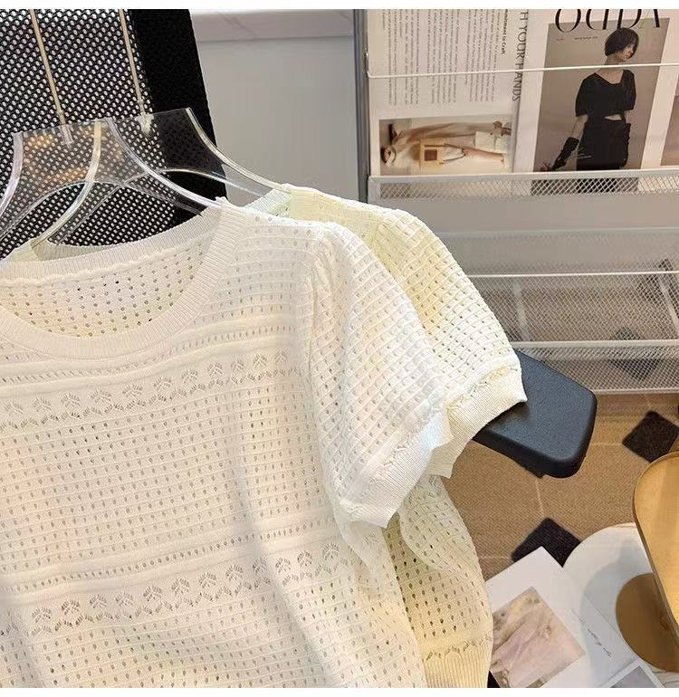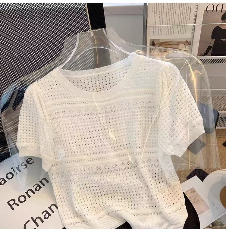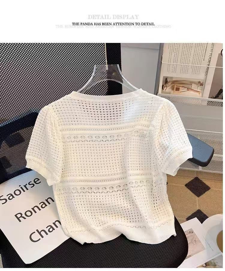 여성을위한 새로운 얼음 실크 스웨터 흰색 여름 라운드 넥 작은 향기 스타일 중공 반팔 셔츠 얇은 풀오버 탑 도매