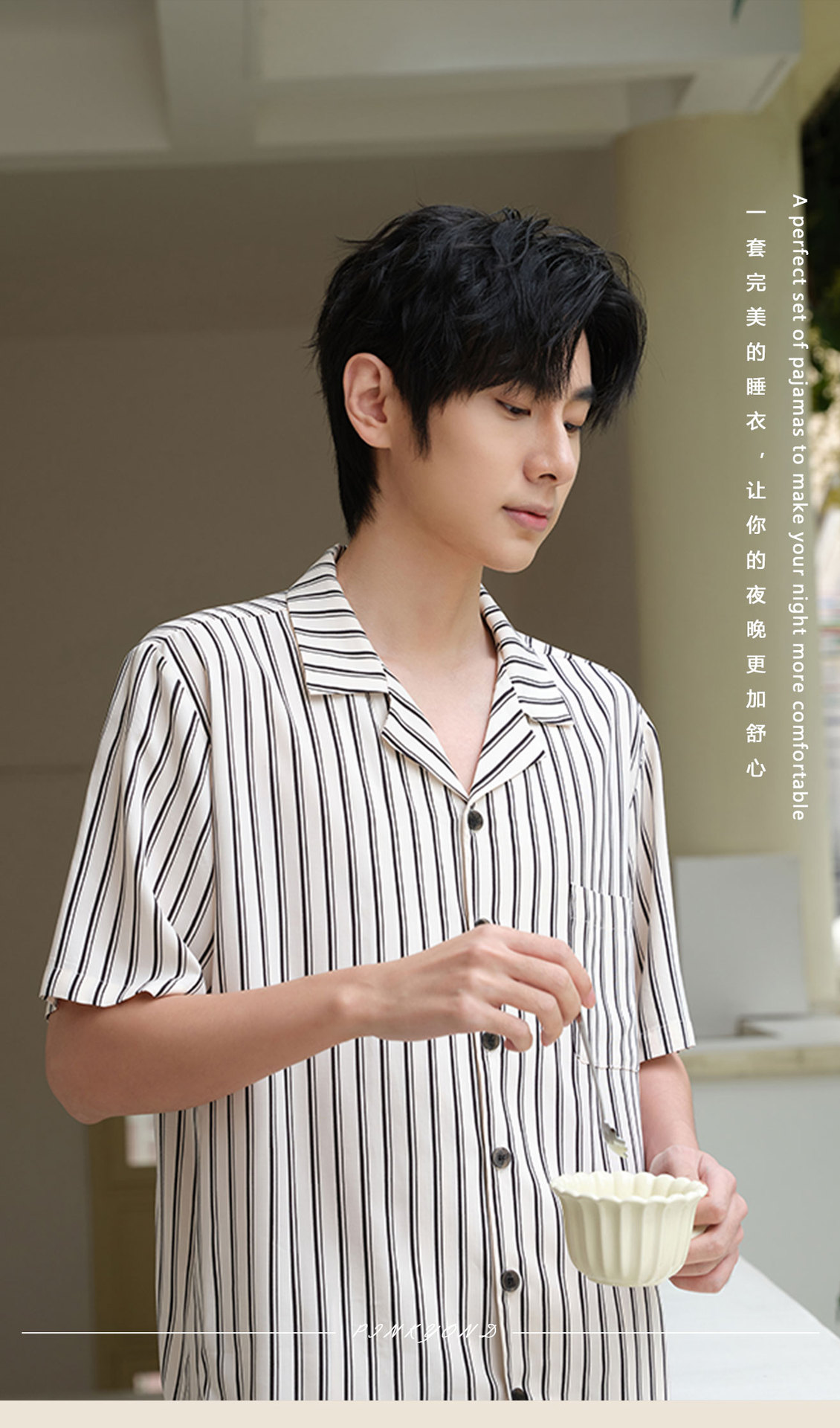 남성용 잠옷, 텐셀 리오셀 스트라이프 커플 가디건, 루즈하고 심플한 홈웨어 세트, 외부 착용 가능스토어 가기